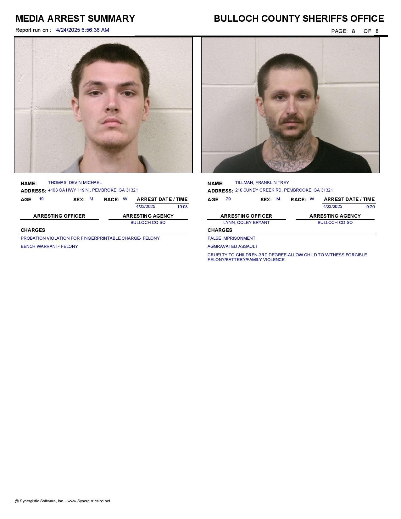 The Bulloch Co Jail Booking & Incident Report 04/24/25 details arrests from Bulloch Co., Statesboro, Brooklet, Portal, Register, and the Georgia State Patrol. Incident reports are from the Sheriff’s Office only.