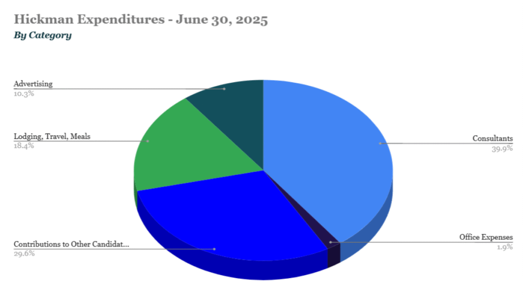 Hickman reported a total of $1,600 in contributions in the six month period, with $49,000.06 in expenditures. At the conclusion of the reporting period, Hickman showed $234,328.83 in his campaign account.