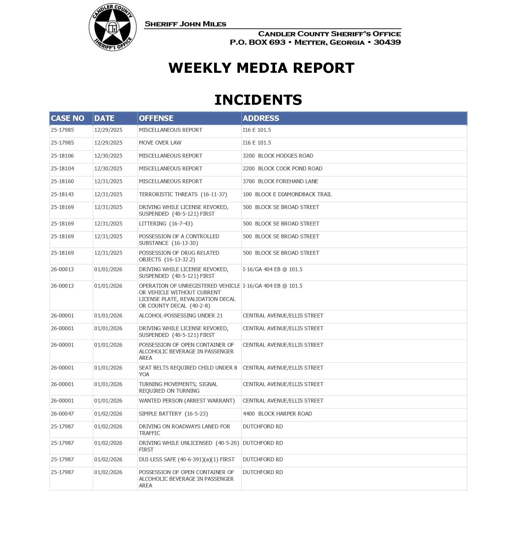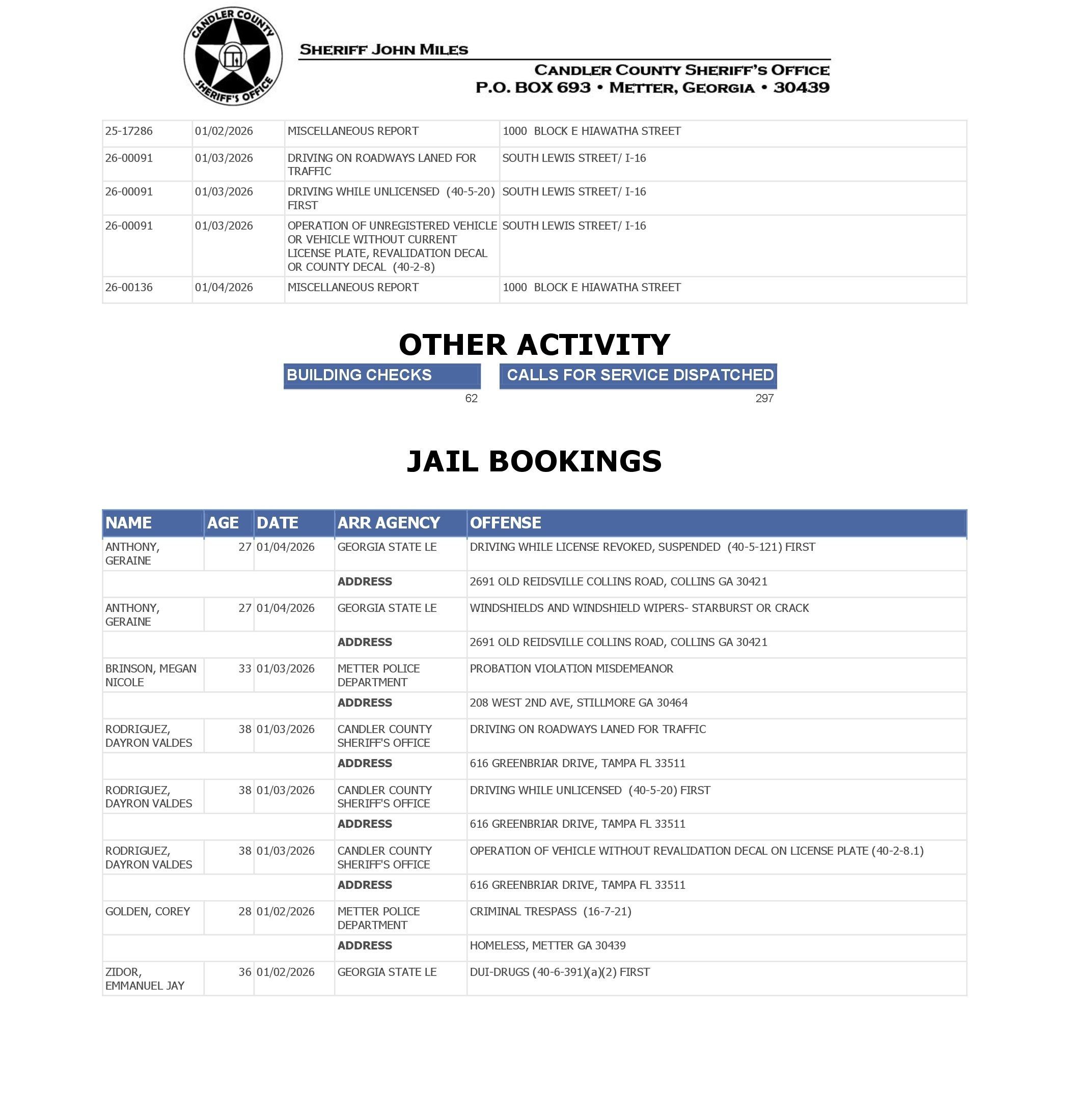 The Candler Co Jail Booking & Incident Report 01/05/26 details arrests from Metter, Candler County, and the Georgia State Patrol. Incident reports are from the Sheriff’s Office only.