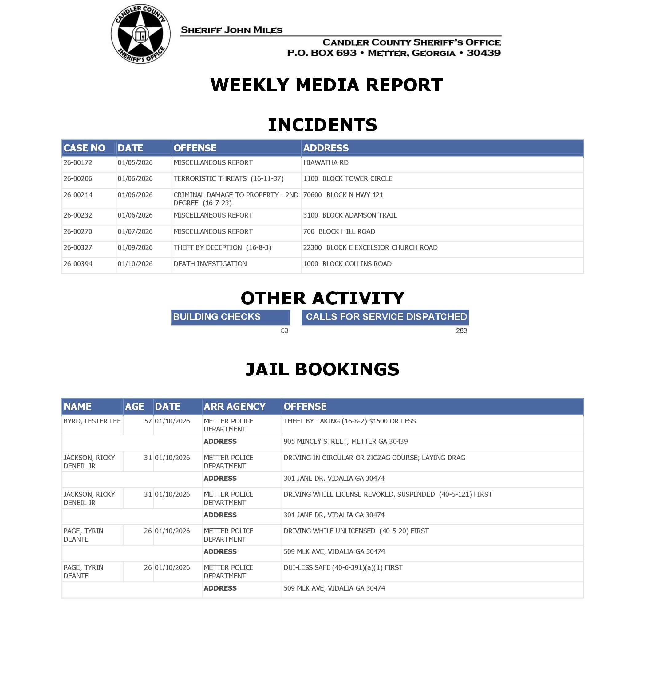 The Candler Co Jail Booking & Incident Report 01/12/26 details arrests from Metter, Candler County, and the Georgia State Patrol. Incident reports are from the Sheriff’s Office only.