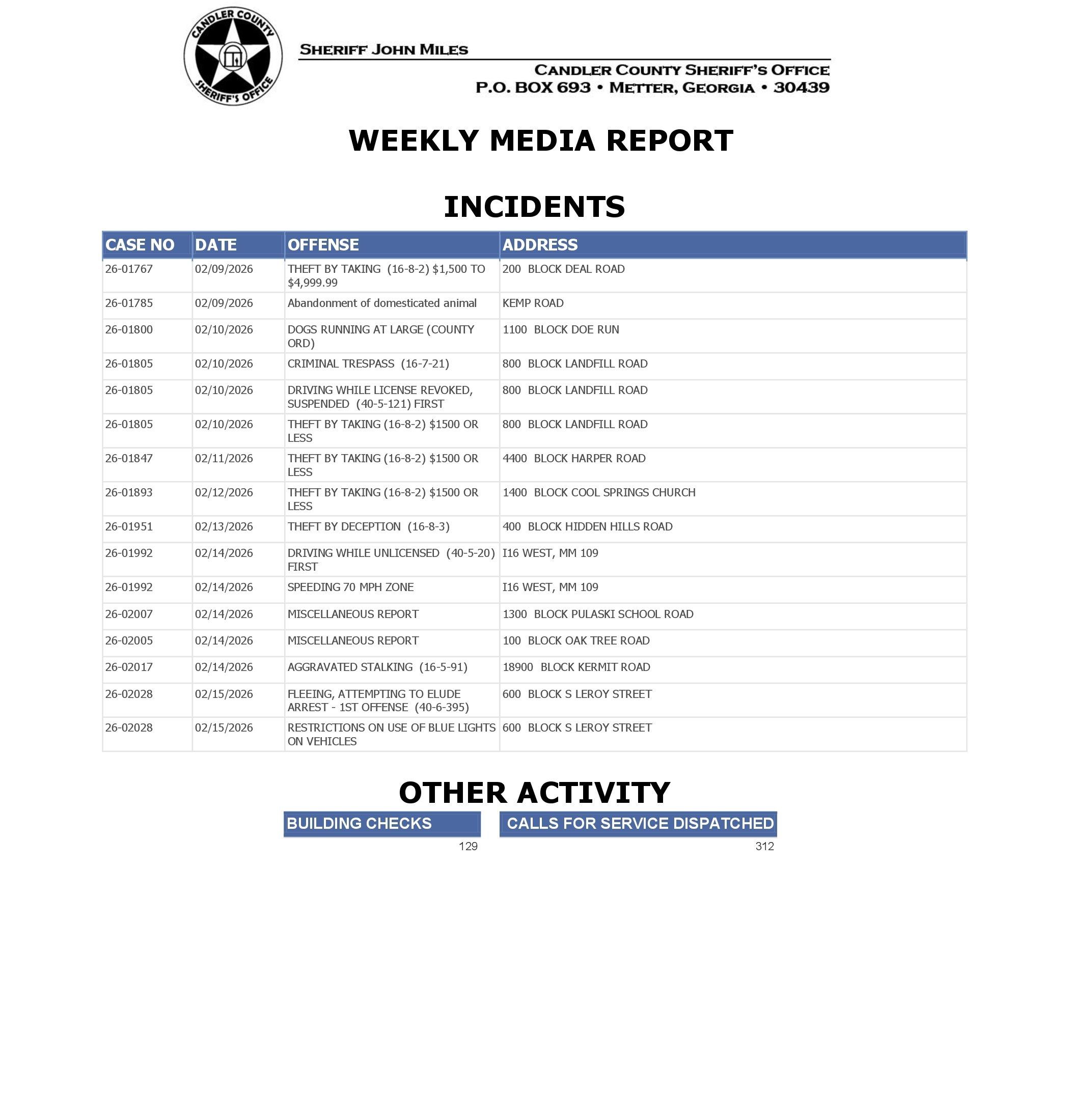The Candler Co Jail Booking & Incident Report 02/16/26 details arrests from Metter, Candler County, and the Georgia State Patrol. Incident reports are from the Sheriff’s Office only.