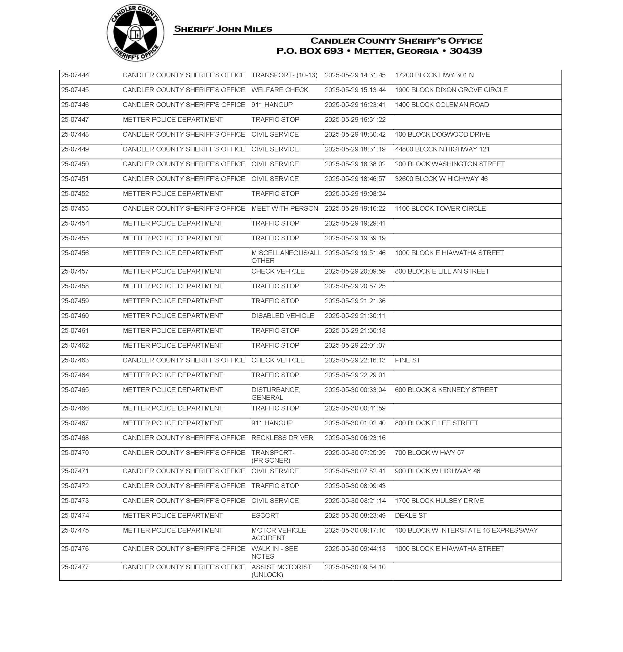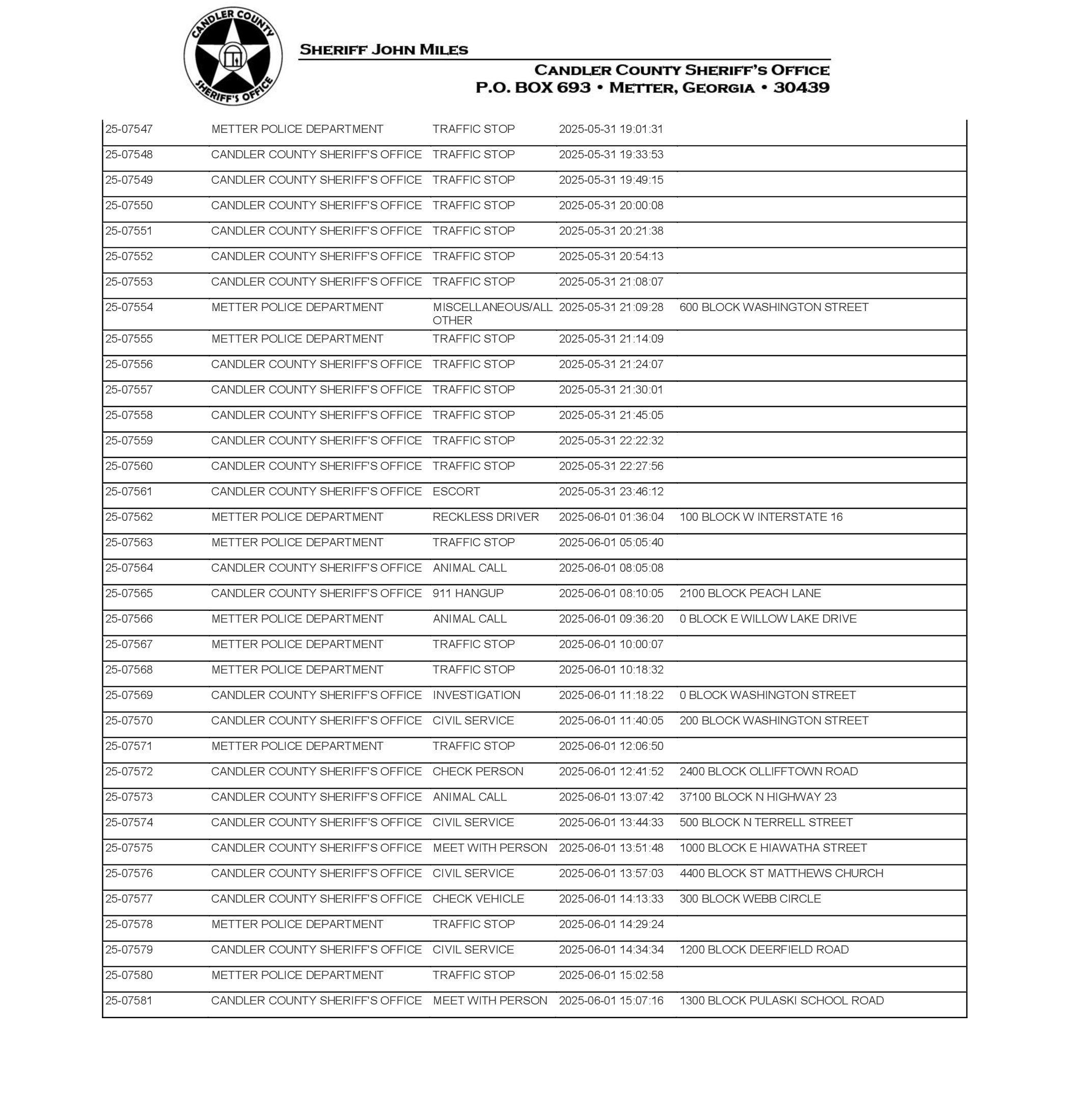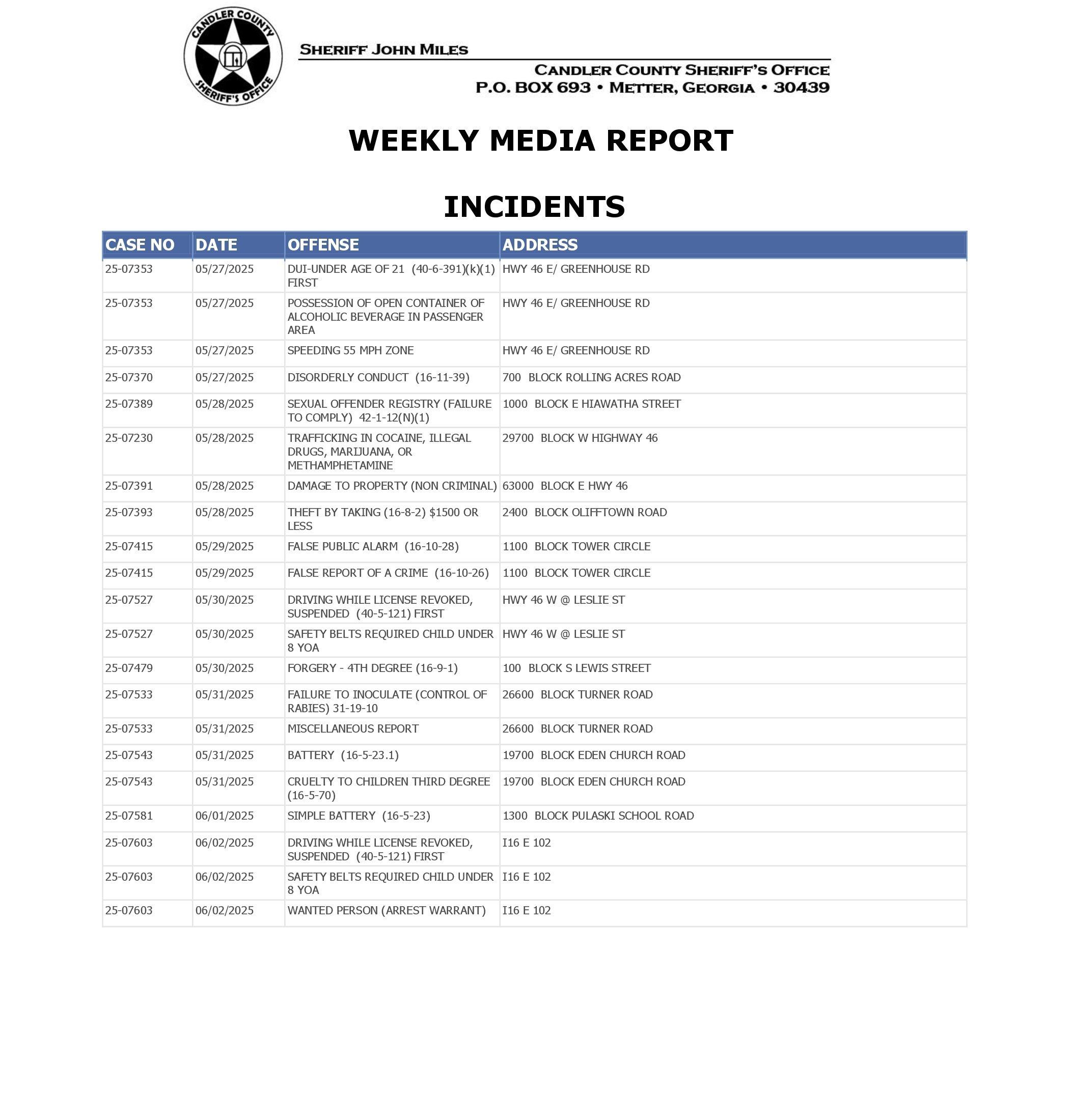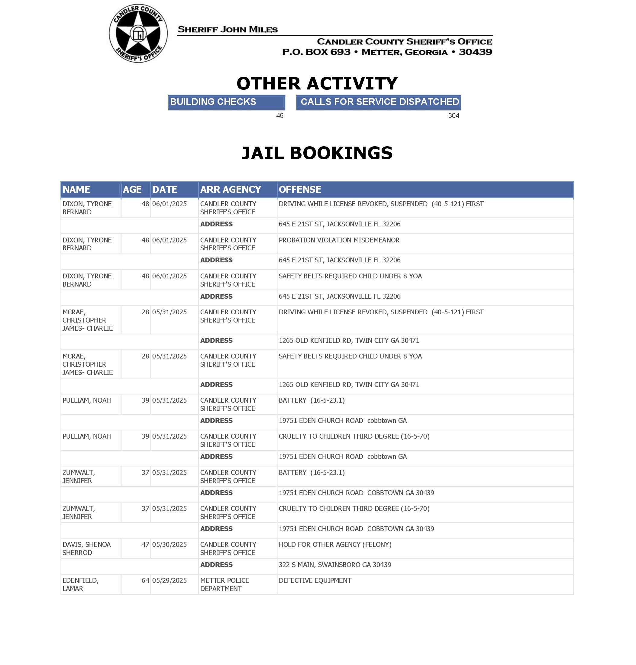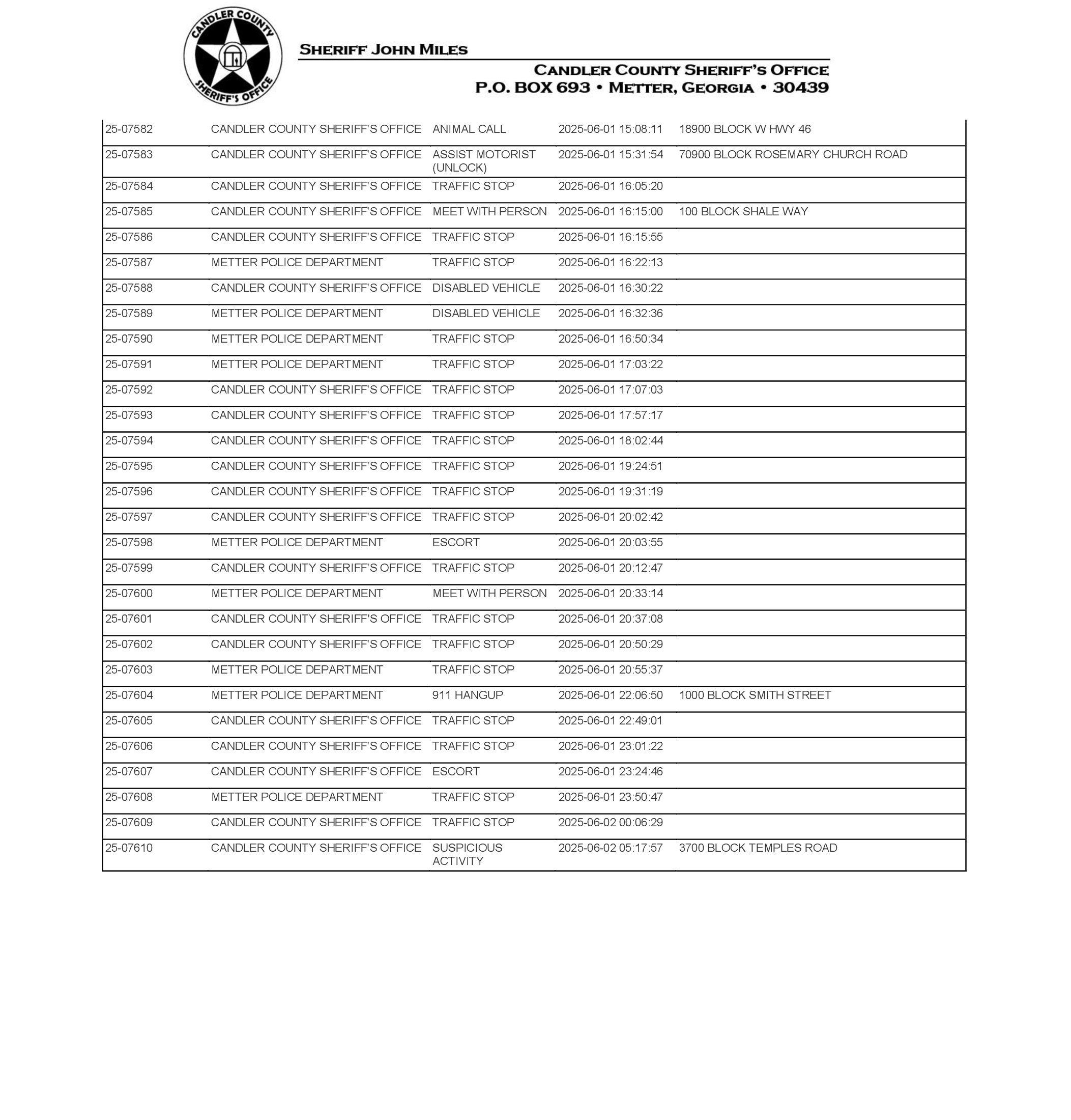 The Candler Co Jail Booking & Incident Report 06/02/25 details arrests from Metter, Candler County, and the Georgia State Patrol. Incident reports are from the Sheriff’s Office only.