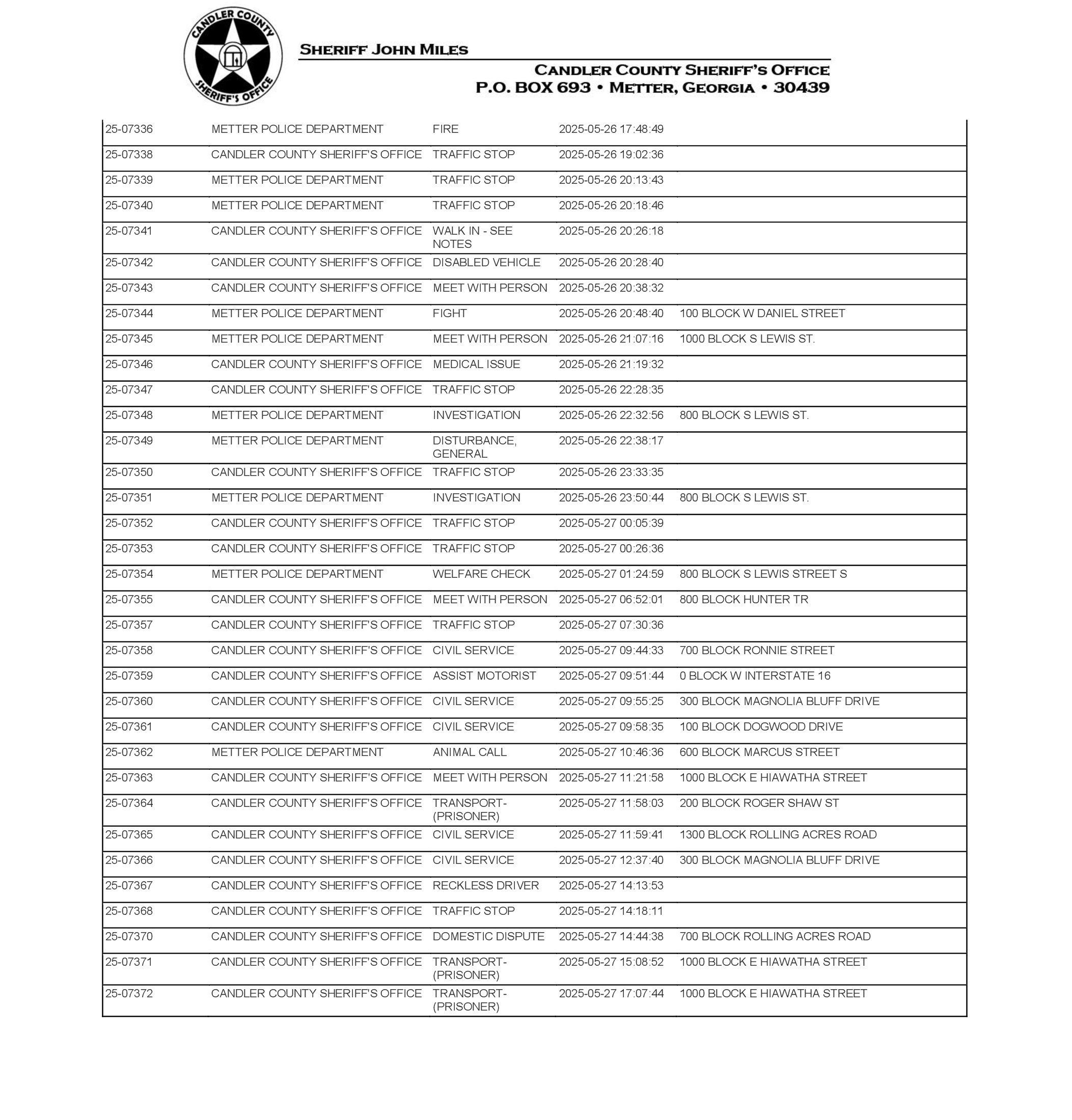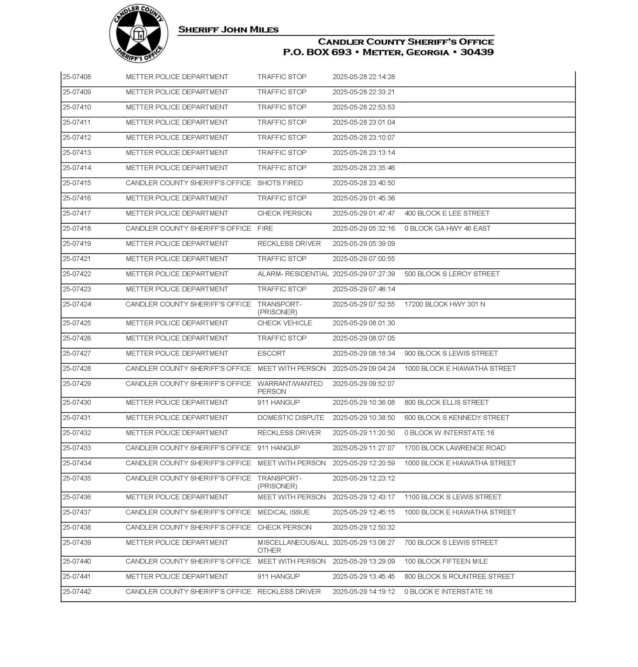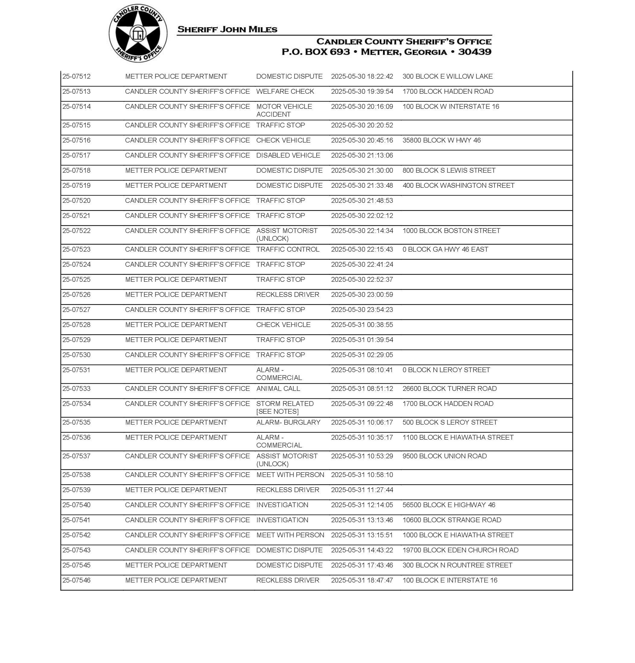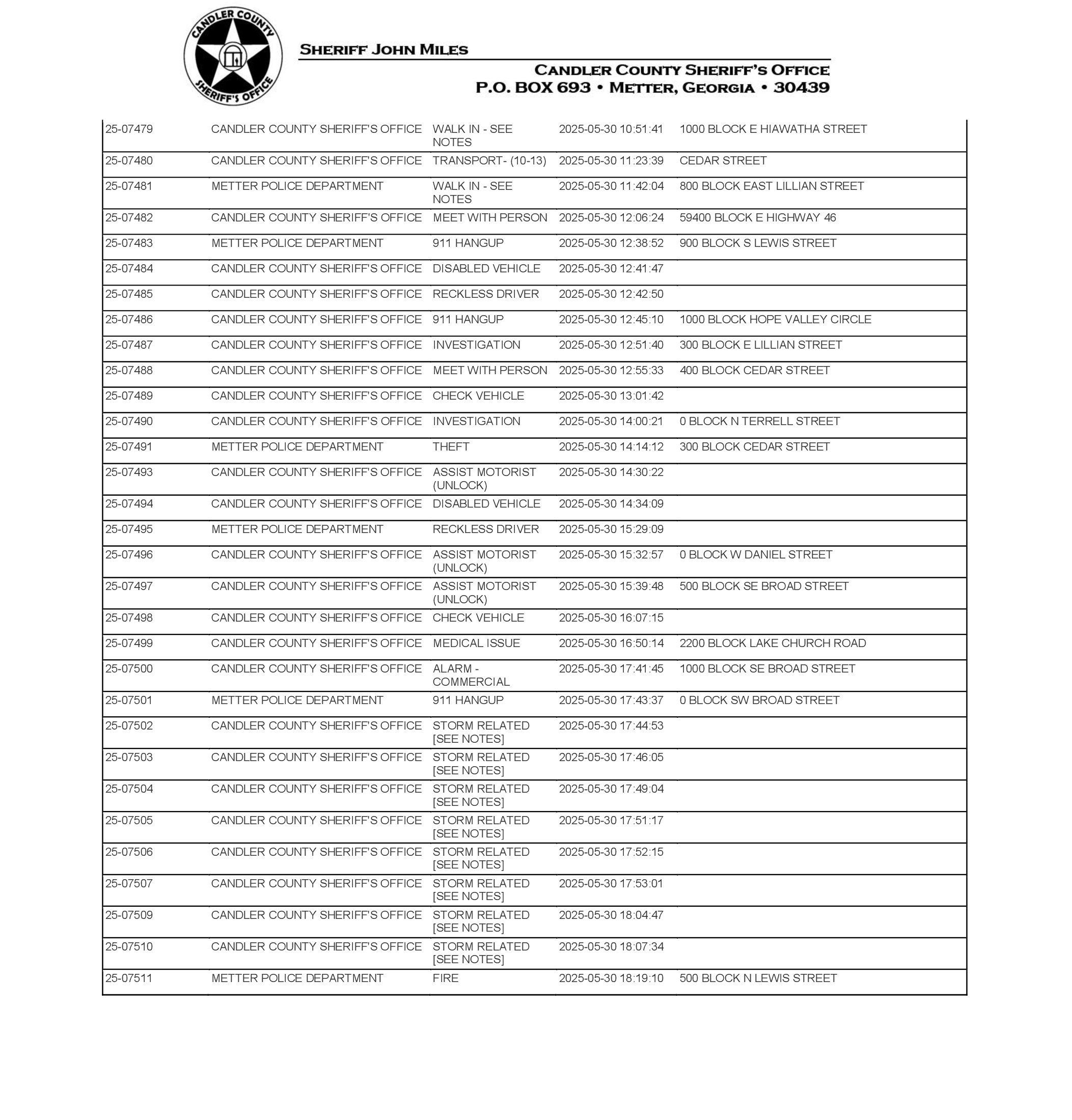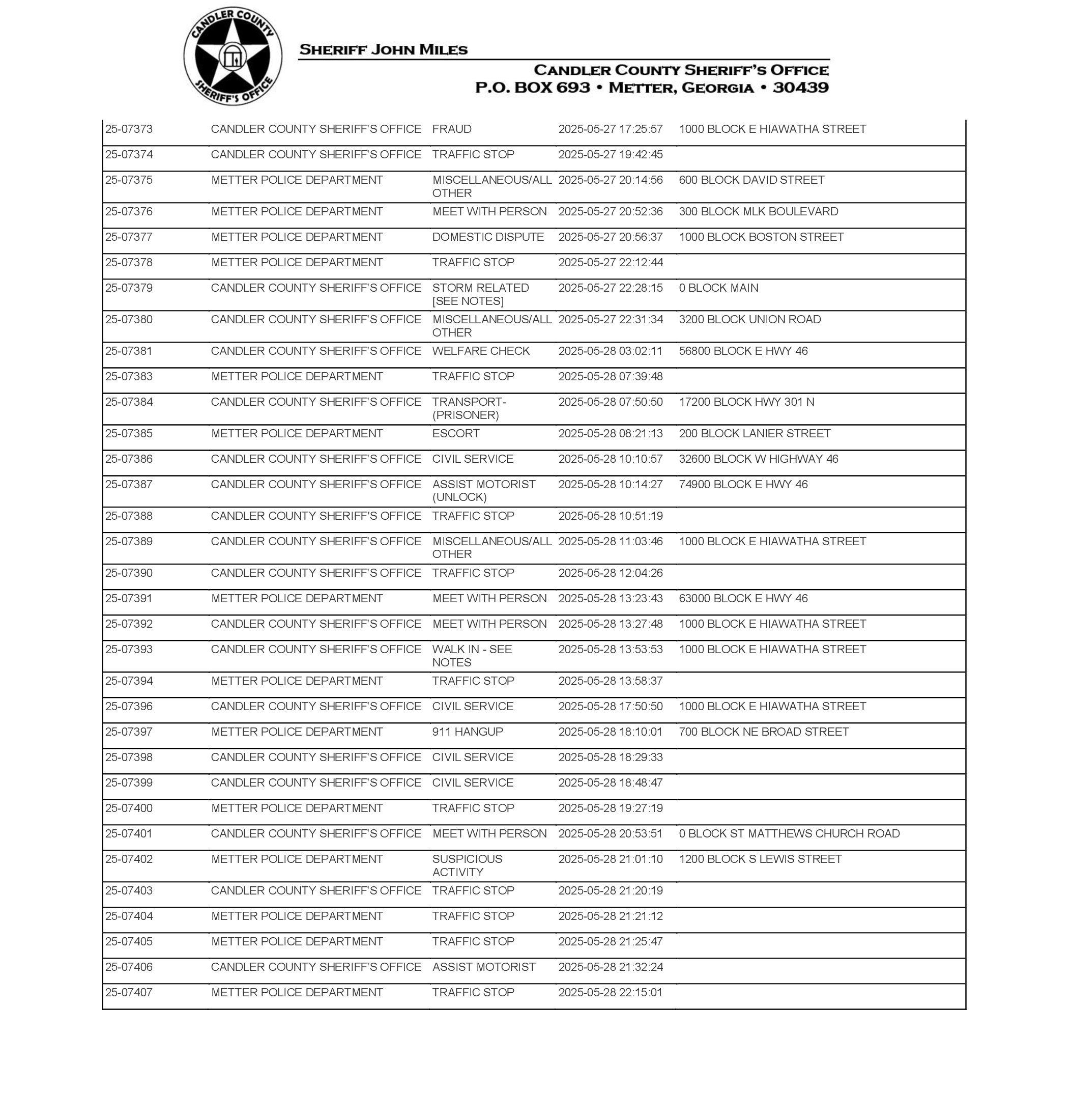 The Candler Co Jail Booking & Incident Report 06/02/25 details arrests from Metter, Candler County, and the Georgia State Patrol. Incident reports are from the Sheriff’s Office only.