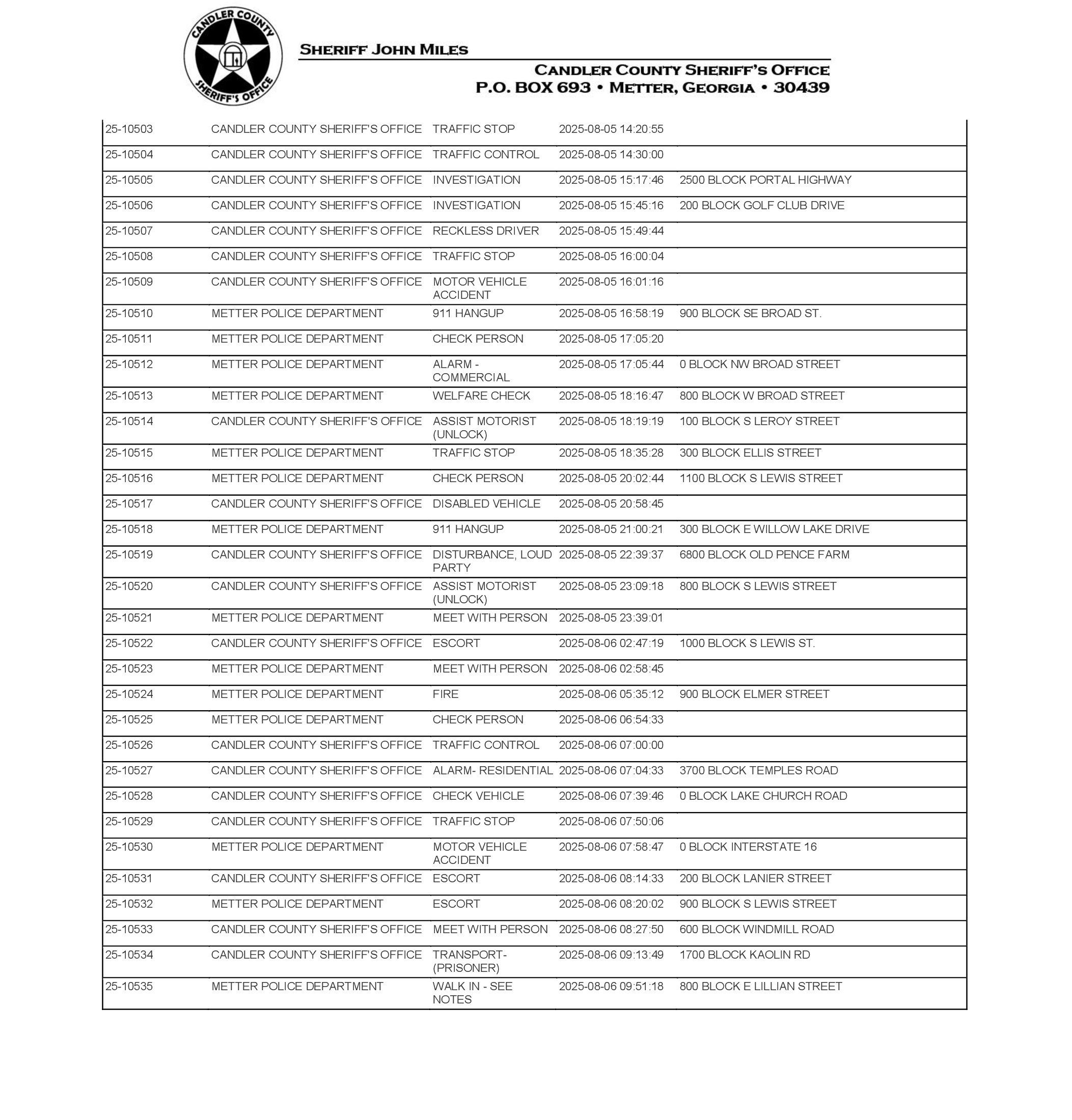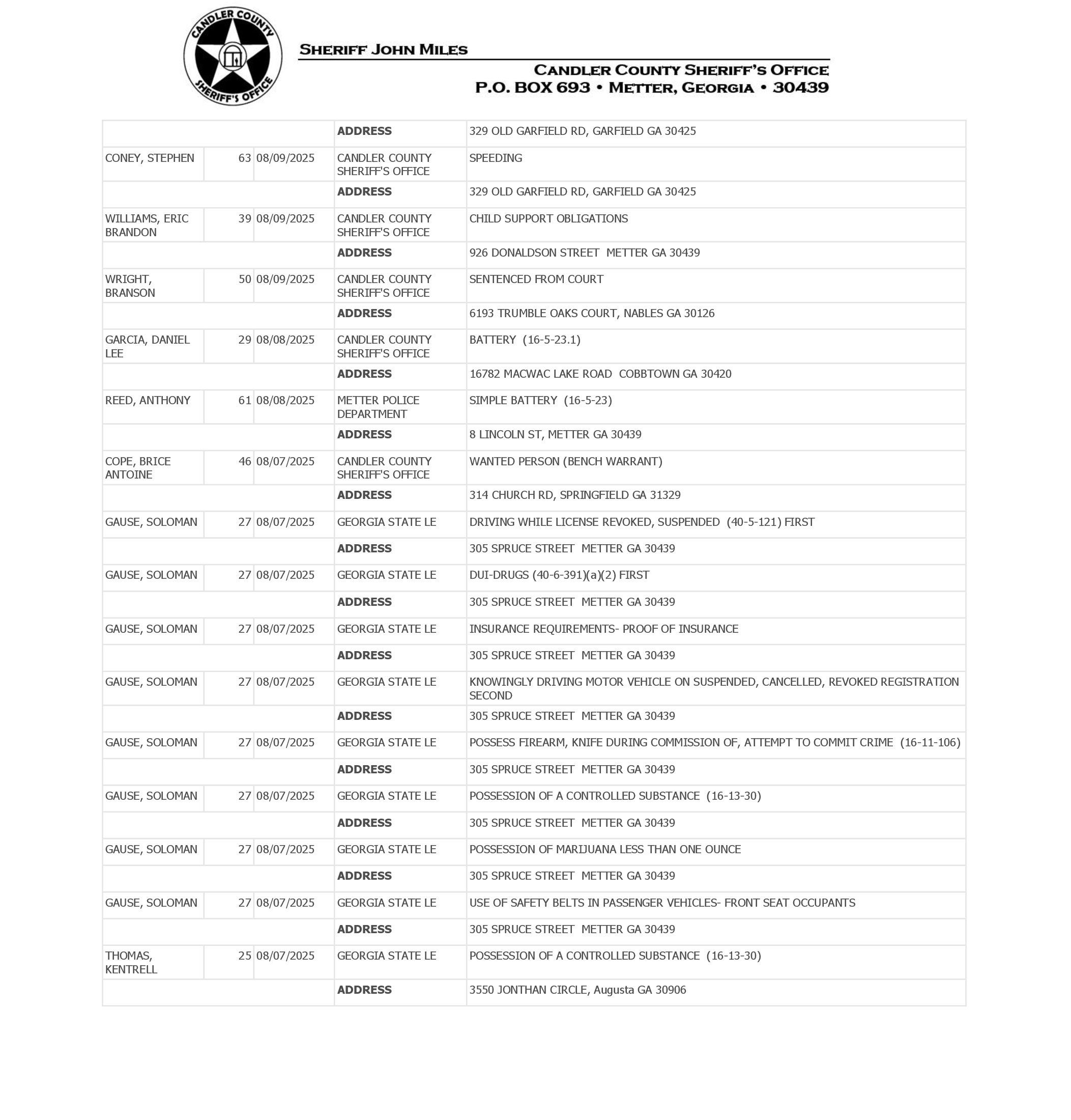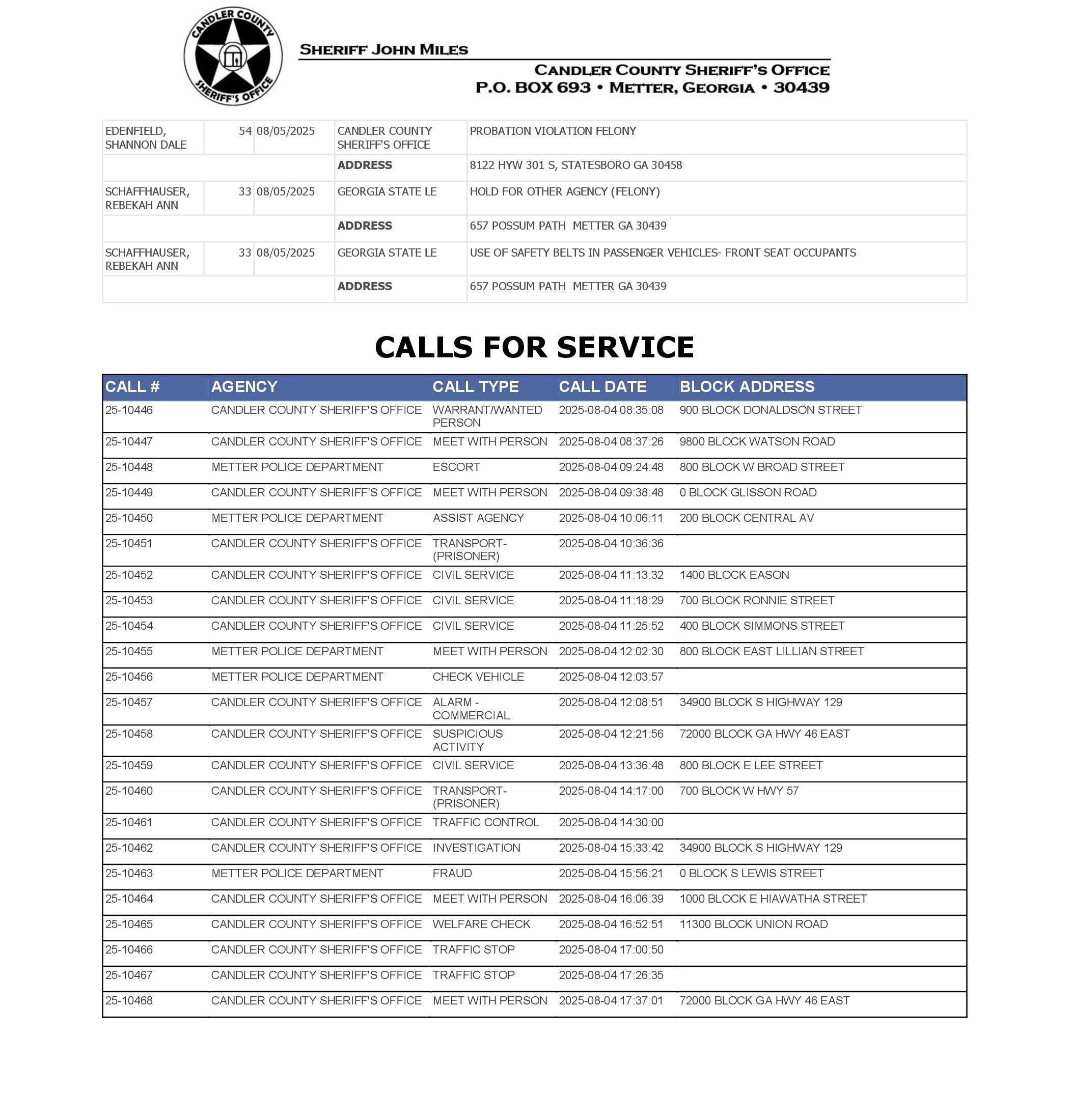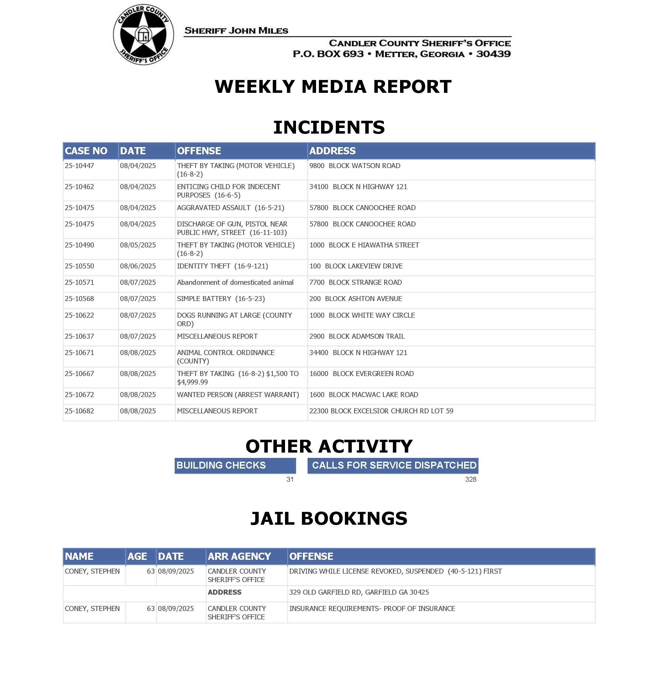 The Candler Co Jail Booking & Incident Report 08/11/25 details arrests from Metter, Candler County, and the Georgia State Patrol. Incident reports are from the Sheriff’s Office only.