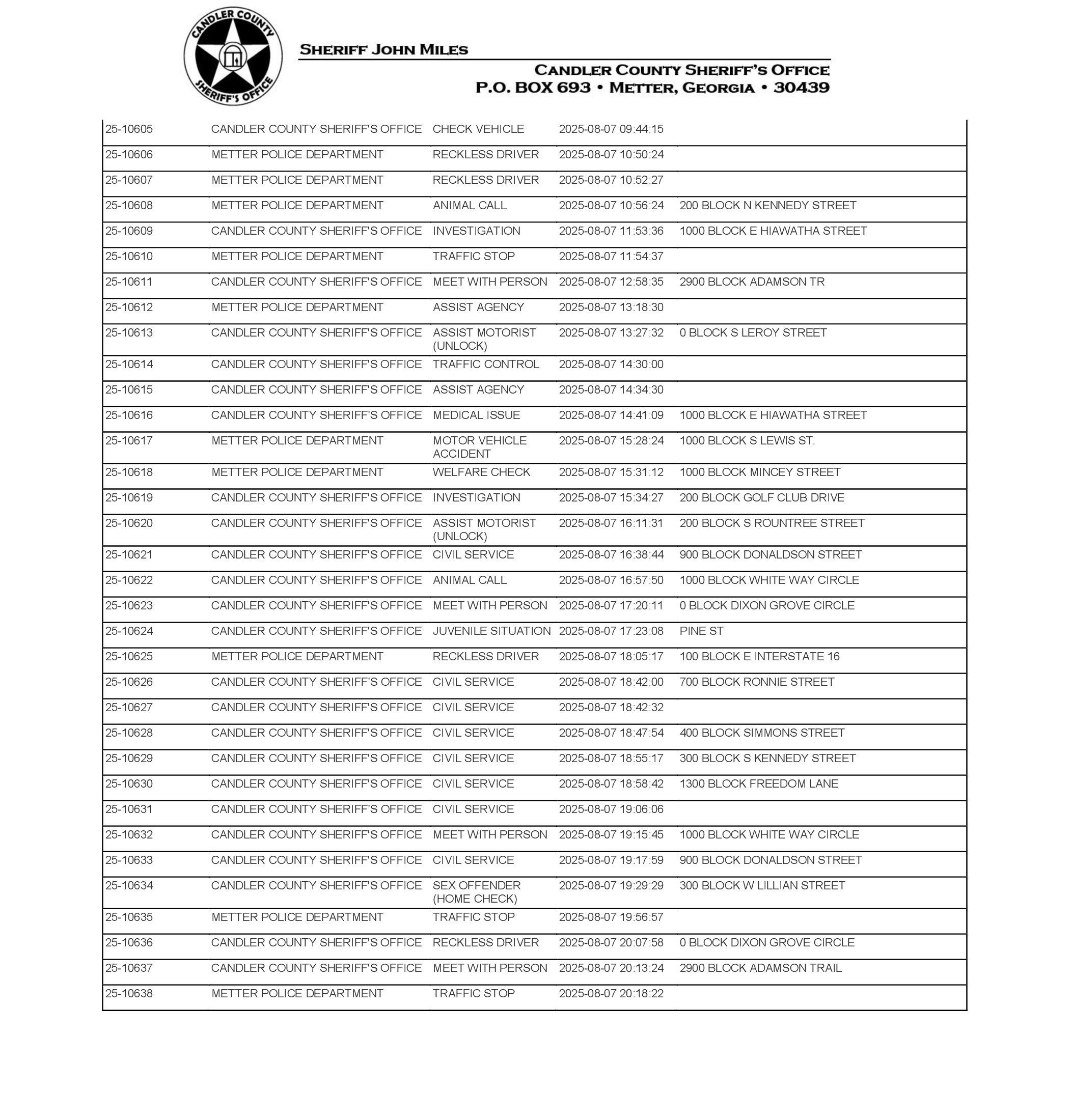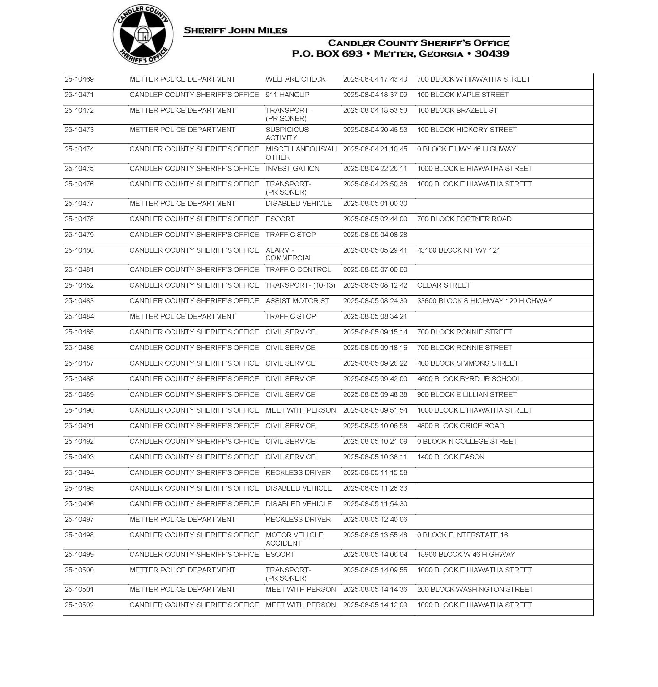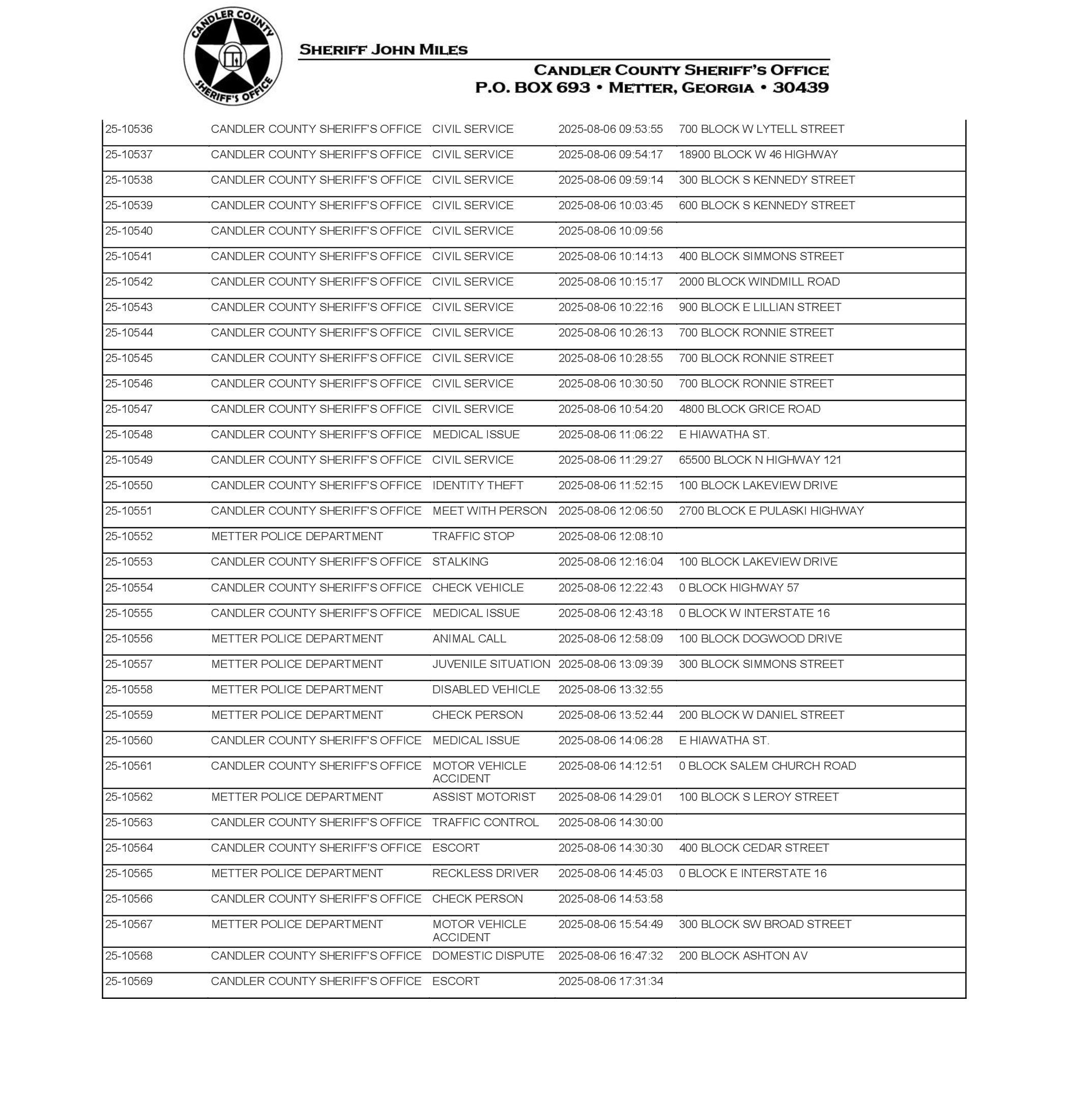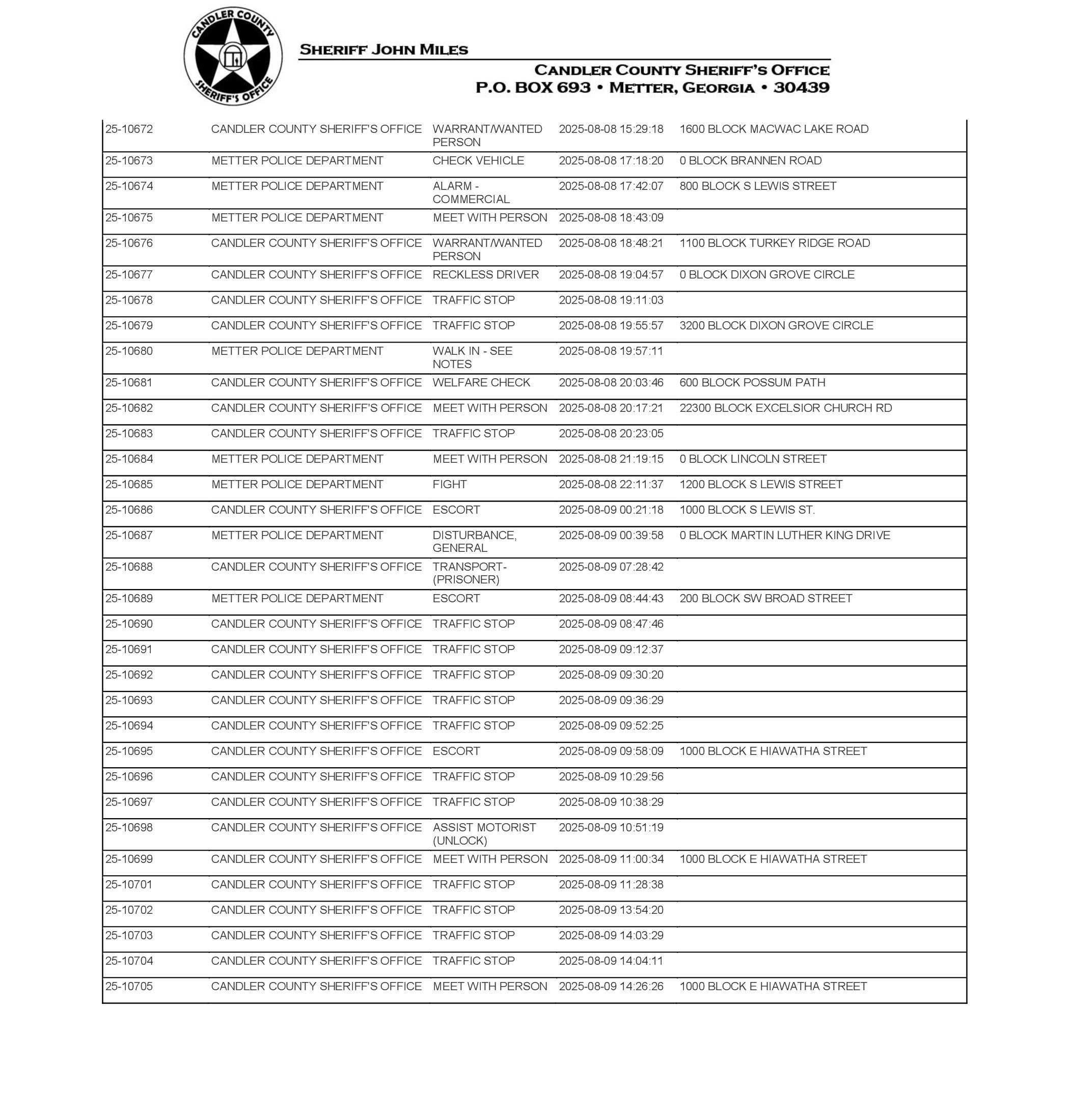 The Candler Co Jail Booking & Incident Report 08/11/25 details arrests from Metter, Candler County, and the Georgia State Patrol. Incident reports are from the Sheriff’s Office only.
