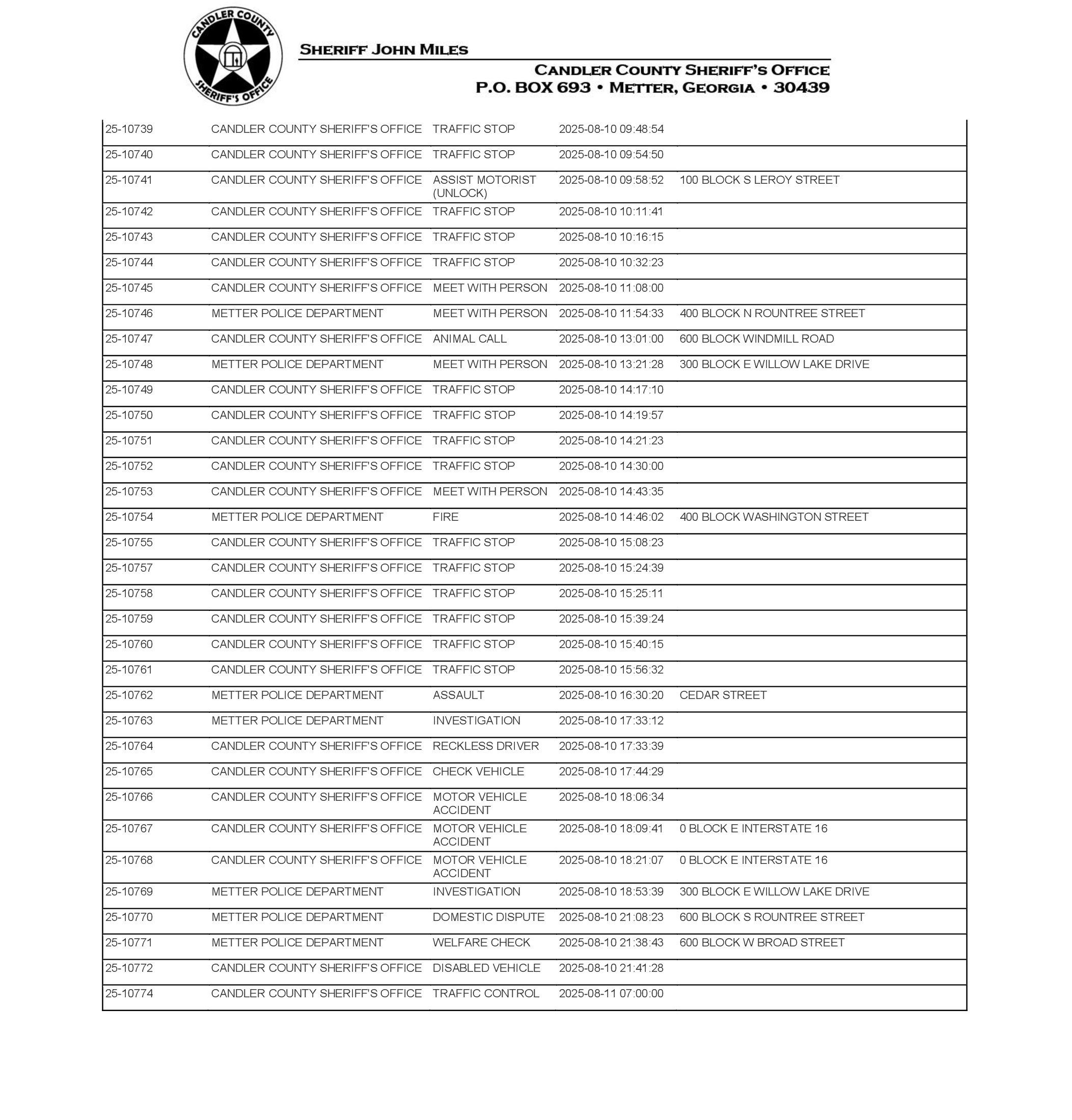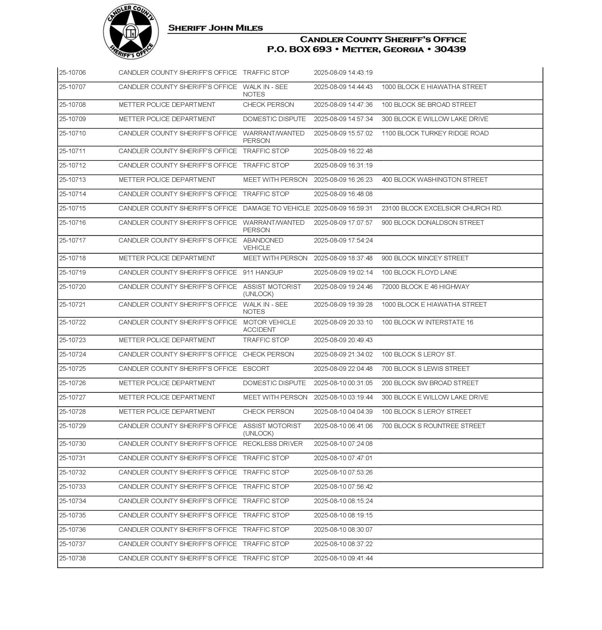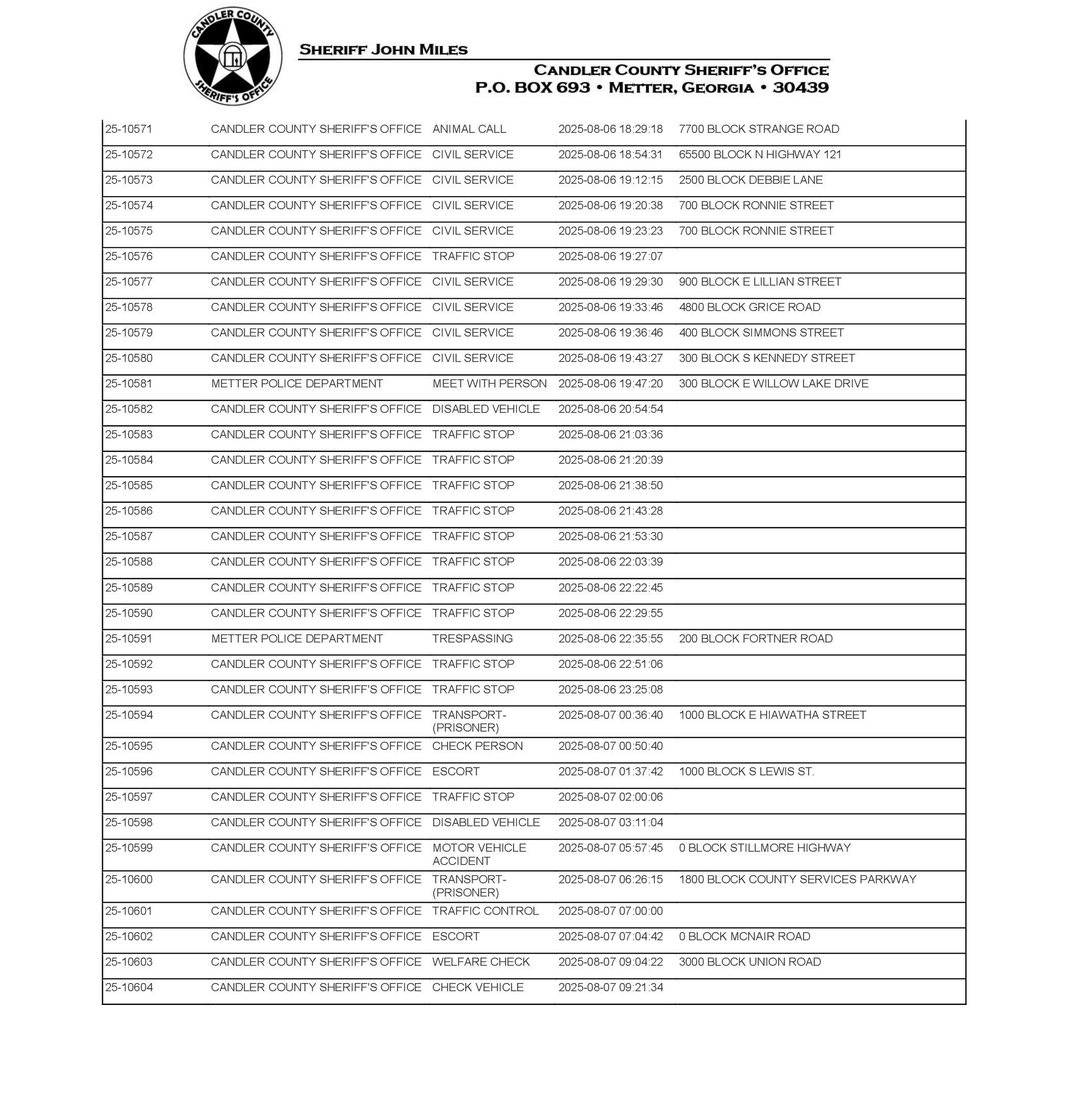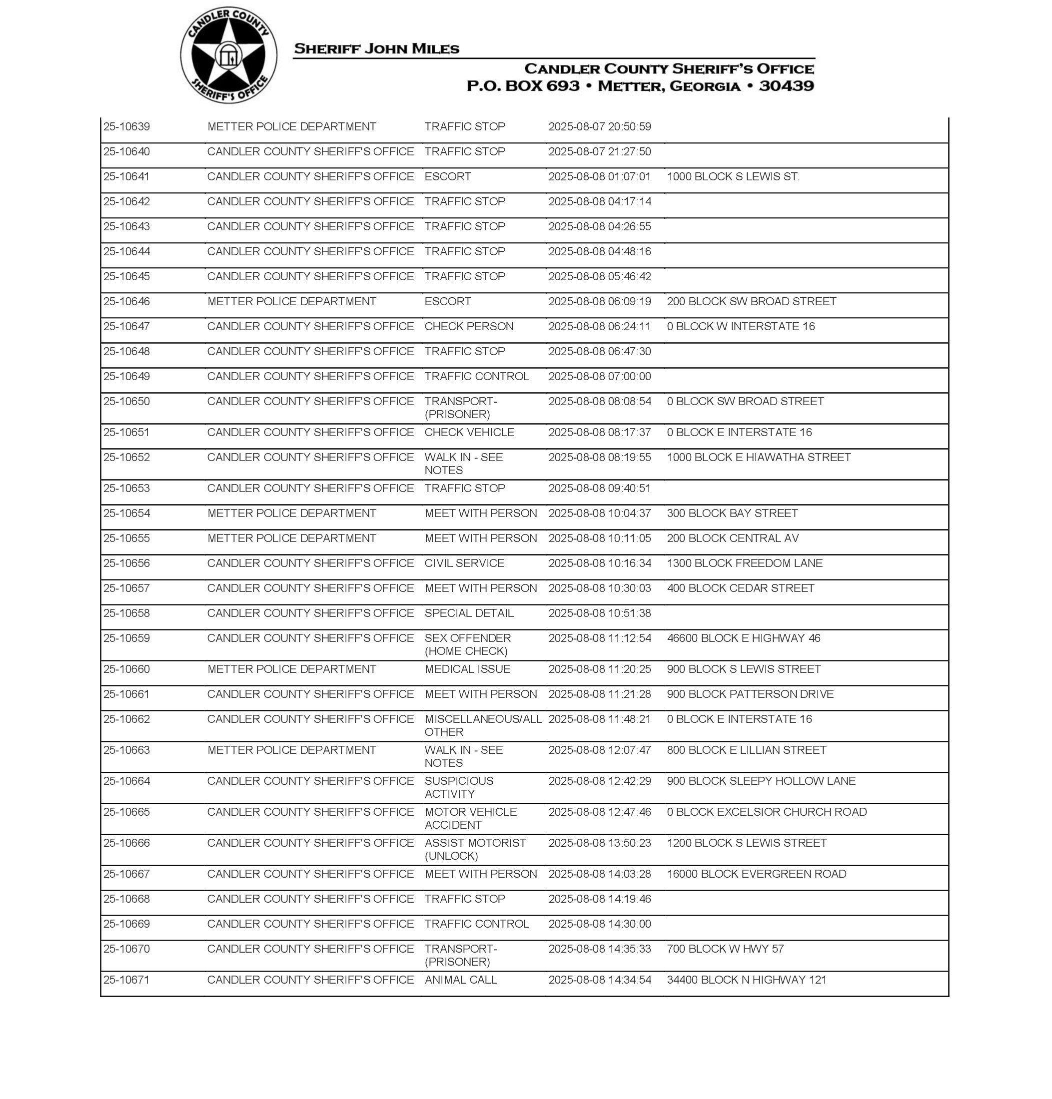 The Candler Co Jail Booking & Incident Report 08/11/25 details arrests from Metter, Candler County, and the Georgia State Patrol. Incident reports are from the Sheriff’s Office only.