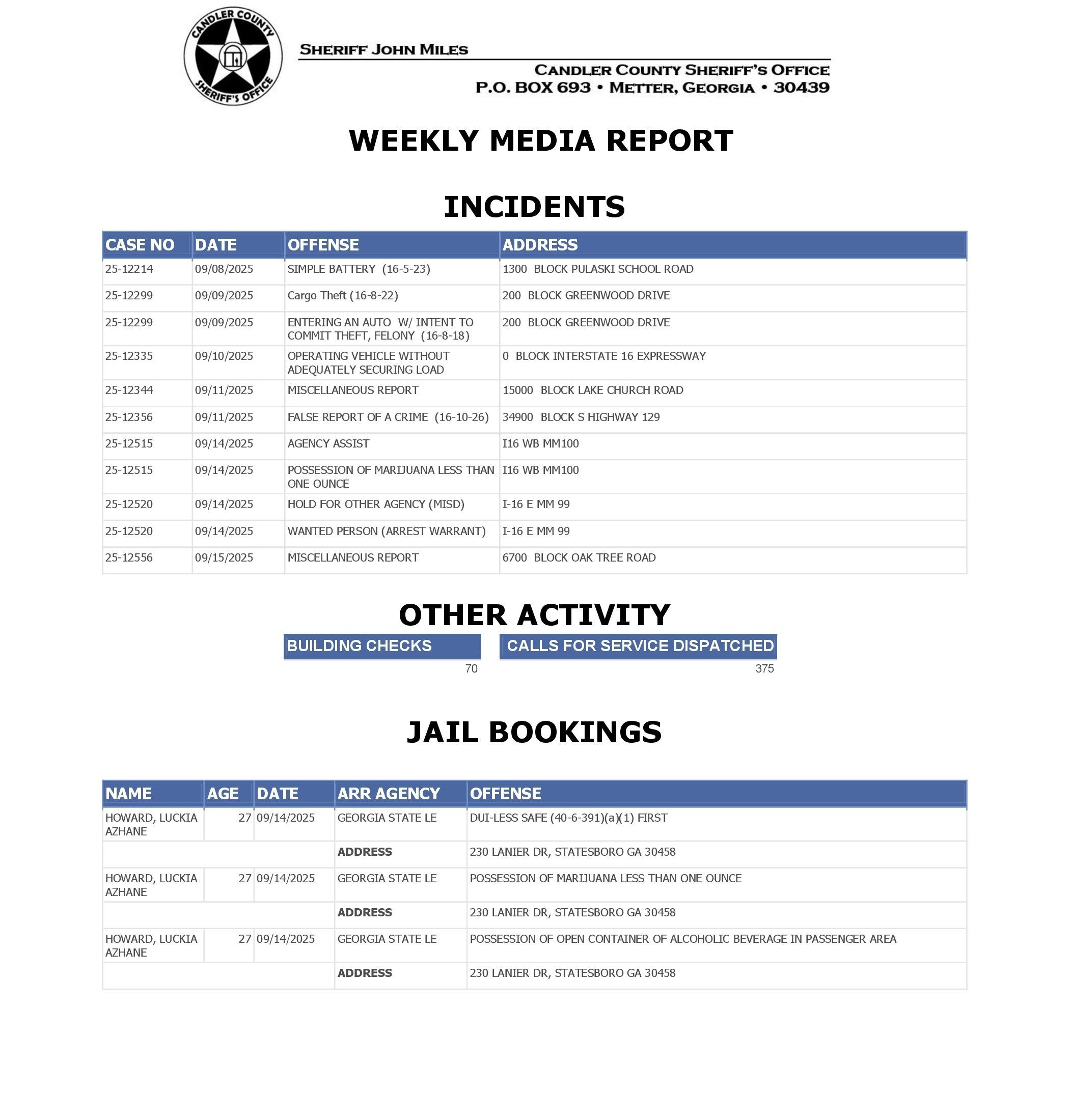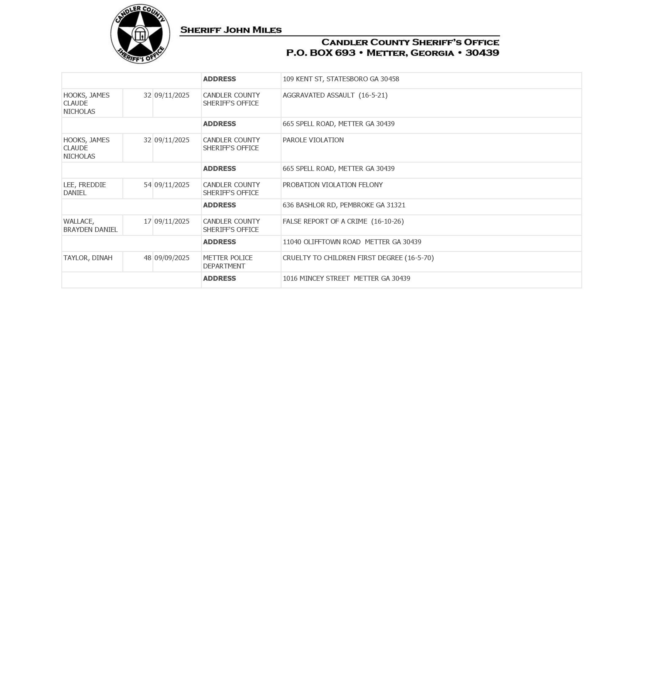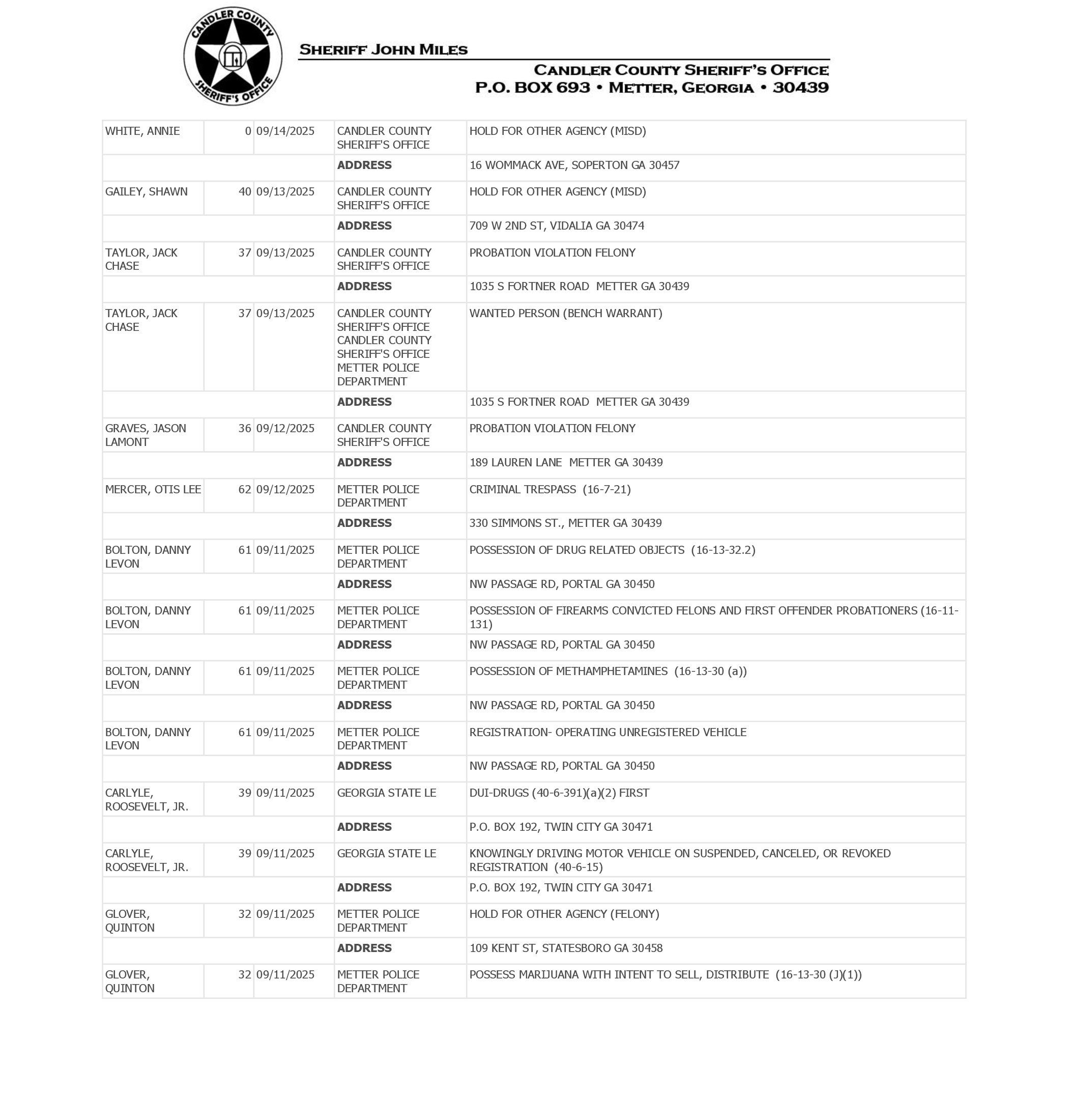 The Candler Co Jail Booking & Incident Report 09/15/25 details arrests from Metter, Candler County, and the Georgia State Patrol. Incident reports are from the Sheriff’s Office only.