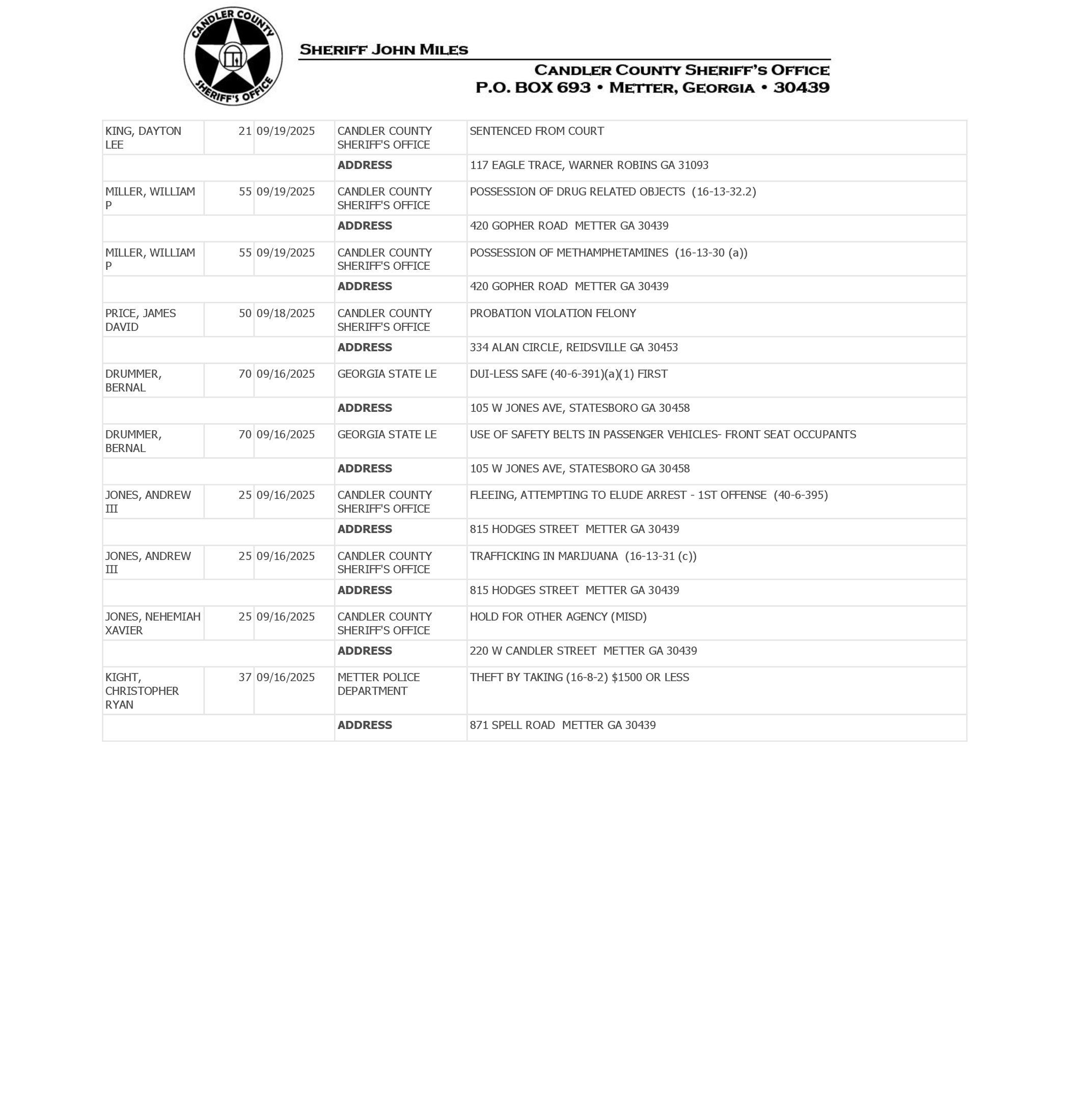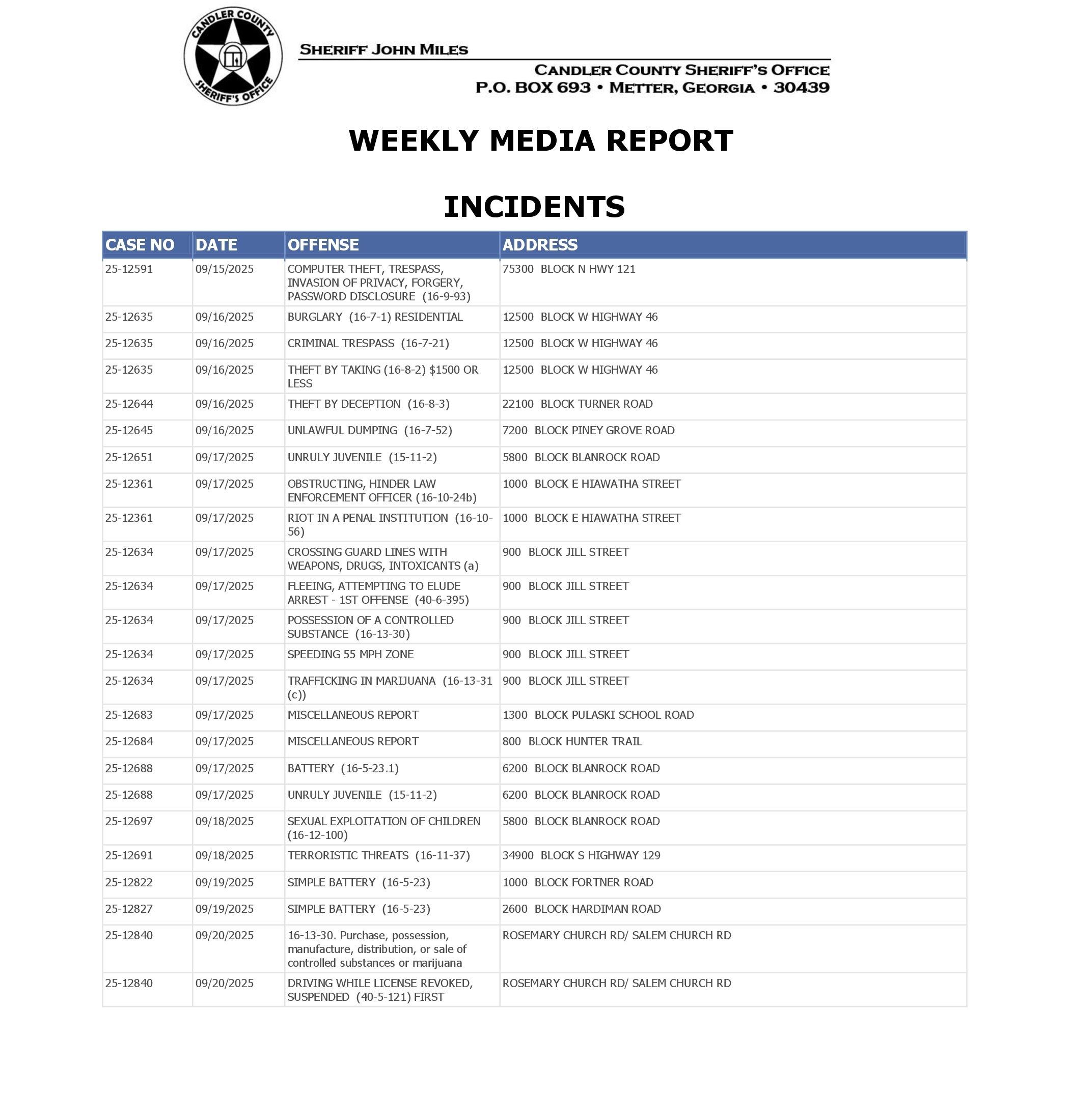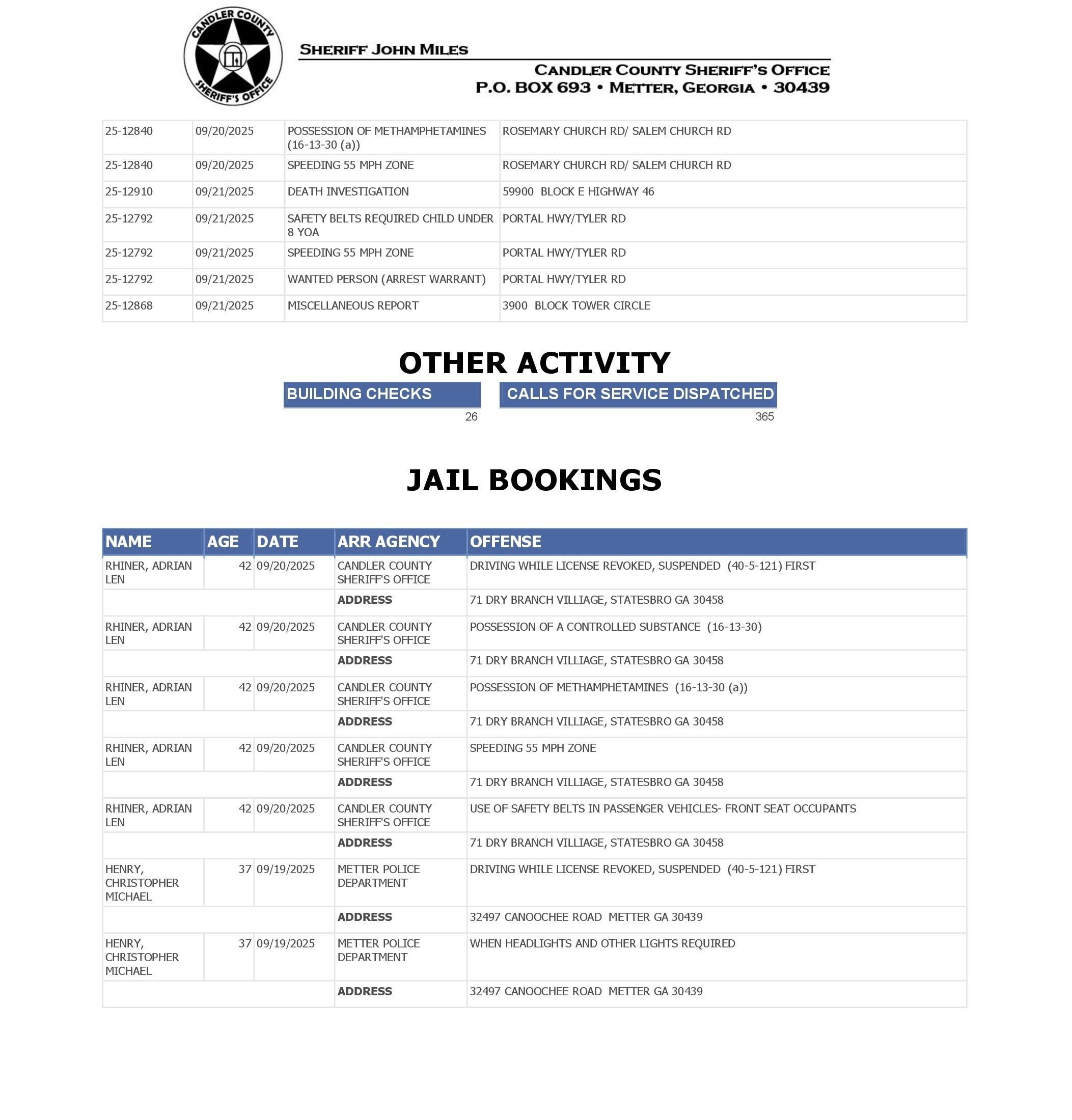 The Candler Co Jail Booking & Incident Report 09/22/25 details arrests from Metter, Candler County, and the Georgia State Patrol. Incident reports are from the Sheriff’s Office only.