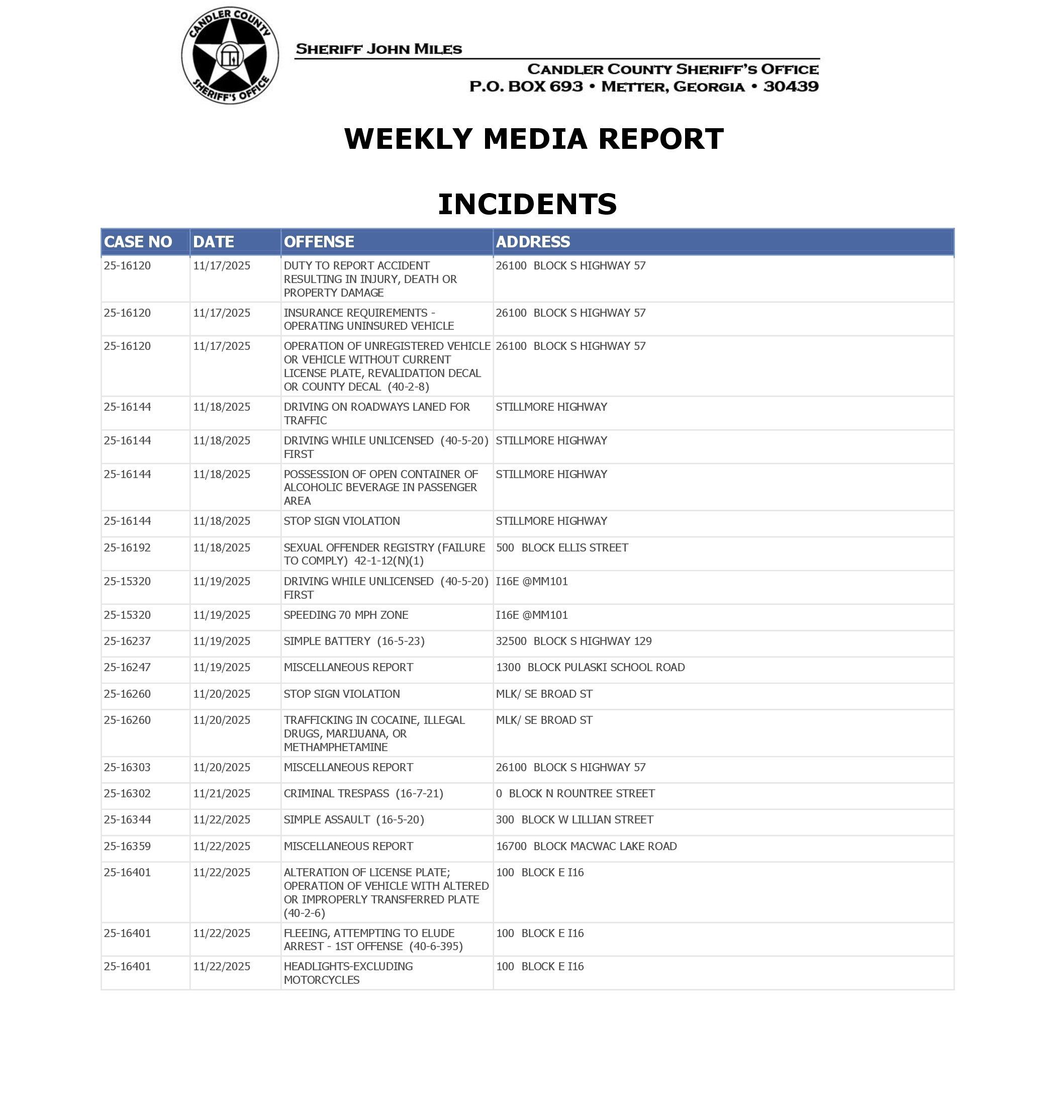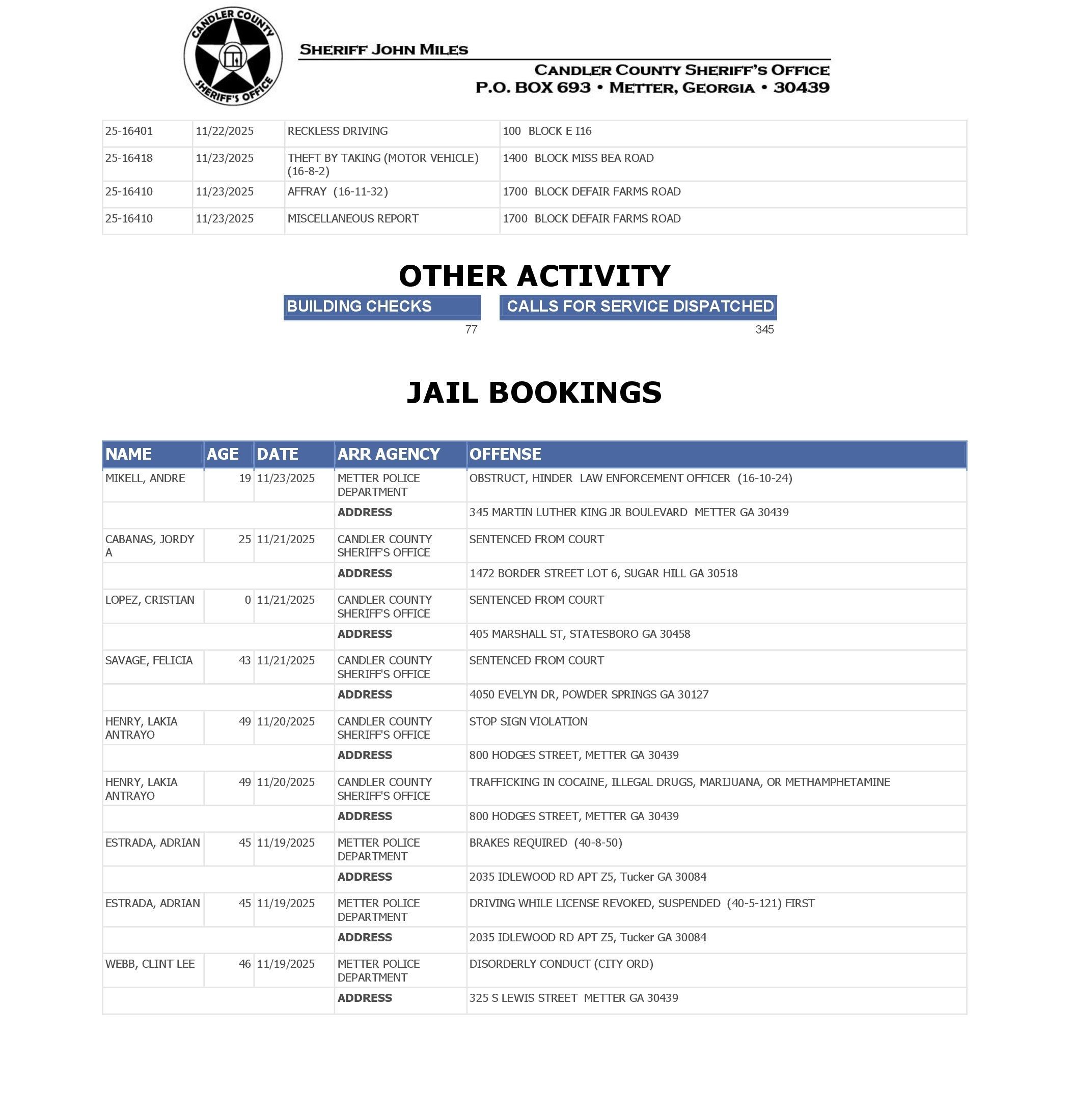 The Candler Co Jail Booking & Incident Report 11/24/25 details arrests from Metter, Candler County, and the Georgia State Patrol. Incident reports are from the Sheriff’s Office only.
