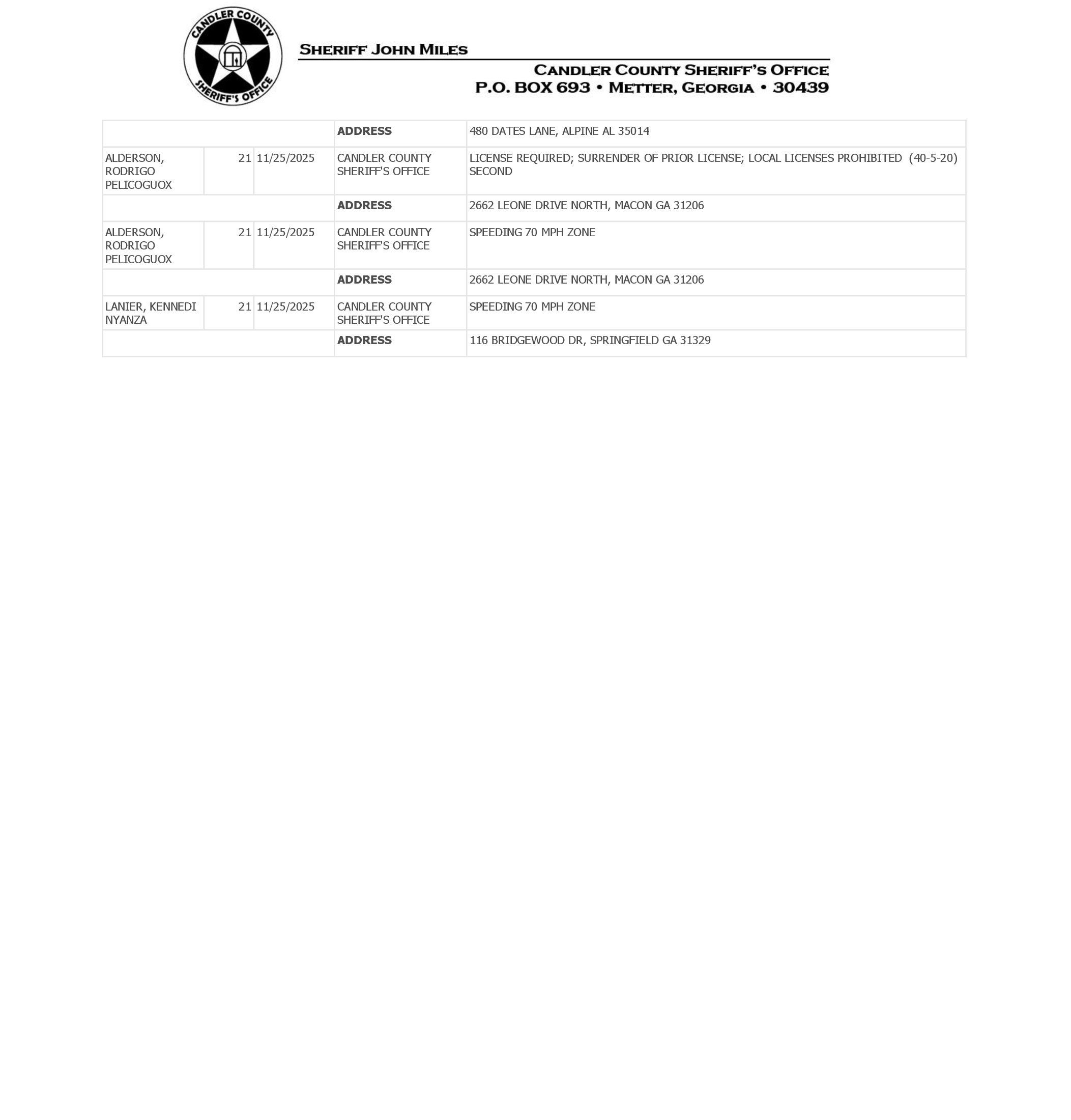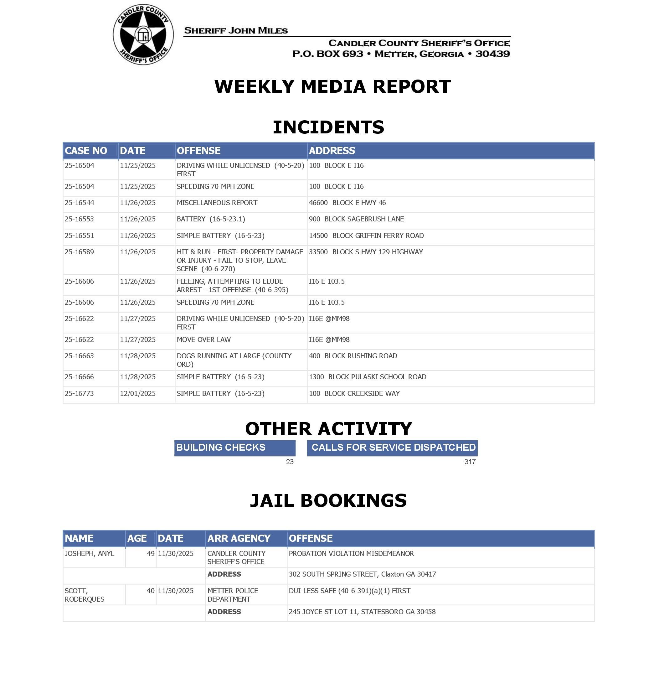 The Candler Co Jail Booking & Incident Report 12/01/25 details arrests from Metter, Candler County, and the Georgia State Patrol. Incident reports are from the Sheriff’s Office only.