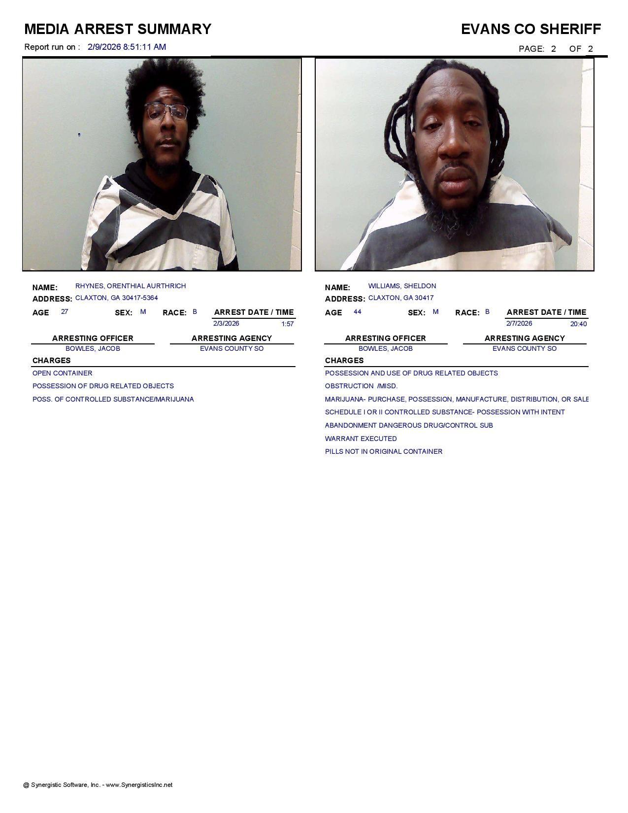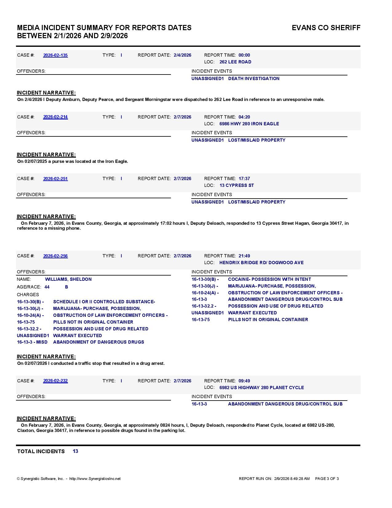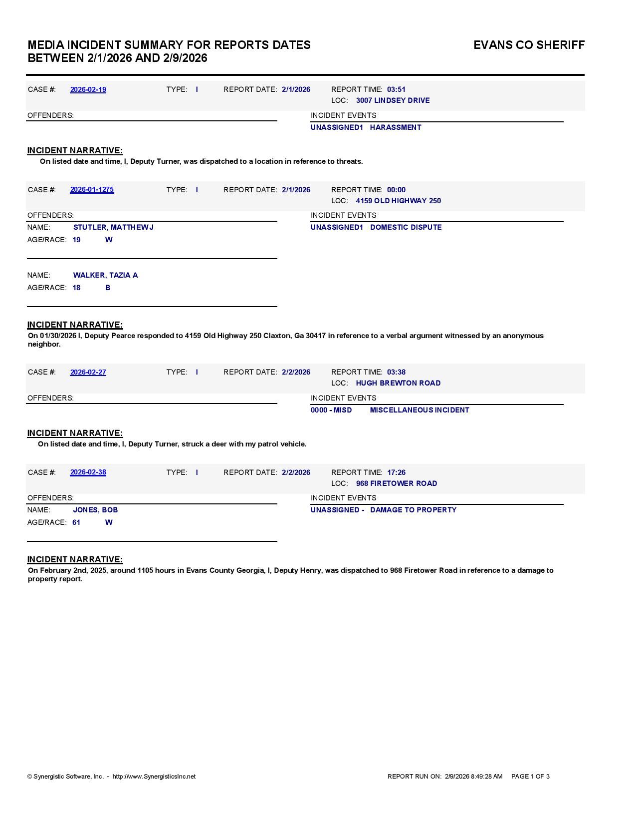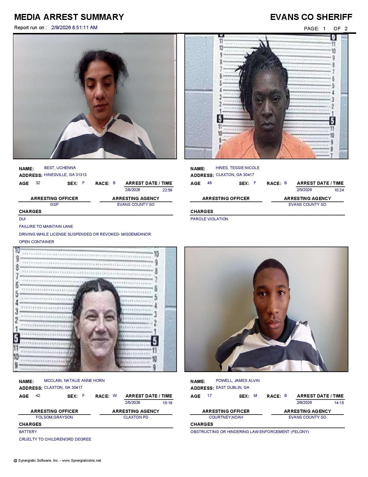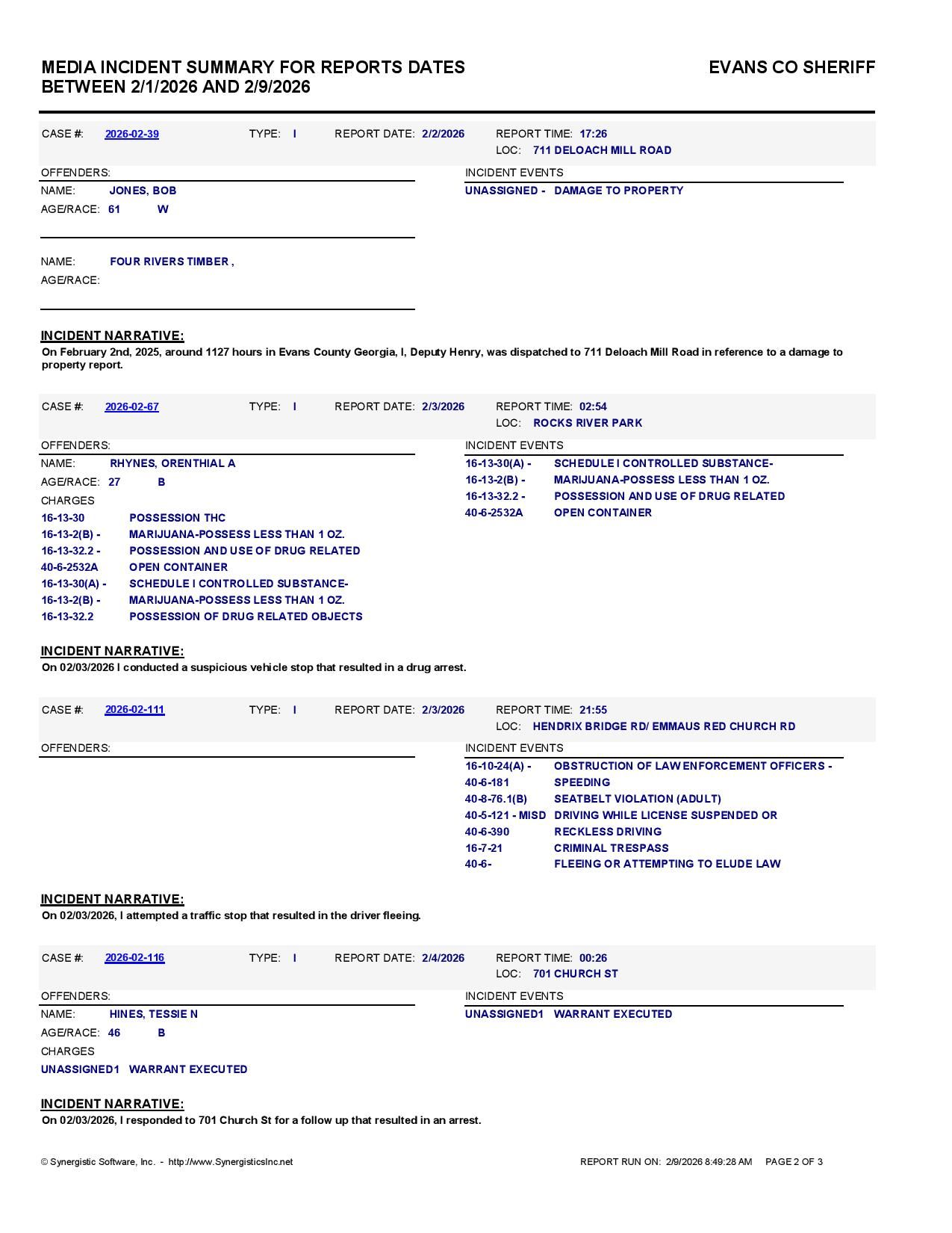 The Evans Co Jail Booking & Incident Report 02/09/26 details arrests from Evans Co., Claxton, Bellville, Hagan, and the Georgia State Patrol. Incident reports are from the Sheriff’s Office only.