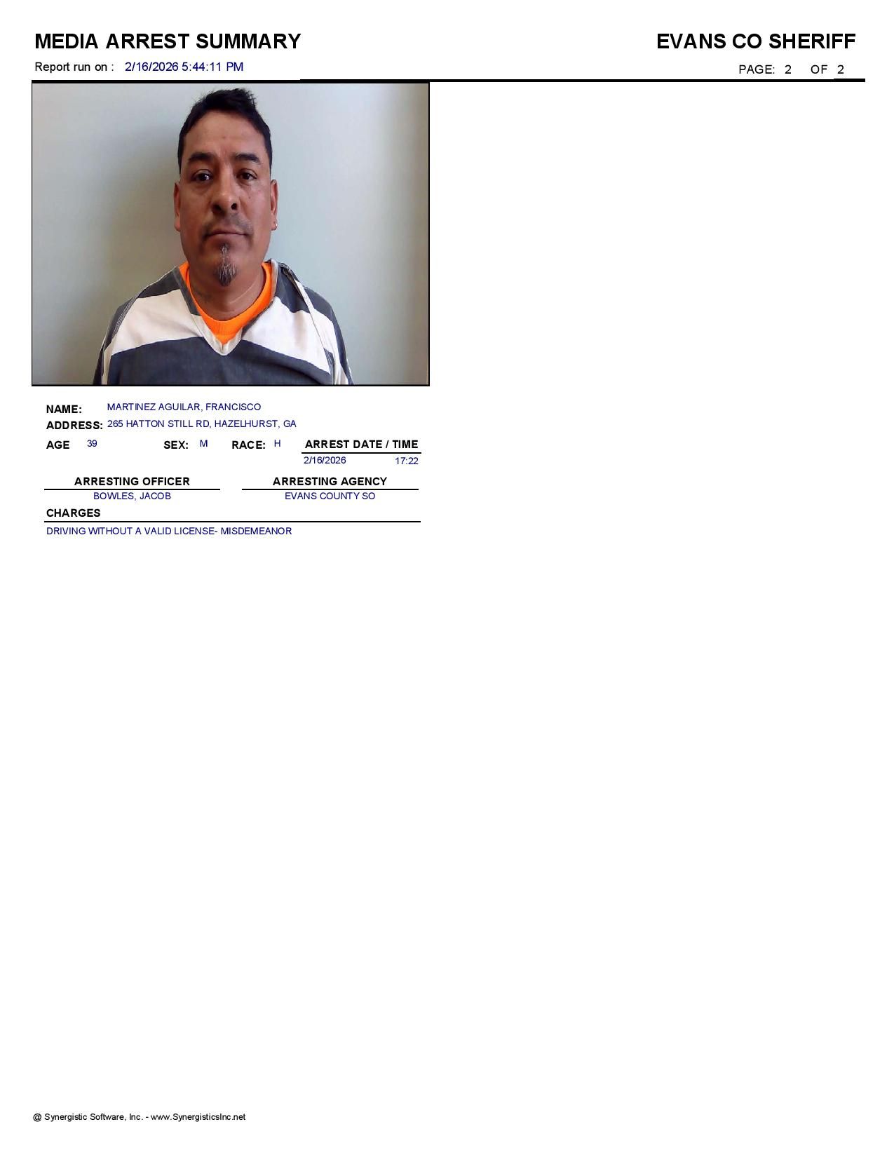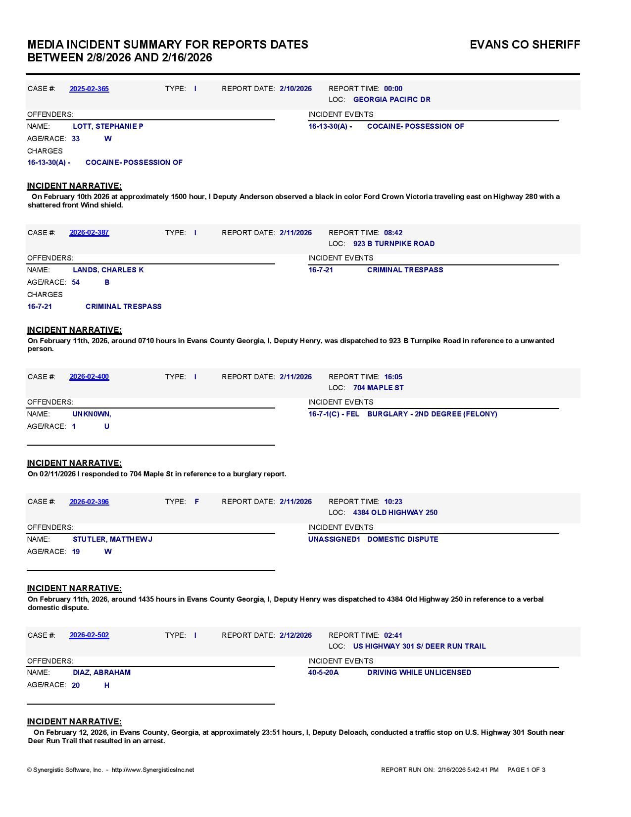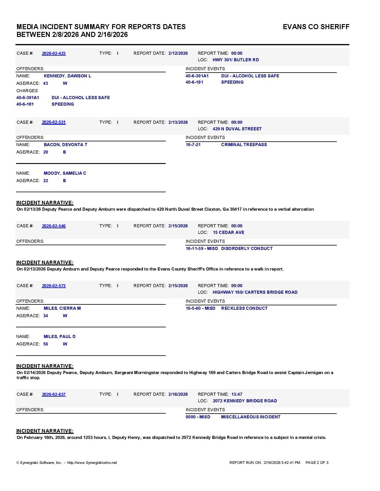 The Evans Co Jail Booking & Incident Report 02/16/26 details arrests from Evans Co., Claxton, Bellville, Hagan, and the Georgia State Patrol. Incident reports are from the Sheriff’s Office only.