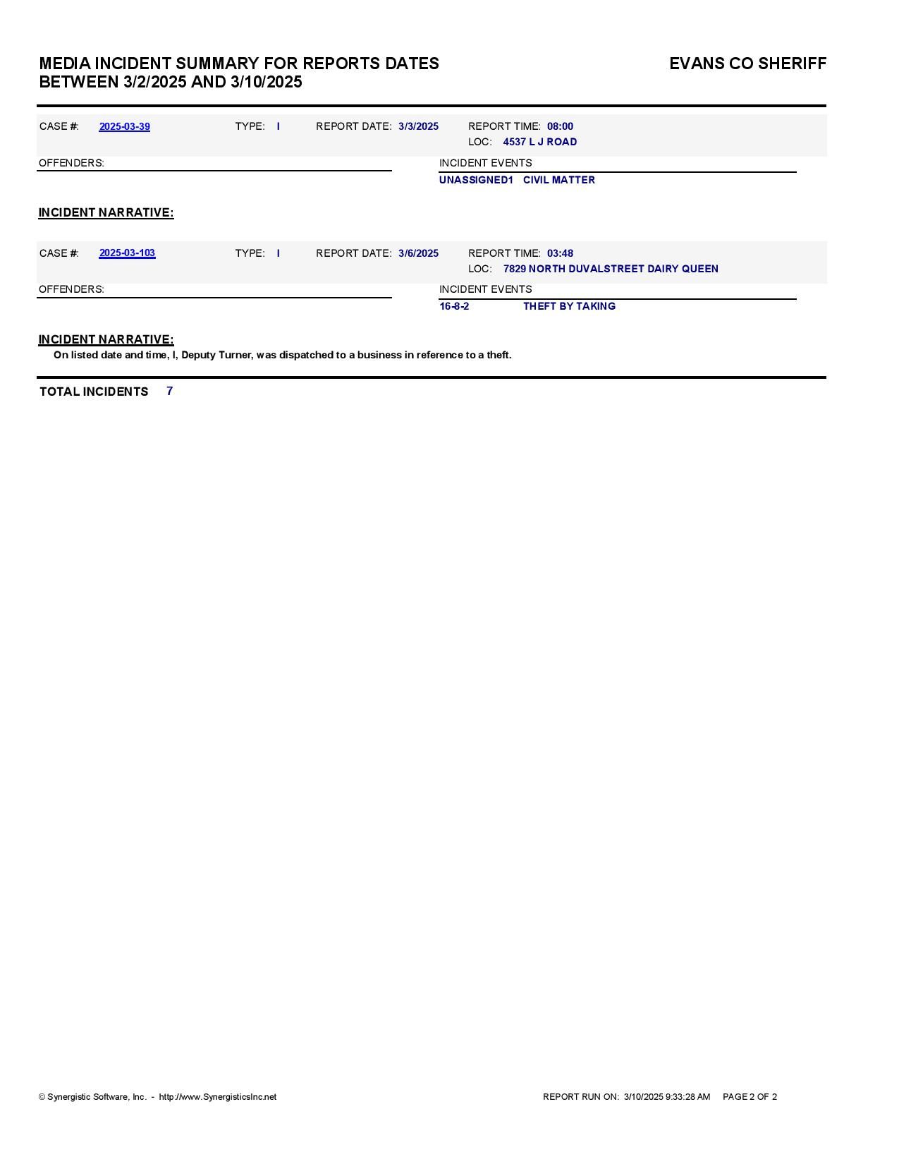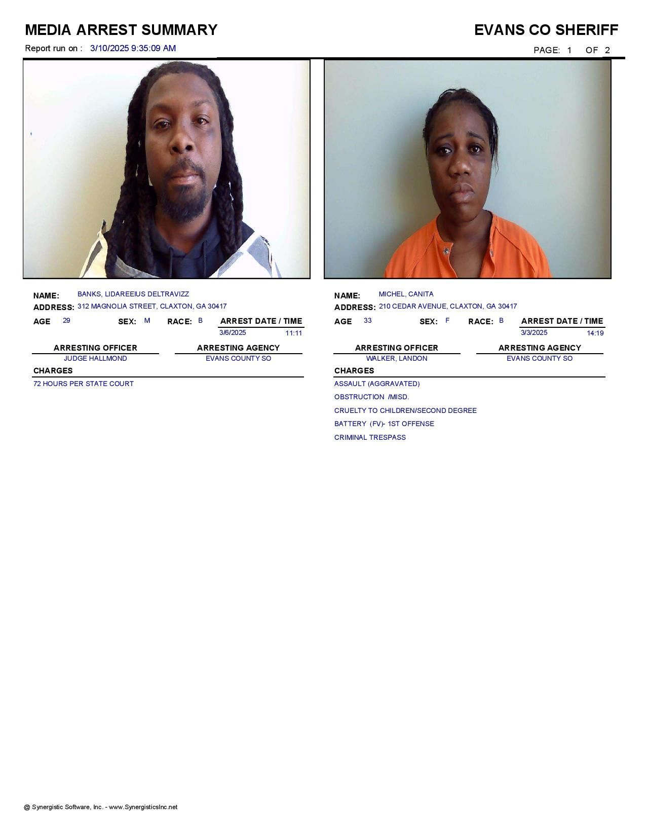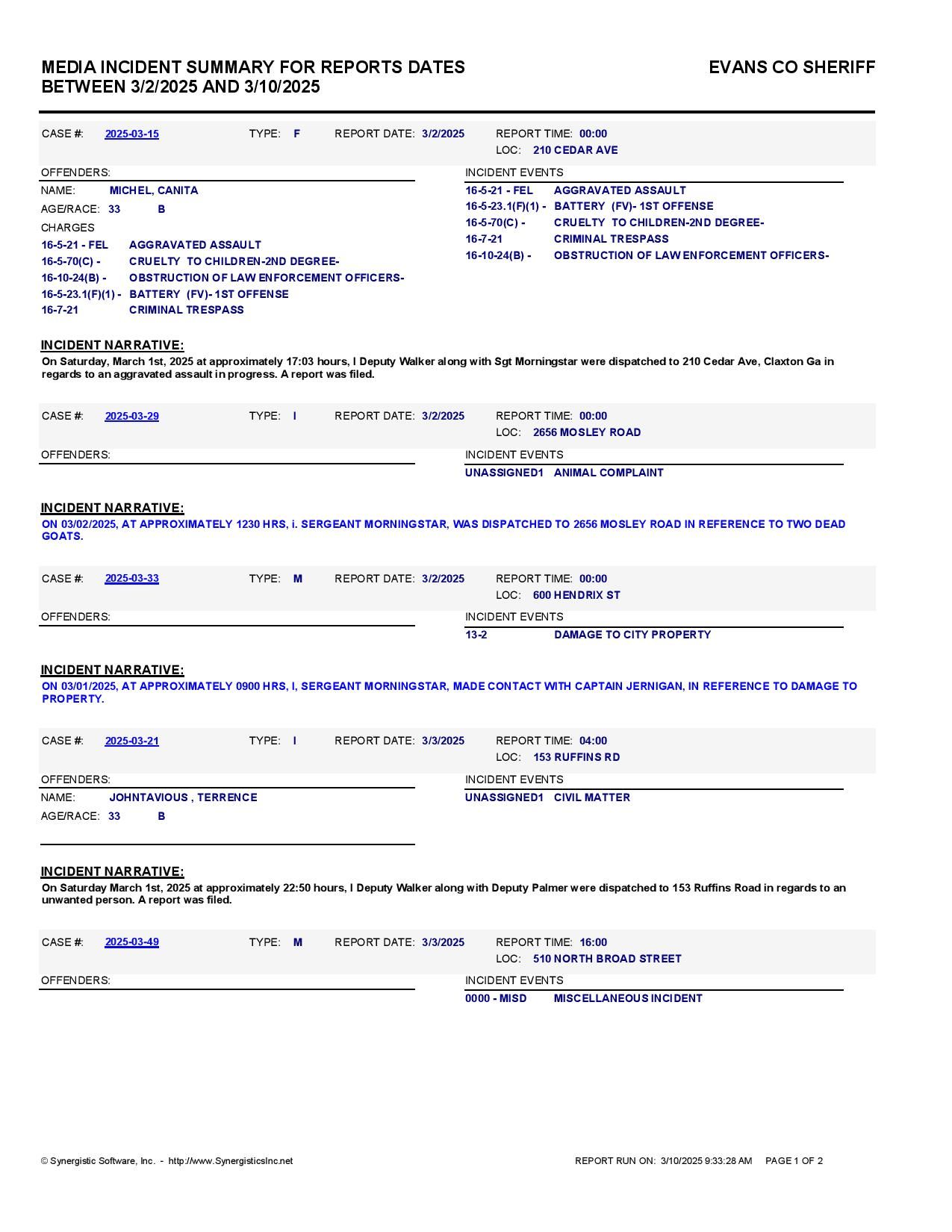 The Evans Co Jail Booking & Incident Report 03/10/25 details arrests from Evans Co., Claxton, Bellville, Hagan, and the Georgia State Patrol. Incident reports are from the Sheriff’s Office only.