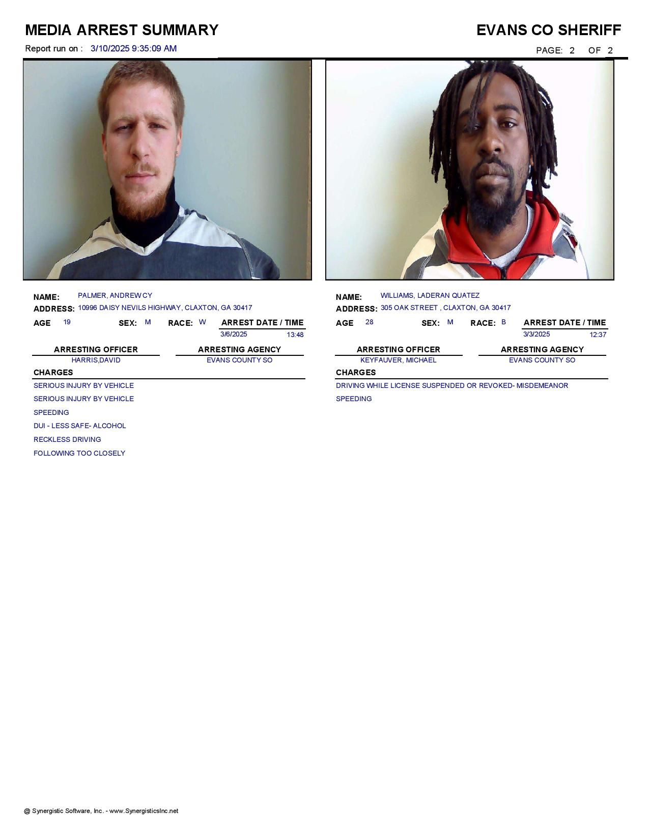 Images from the Evans Co Jail Booking & Incident Report for 03/10/25:
