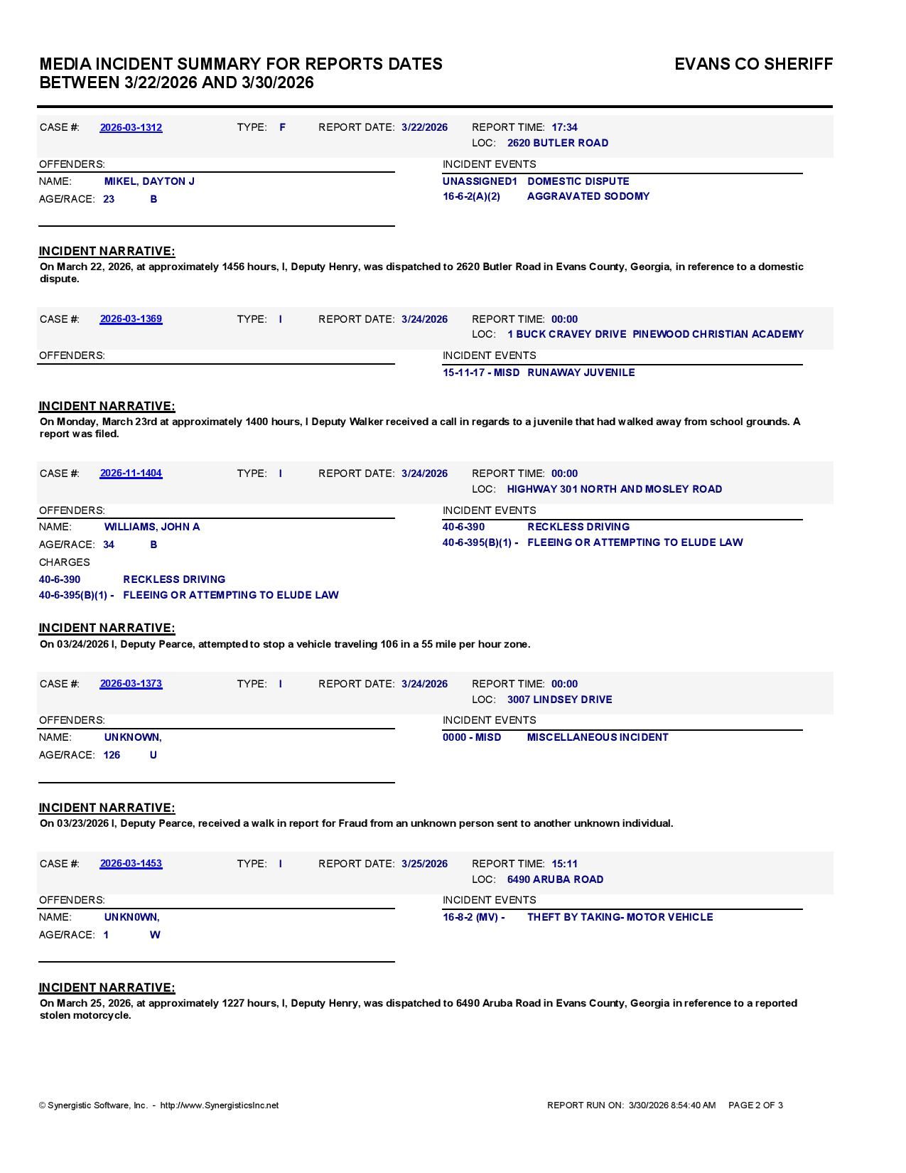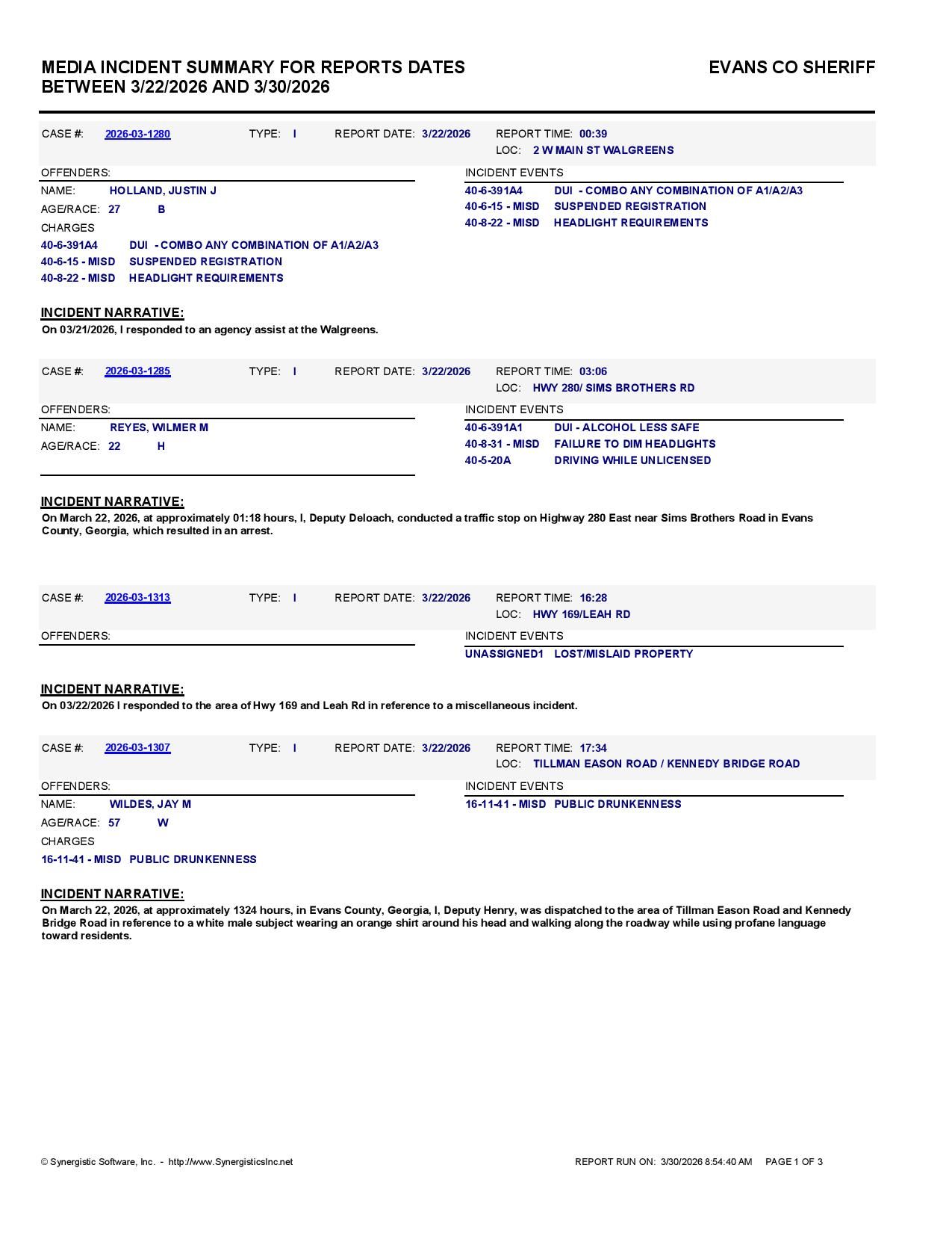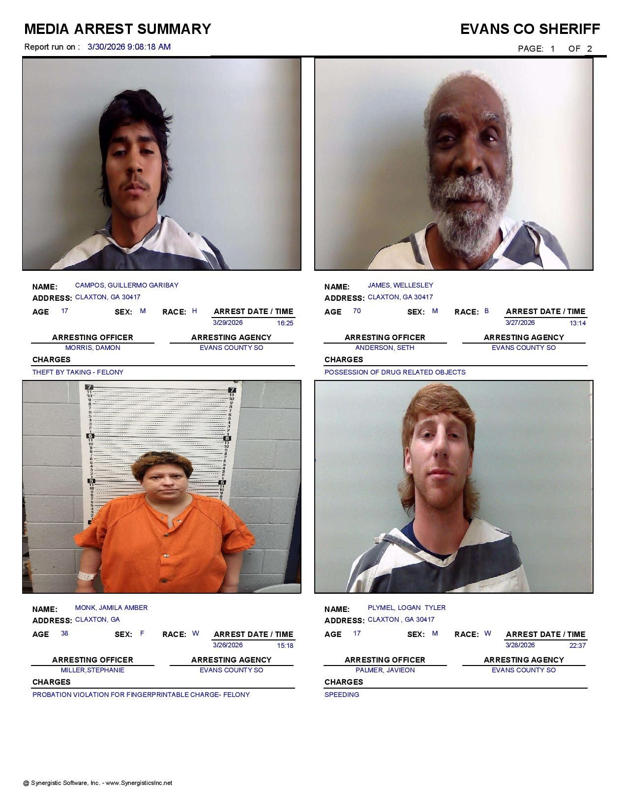 The Evans Co Jail Booking & Incident Report 03/30/26 details arrests from Evans Co., Claxton, Bellville, Hagan, and the Georgia State Patrol. Incident reports are from the Sheriff’s Office only.