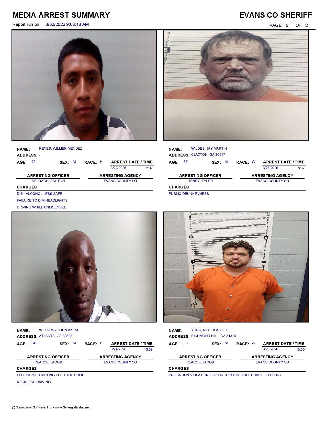 Images from the Evans Co Jail Booking & Incident Report for 03/30/26: