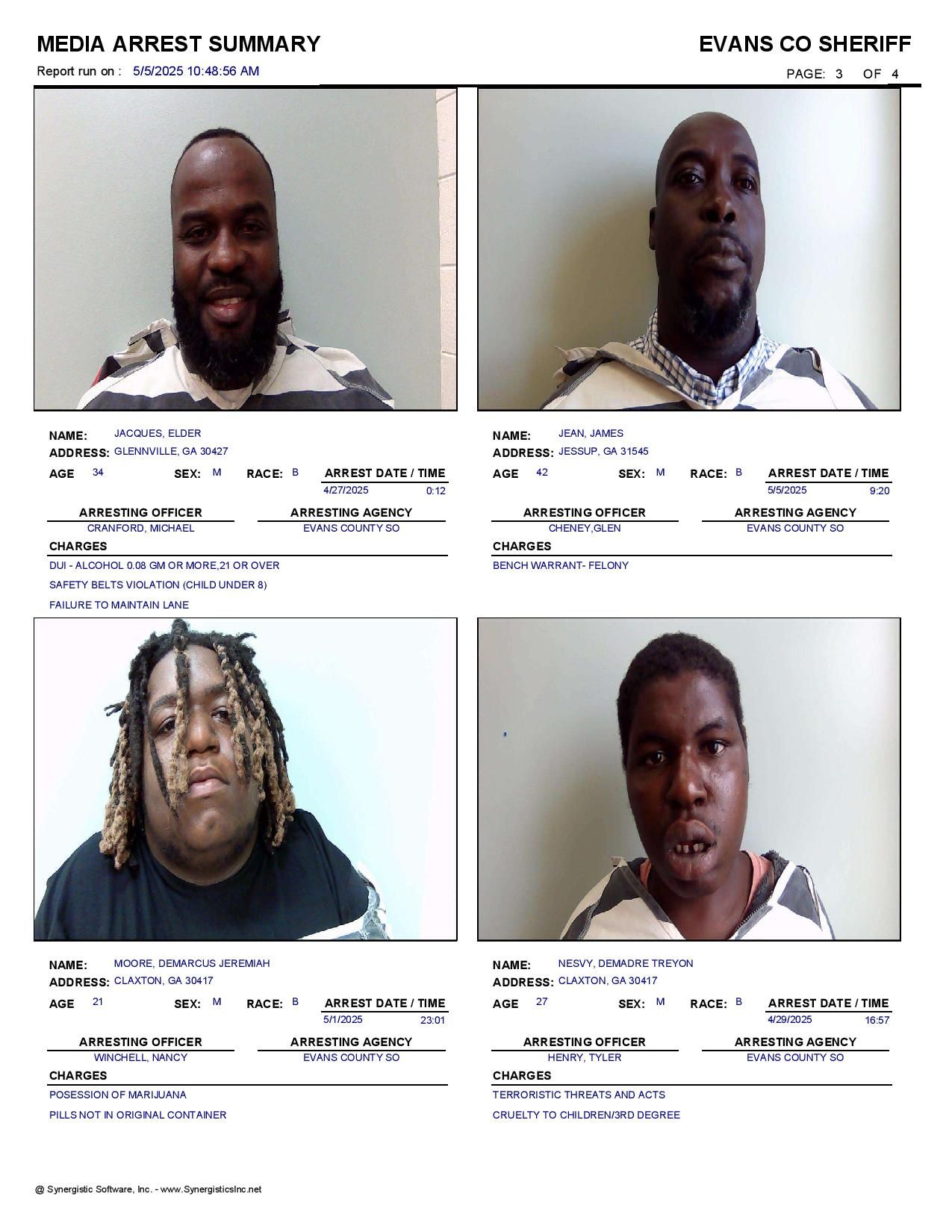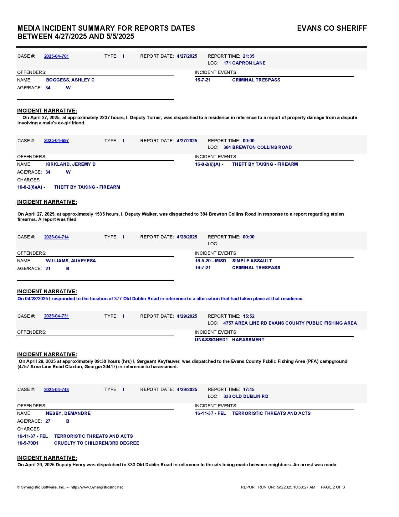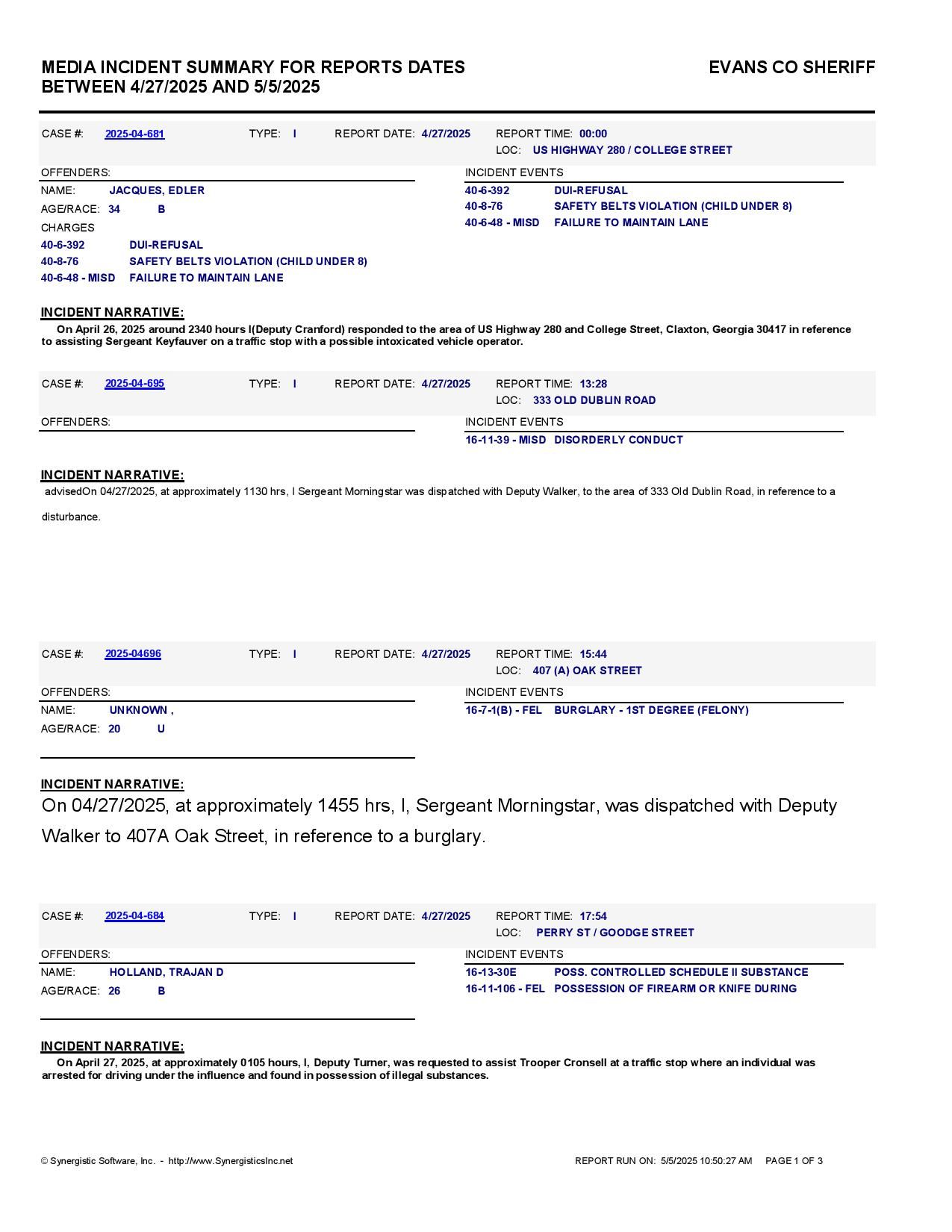The Evans Co Jail Booking & Incident Report 05/05/25 details arrests from Evans Co., Claxton, Bellville, Hagan, and the Georgia State Patrol. Incident reports are from the Sheriff’s Office only.