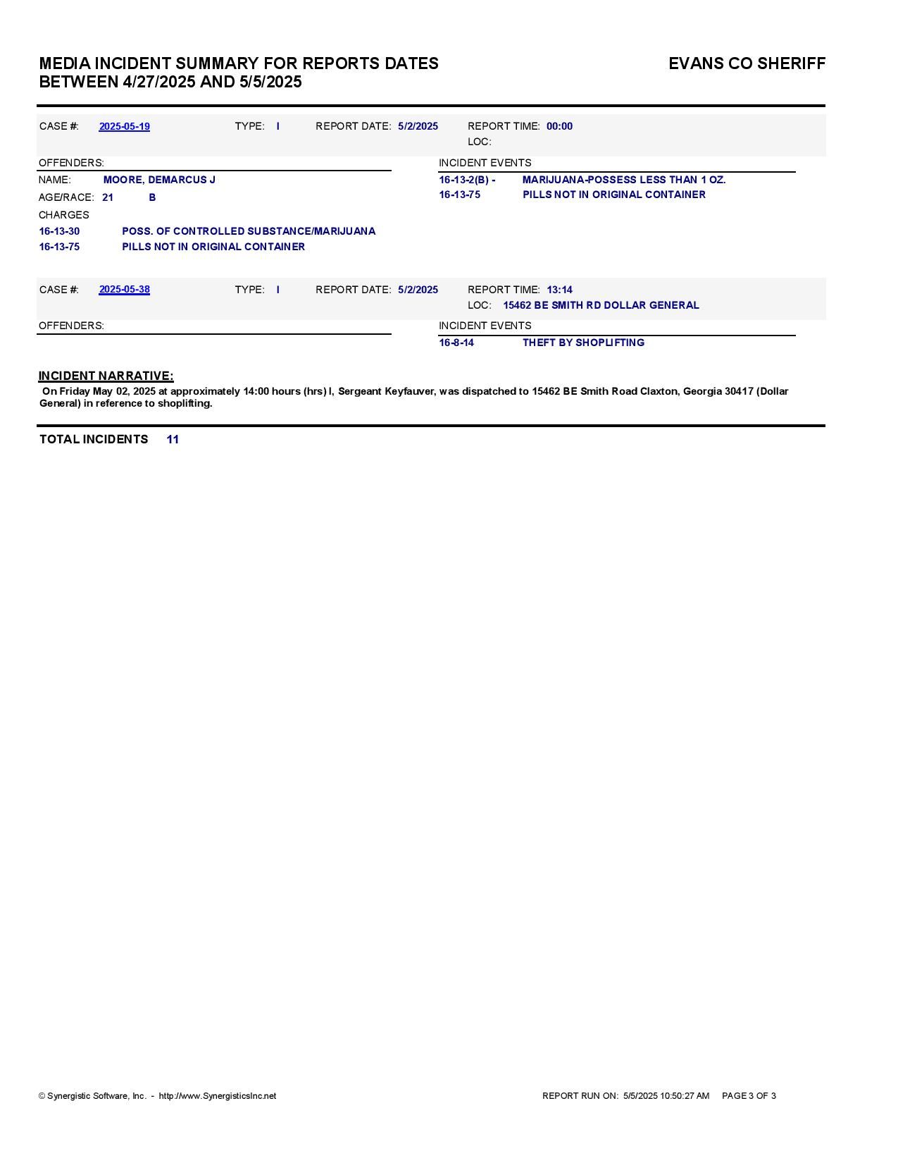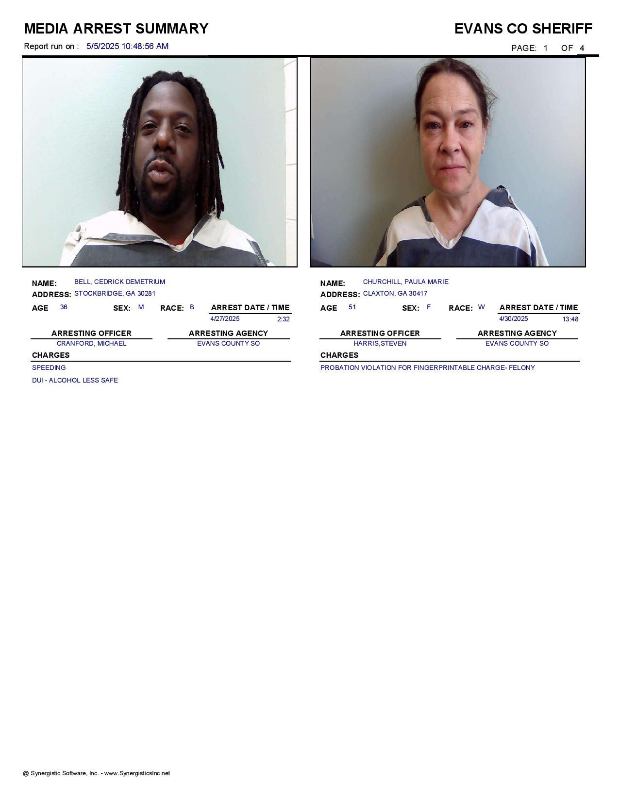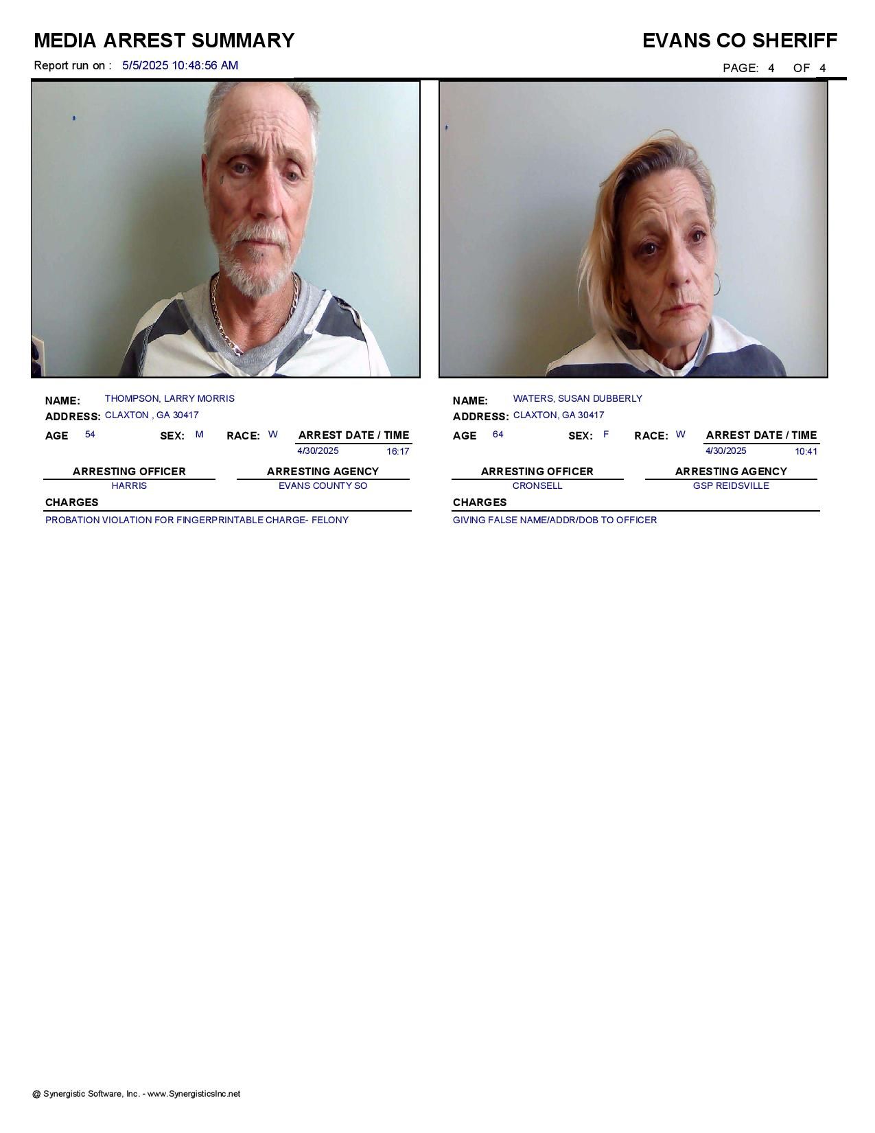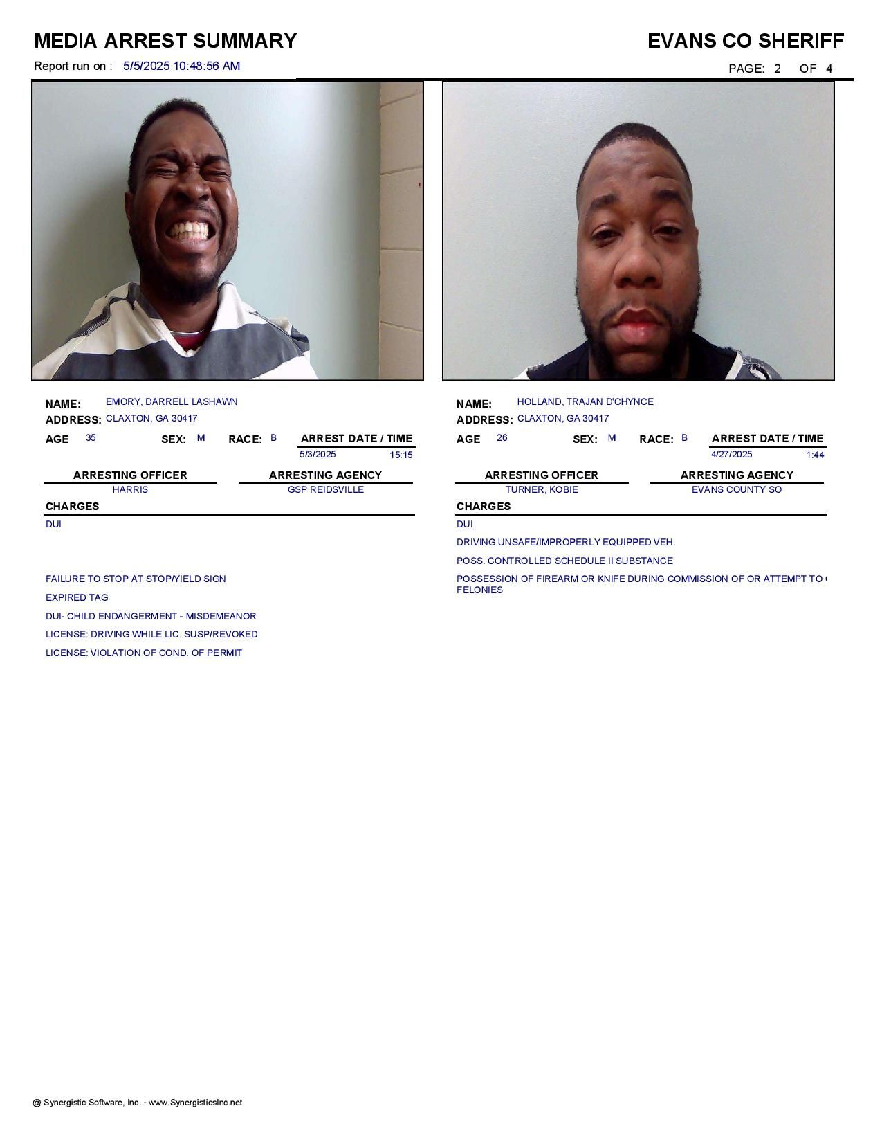 The Evans Co Jail Booking & Incident Report 05/05/25 details arrests from Evans Co., Claxton, Bellville, Hagan, and the Georgia State Patrol. Incident reports are from the Sheriff’s Office only.