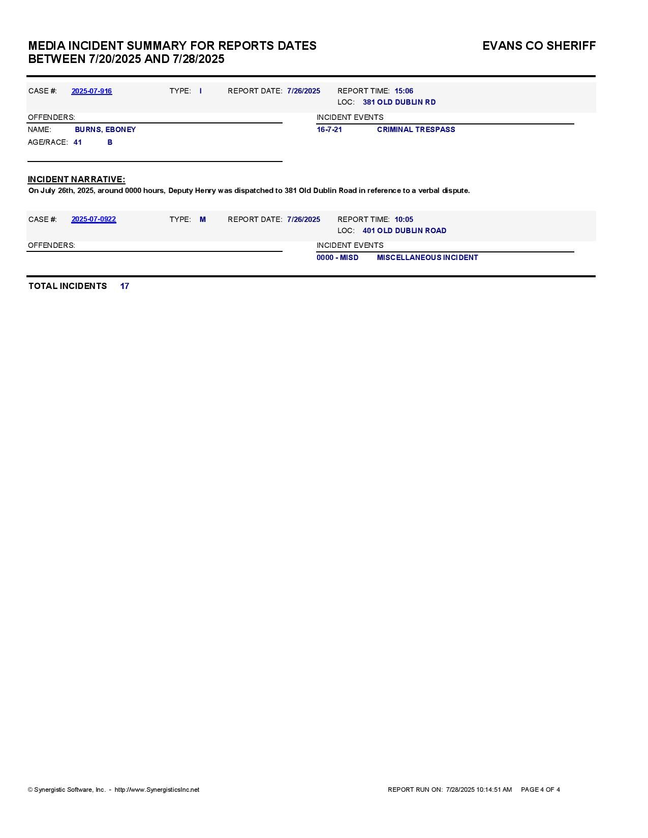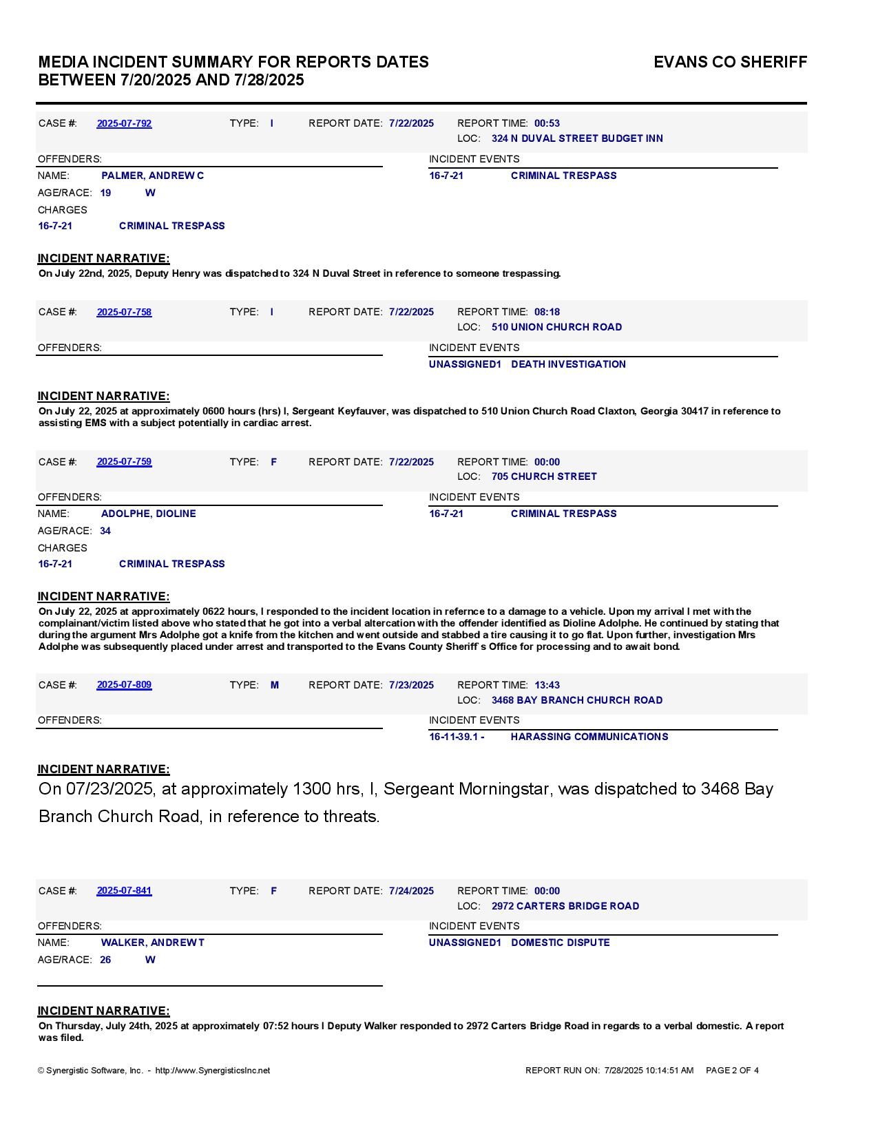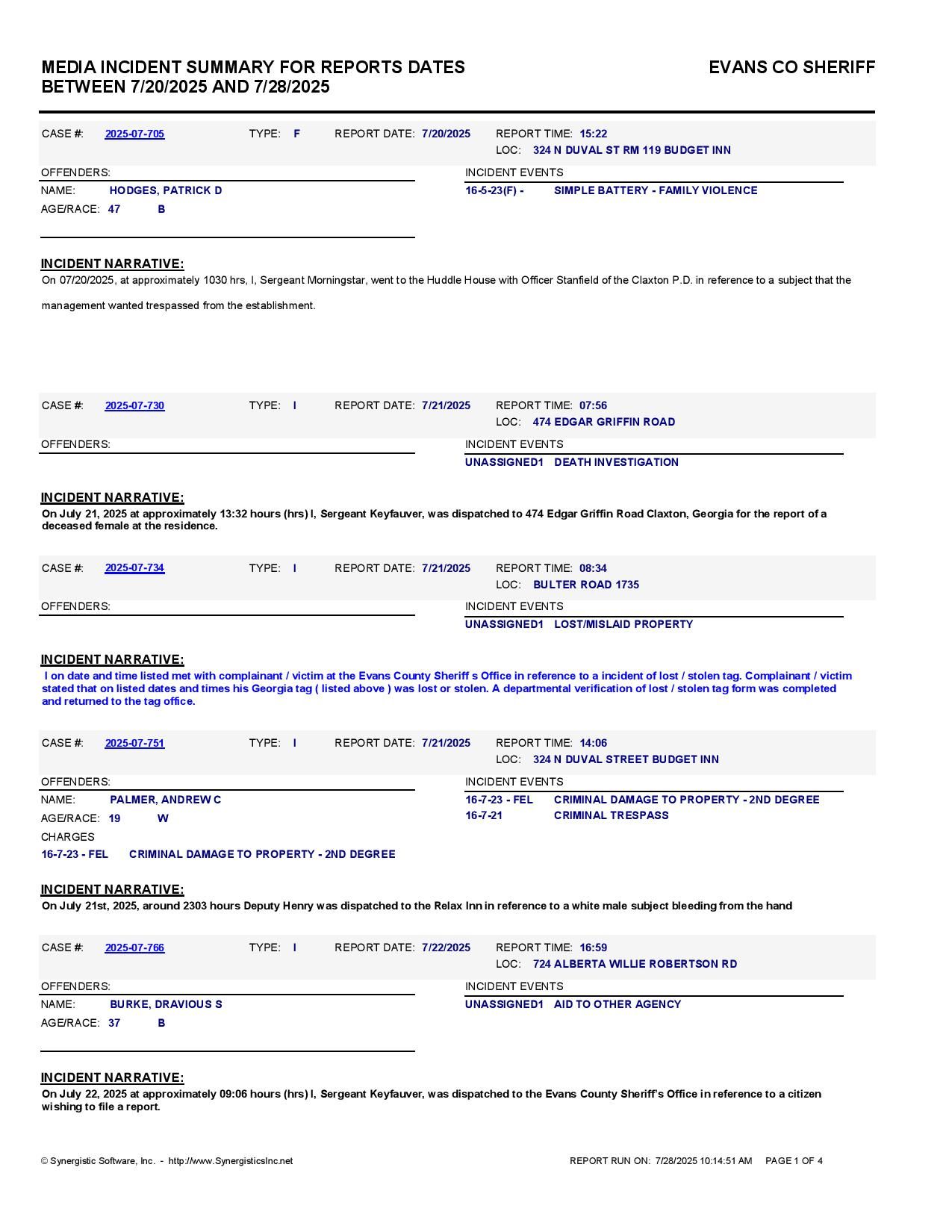 Evans Co. Jail Booking & Incident Report – 07/28/25