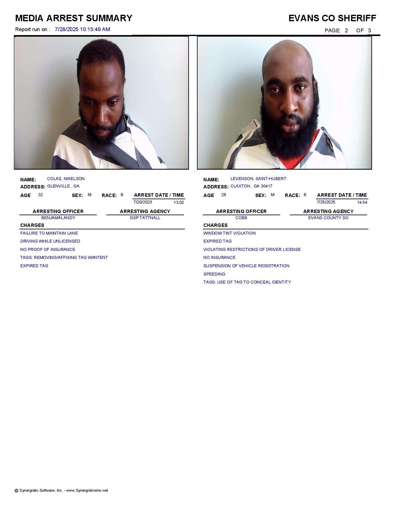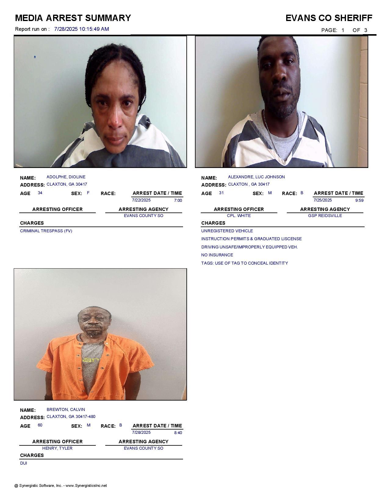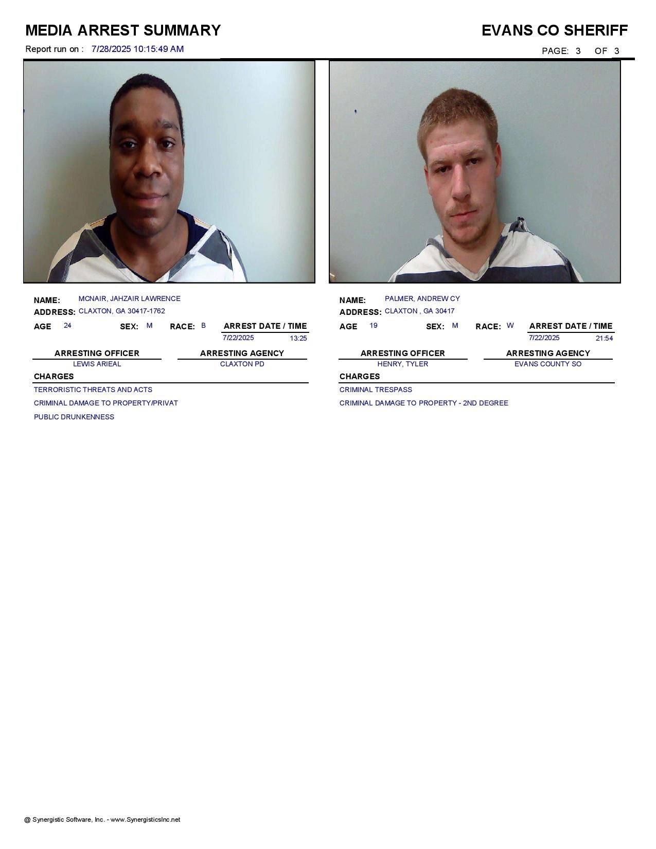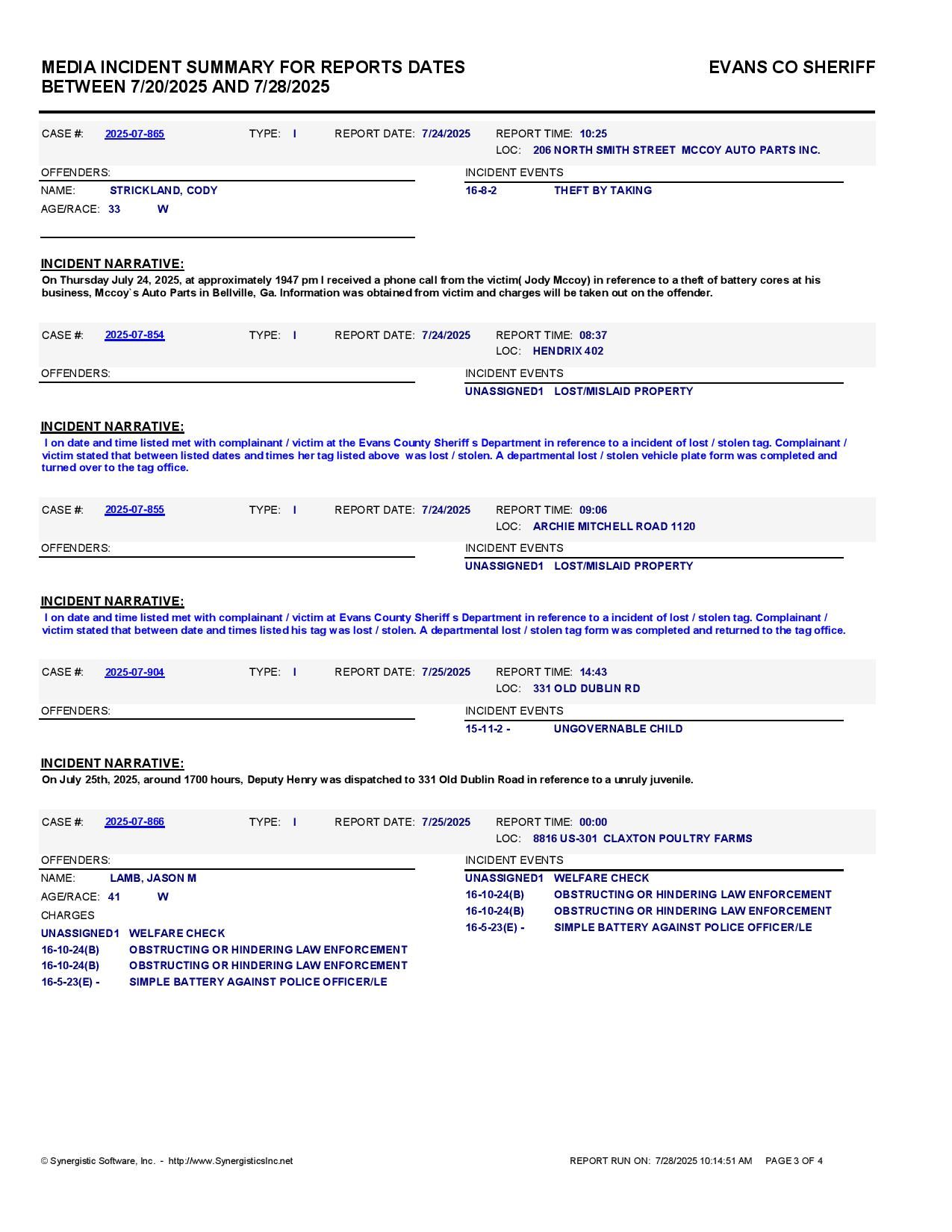 The Evans Co Jail Booking & Incident Report 07/28/25 details arrests from Evans Co., Claxton, Bellville, Hagan, and the Georgia State Patrol. Incident reports are from the Sheriff’s Office only.