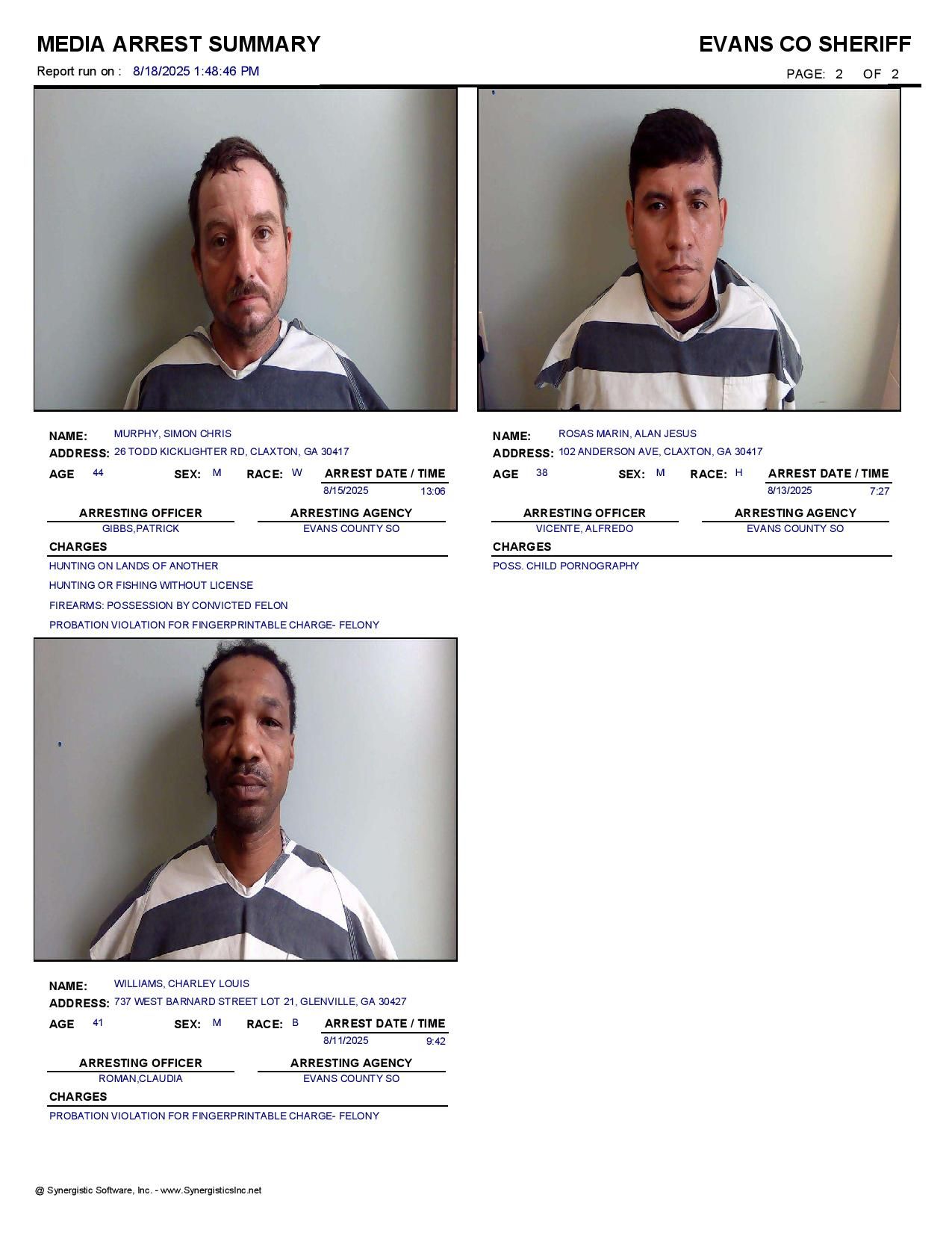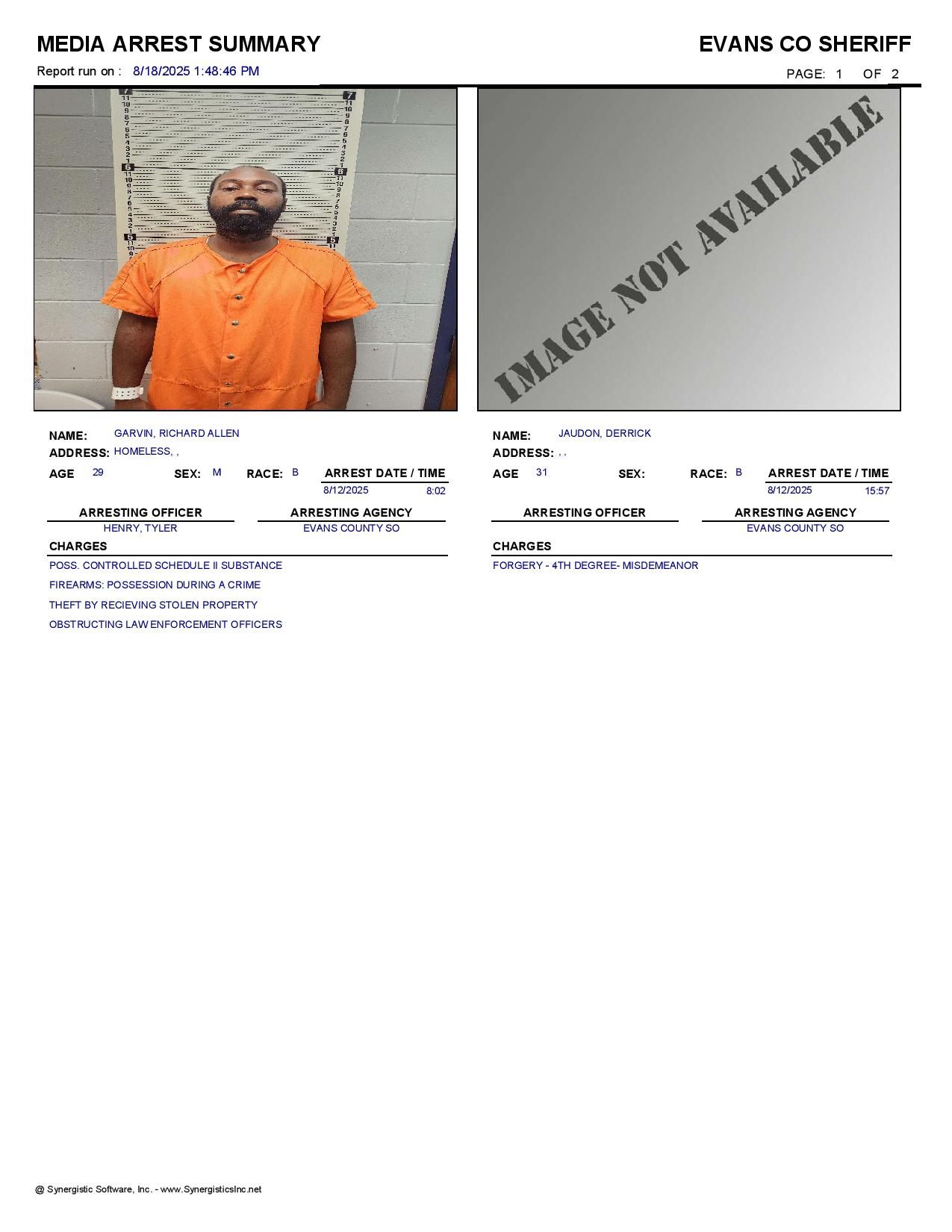 Images from the Evans Co Jail Booking & Incident Report for 08/18/25:
