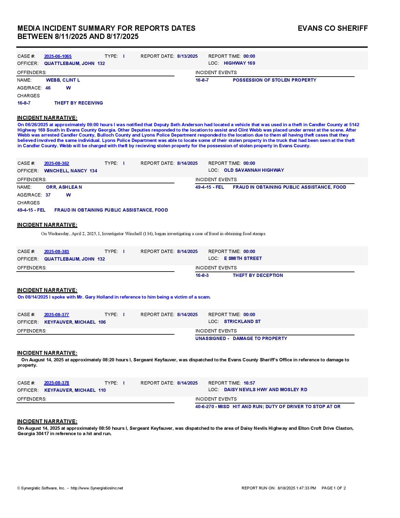 The Evans Co Jail Booking & Incident Report 08/18/25 details arrests from Evans Co., Claxton, Bellville, Hagan, and the Georgia State Patrol. Incident reports are from the Sheriff’s Office only.