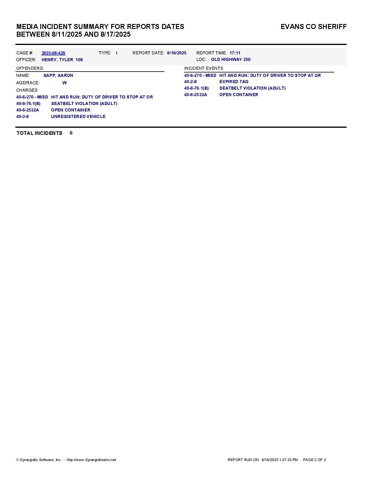 Evans Co. Jail Booking & Incident Report – 08/18/25