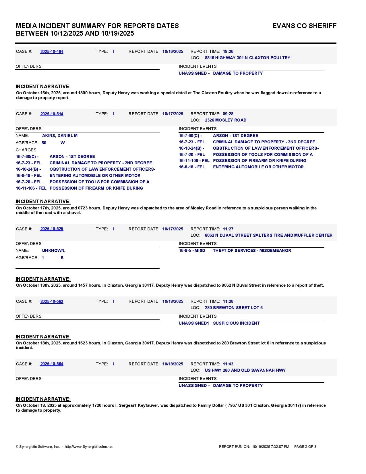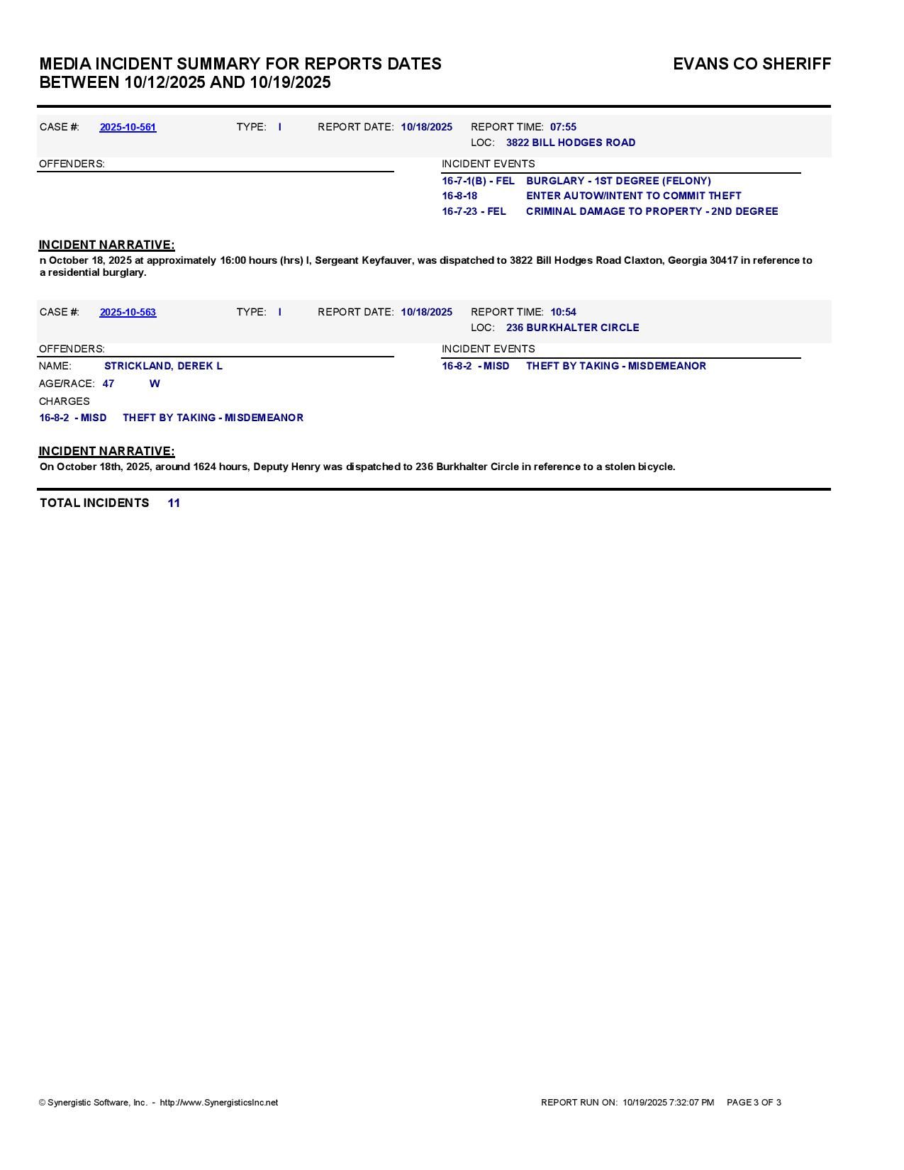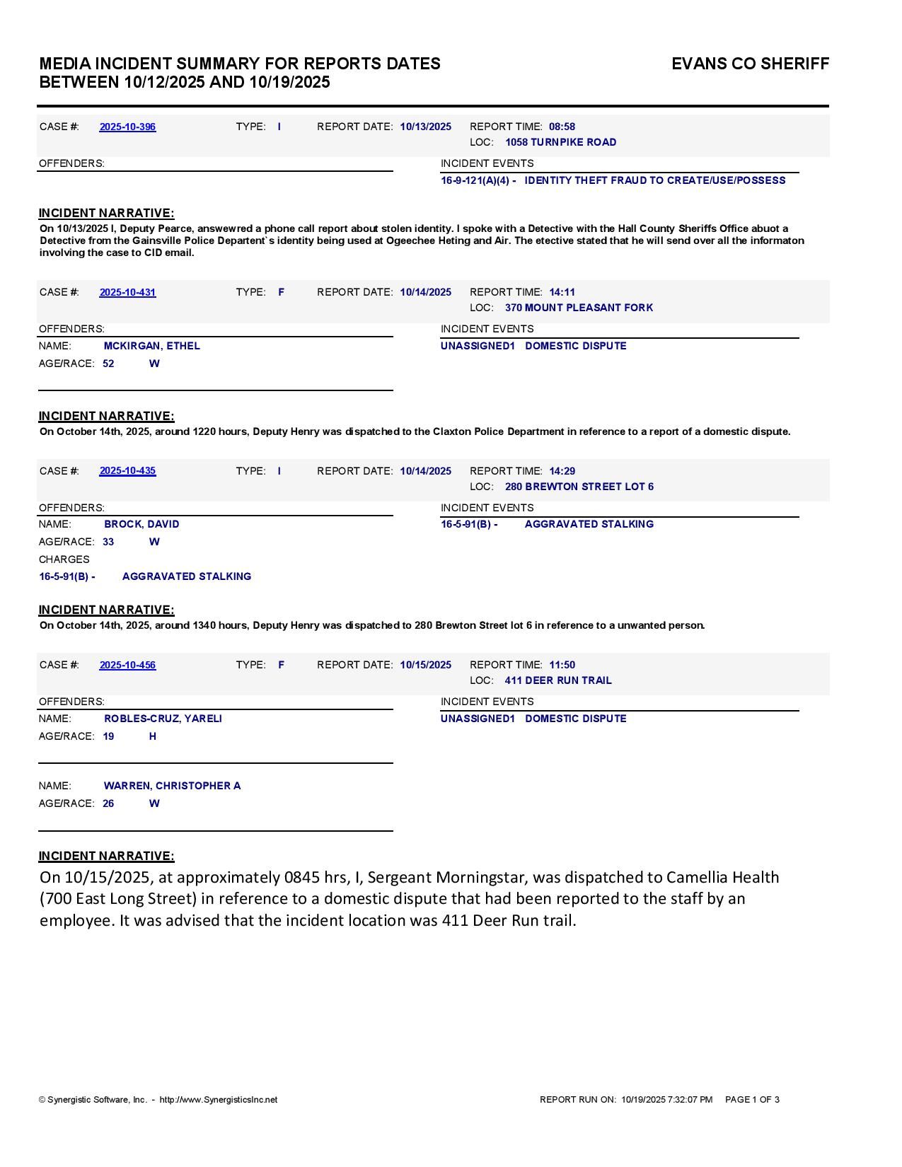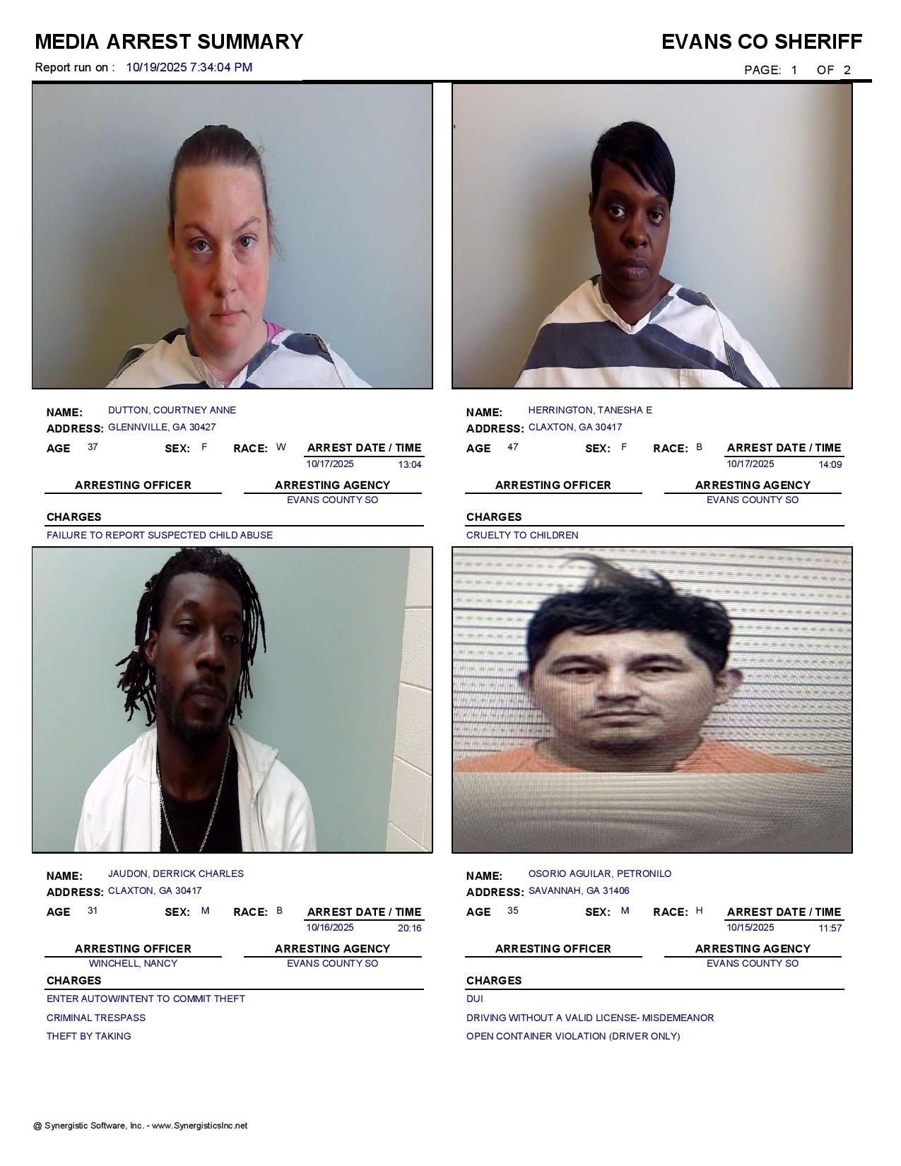 The Evans Co Jail Booking & Incident Report 10/20/25 details arrests from Evans Co., Claxton, Bellville, Hagan, and the Georgia State Patrol. Incident reports are from the Sheriff’s Office only.