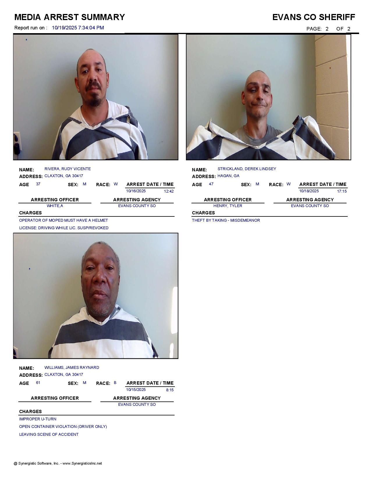 Images from the Evans Co Jail Booking & Incident Report for 10/20/25: