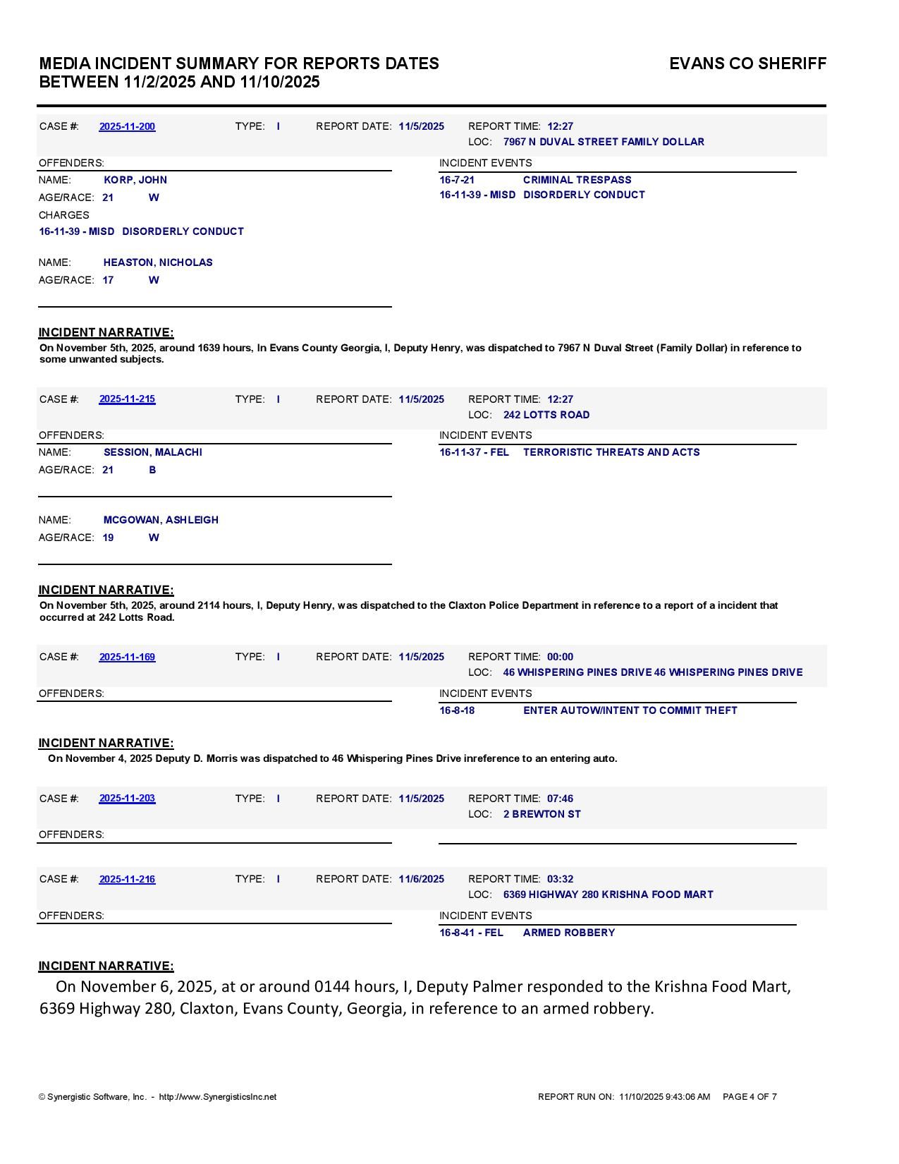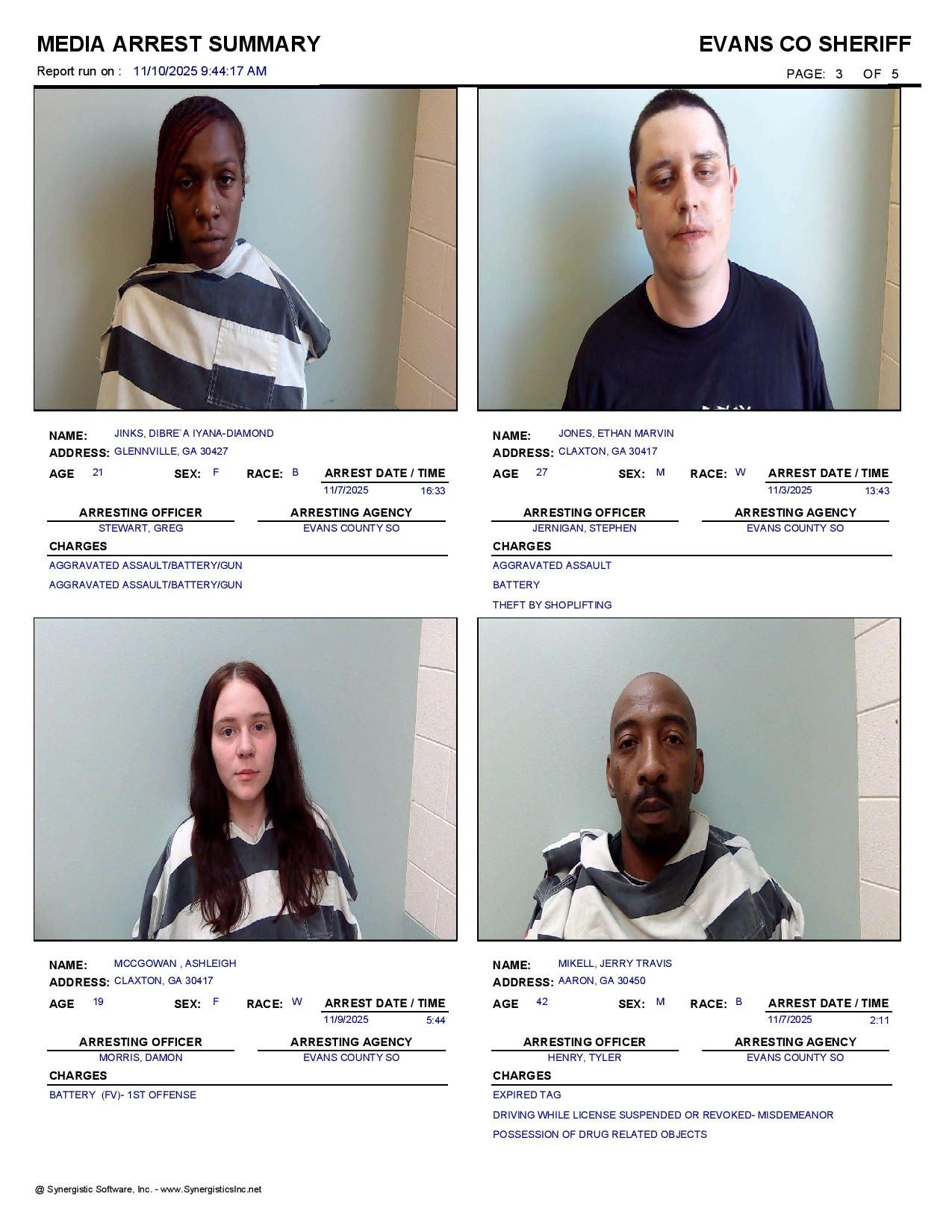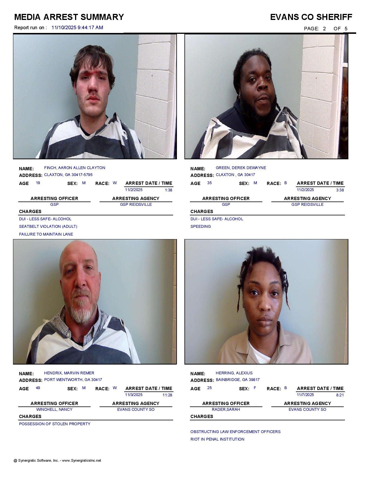 The Evans Co Jail Booking & Incident Report 11/10/25 details arrests from Evans Co., Claxton, Bellville, Hagan, and the Georgia State Patrol. Incident reports are from the Sheriff’s Office only.