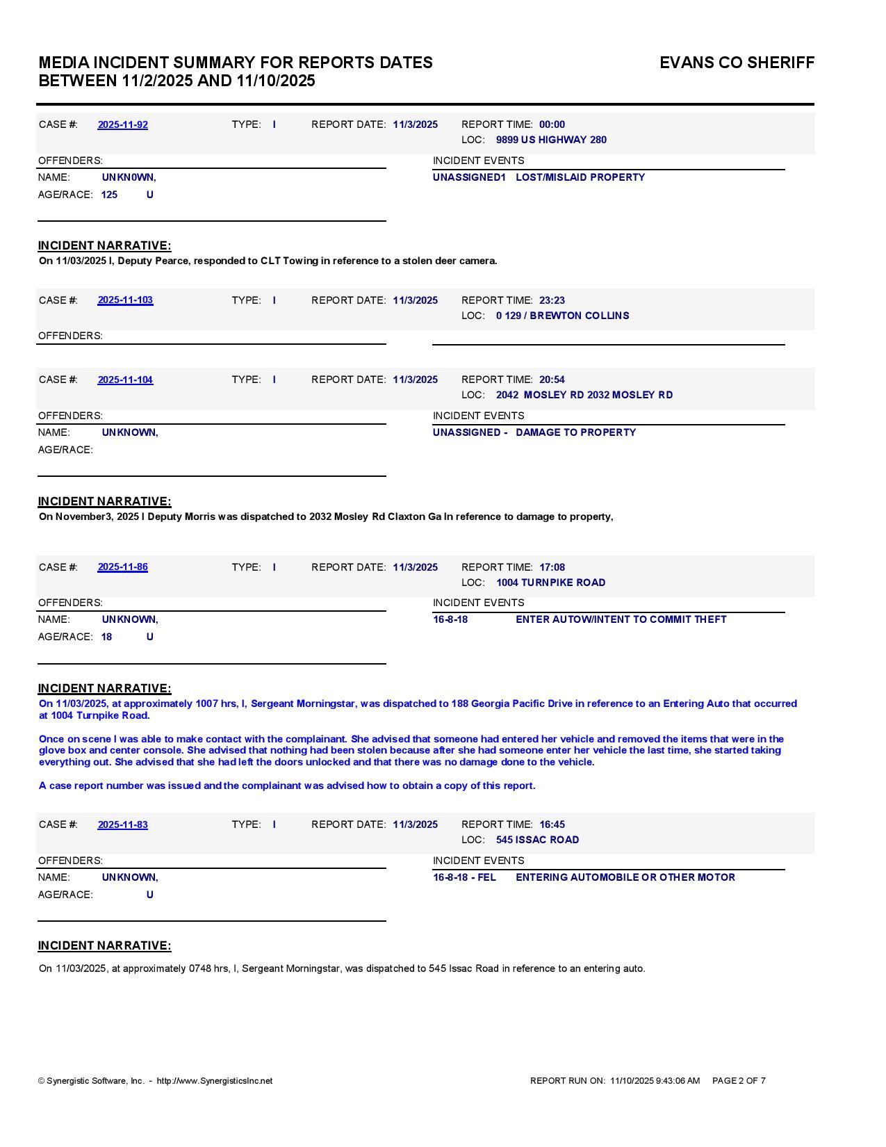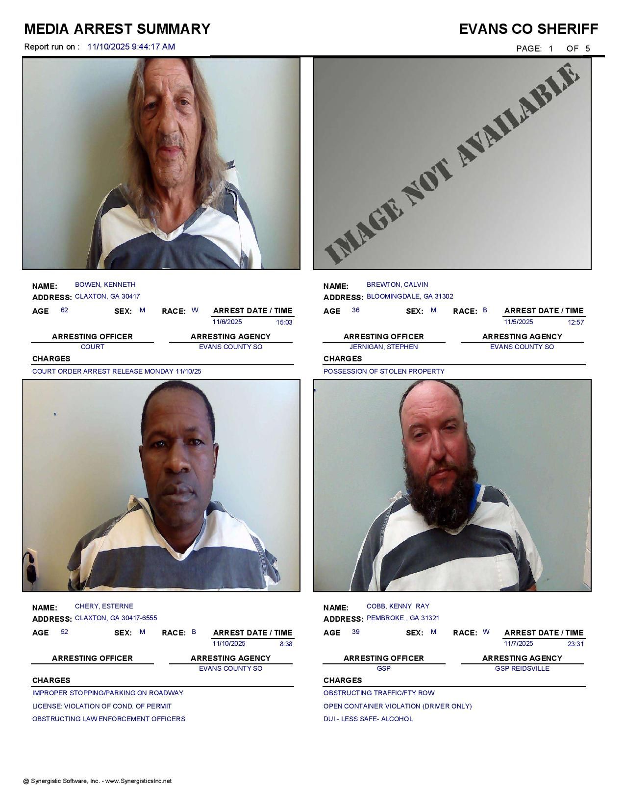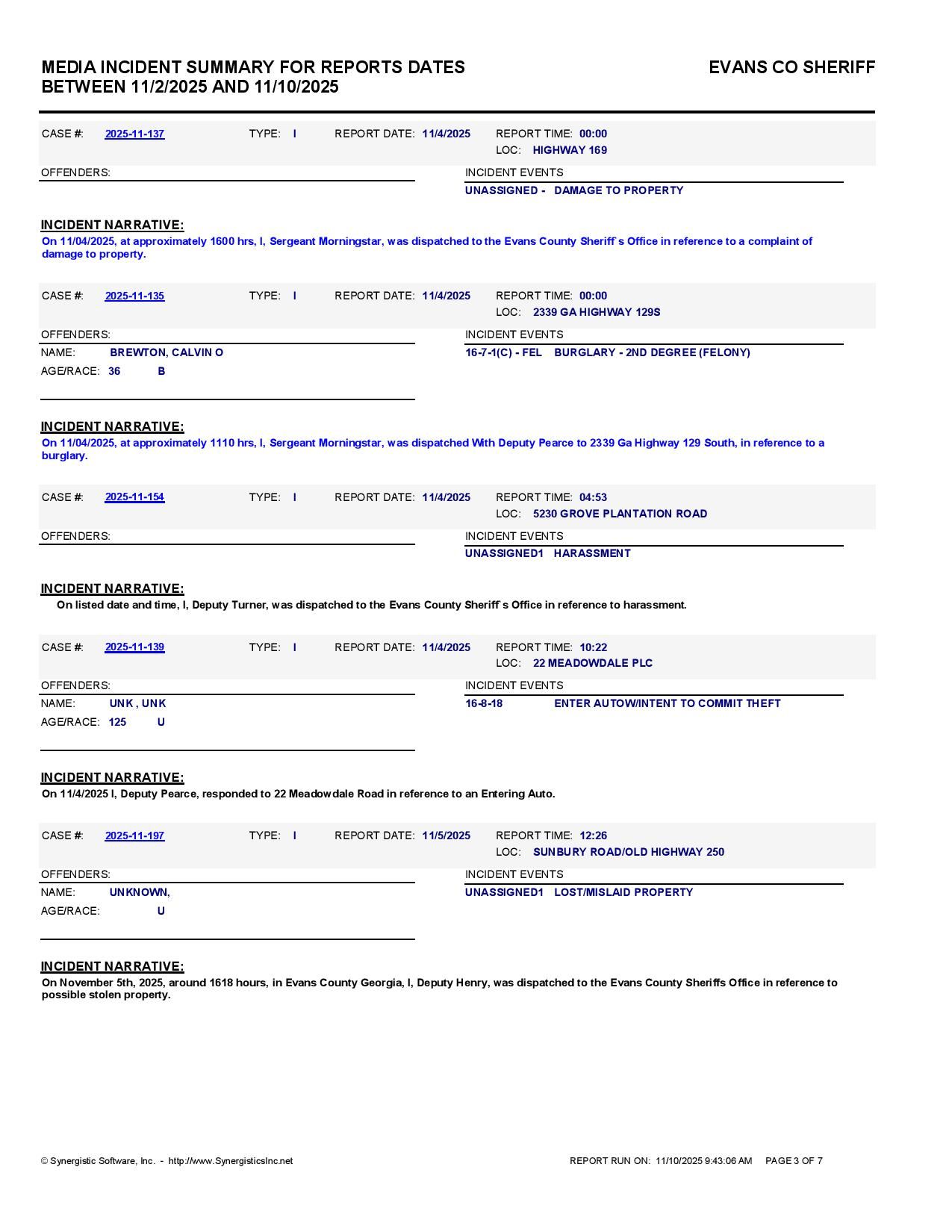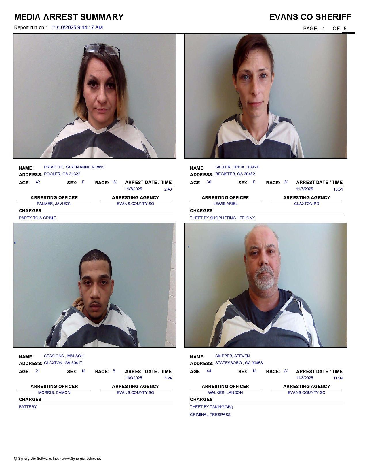 The Evans Co Jail Booking & Incident Report 11/10/25 details arrests from Evans Co., Claxton, Bellville, Hagan, and the Georgia State Patrol. Incident reports are from the Sheriff’s Office only.
