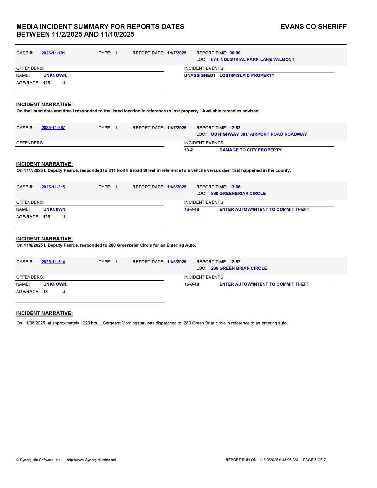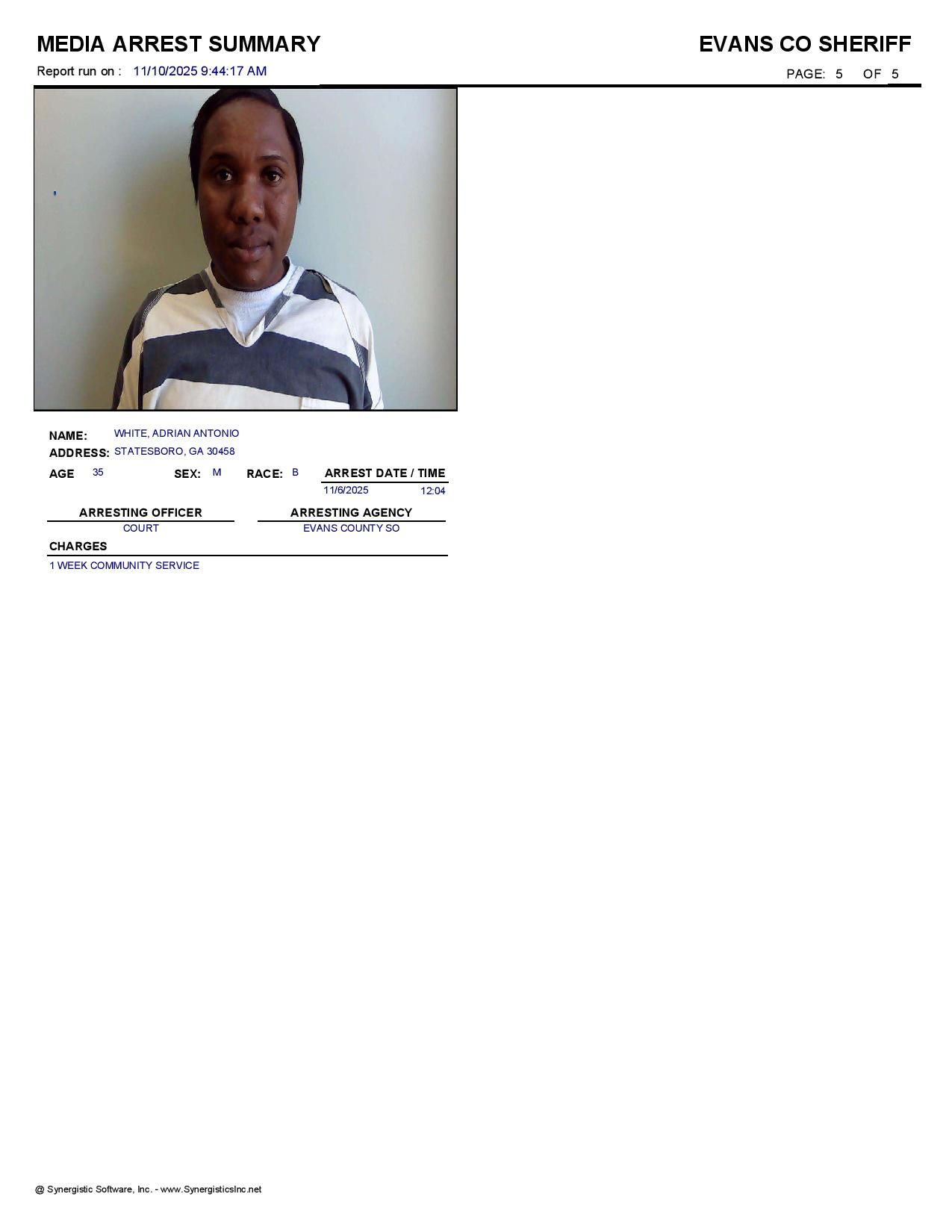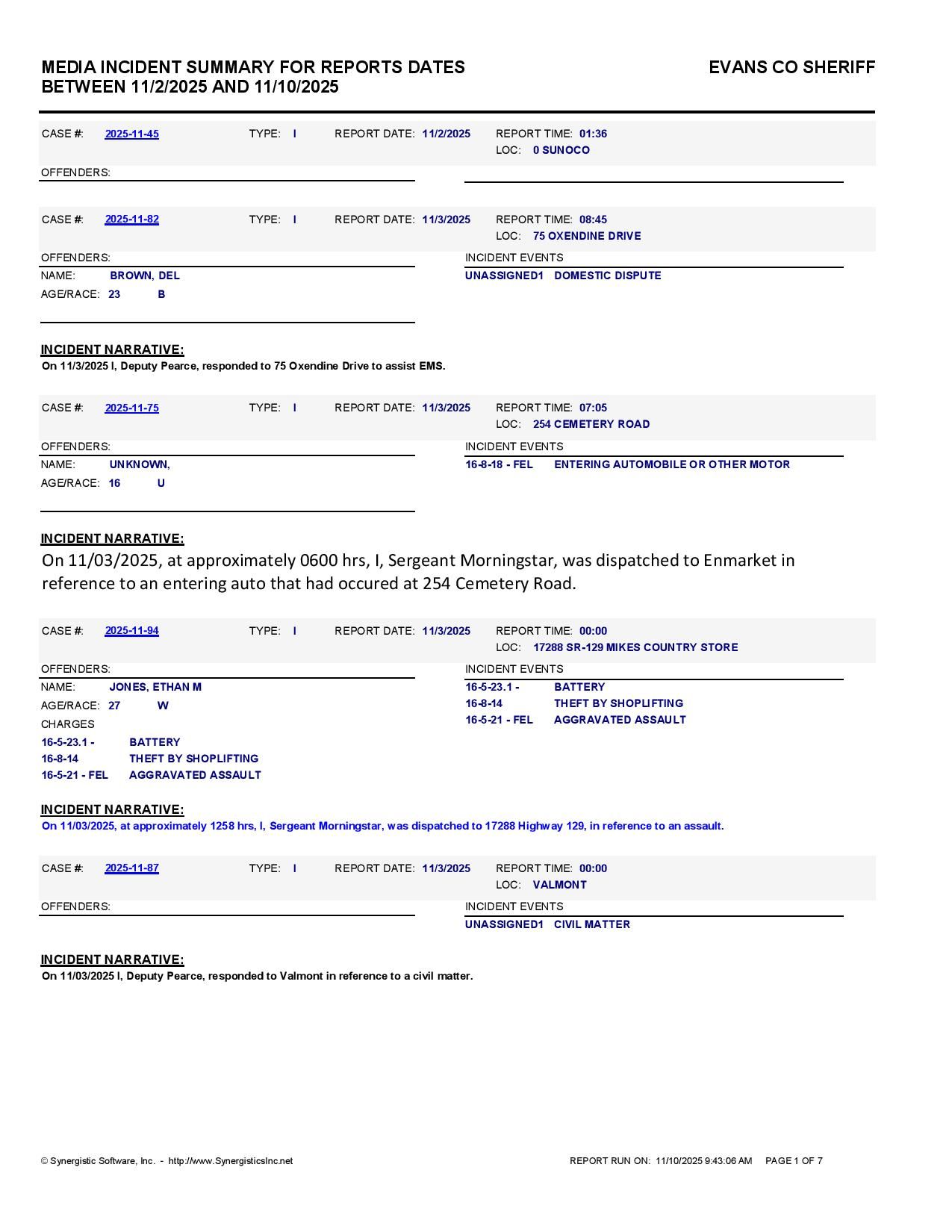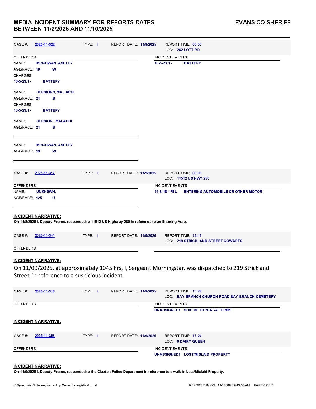 Evans Co. Jail Booking & Incident Report – 11/10/25