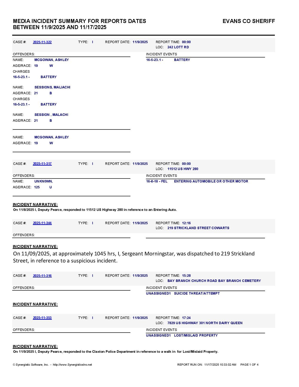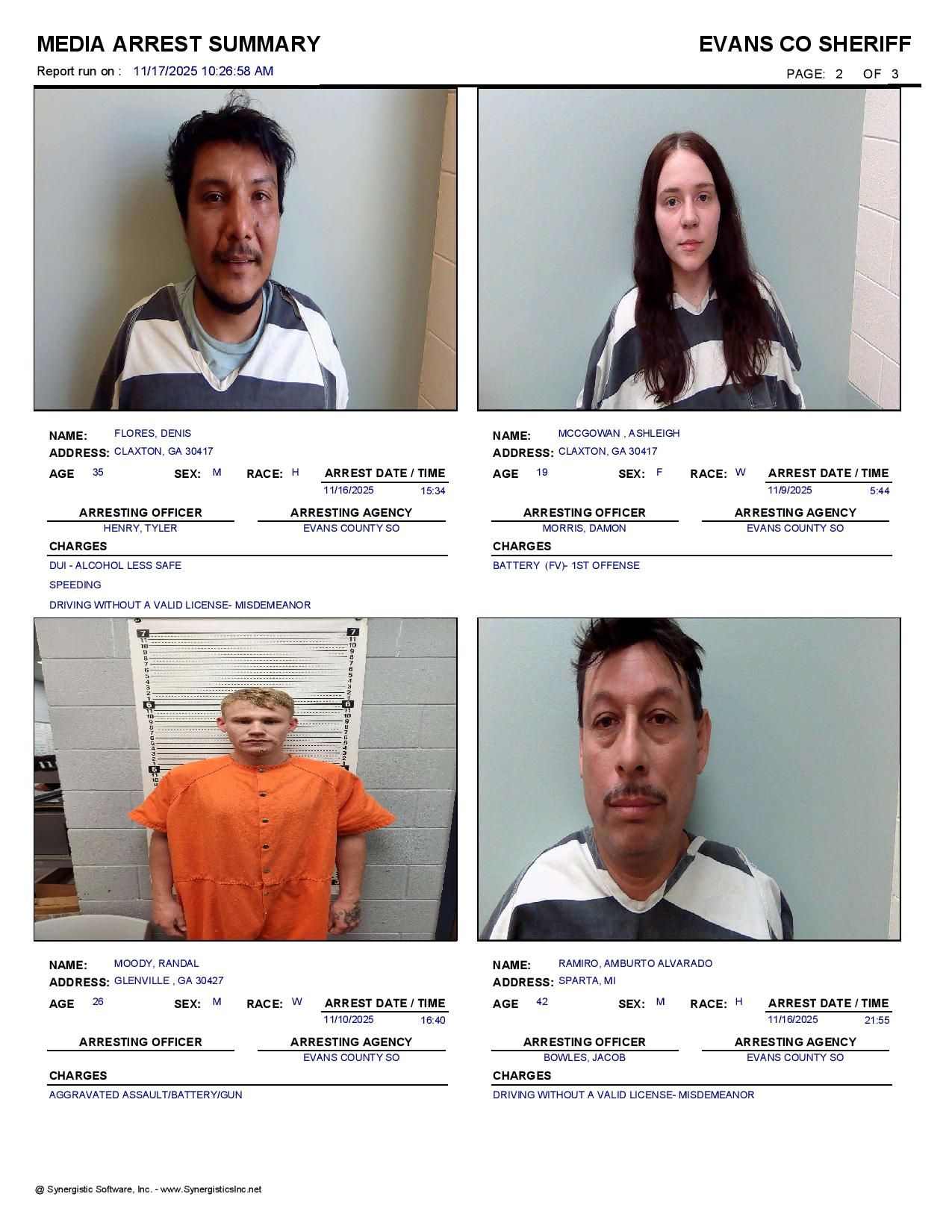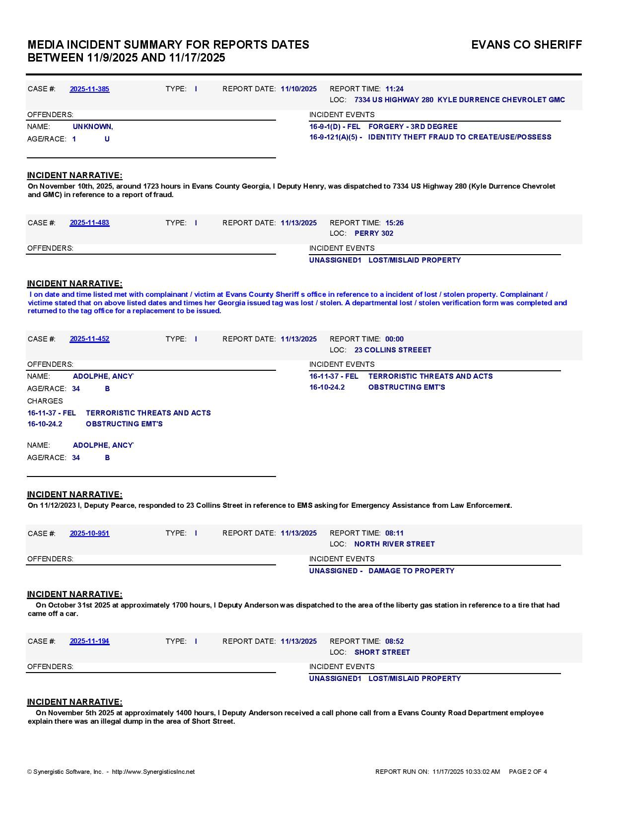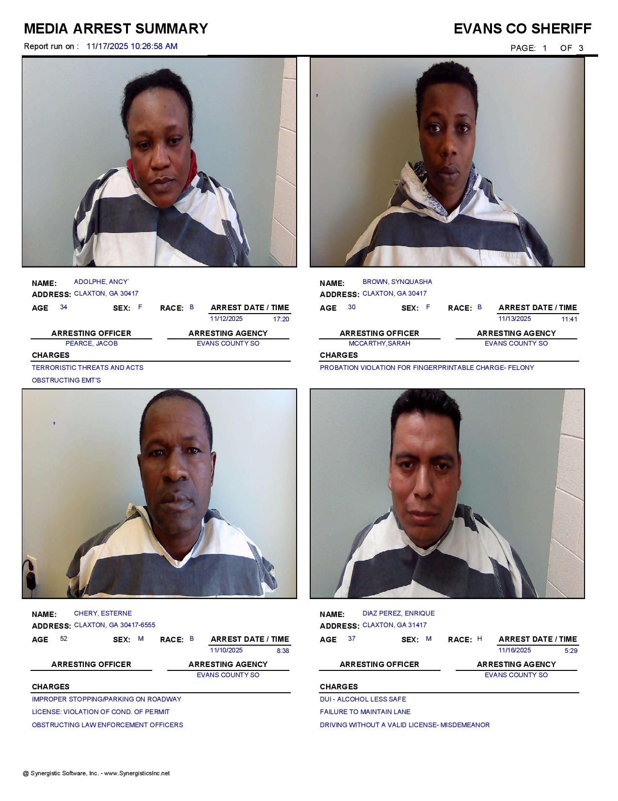 The Evans Co Jail Booking & Incident Report 11/17/25 details arrests from Evans Co., Claxton, Bellville, Hagan, and the Georgia State Patrol. Incident reports are from the Sheriff’s Office only.