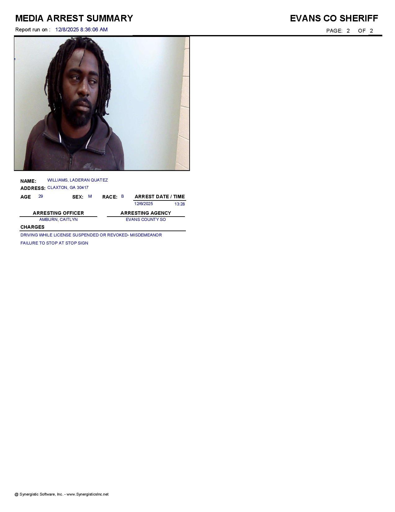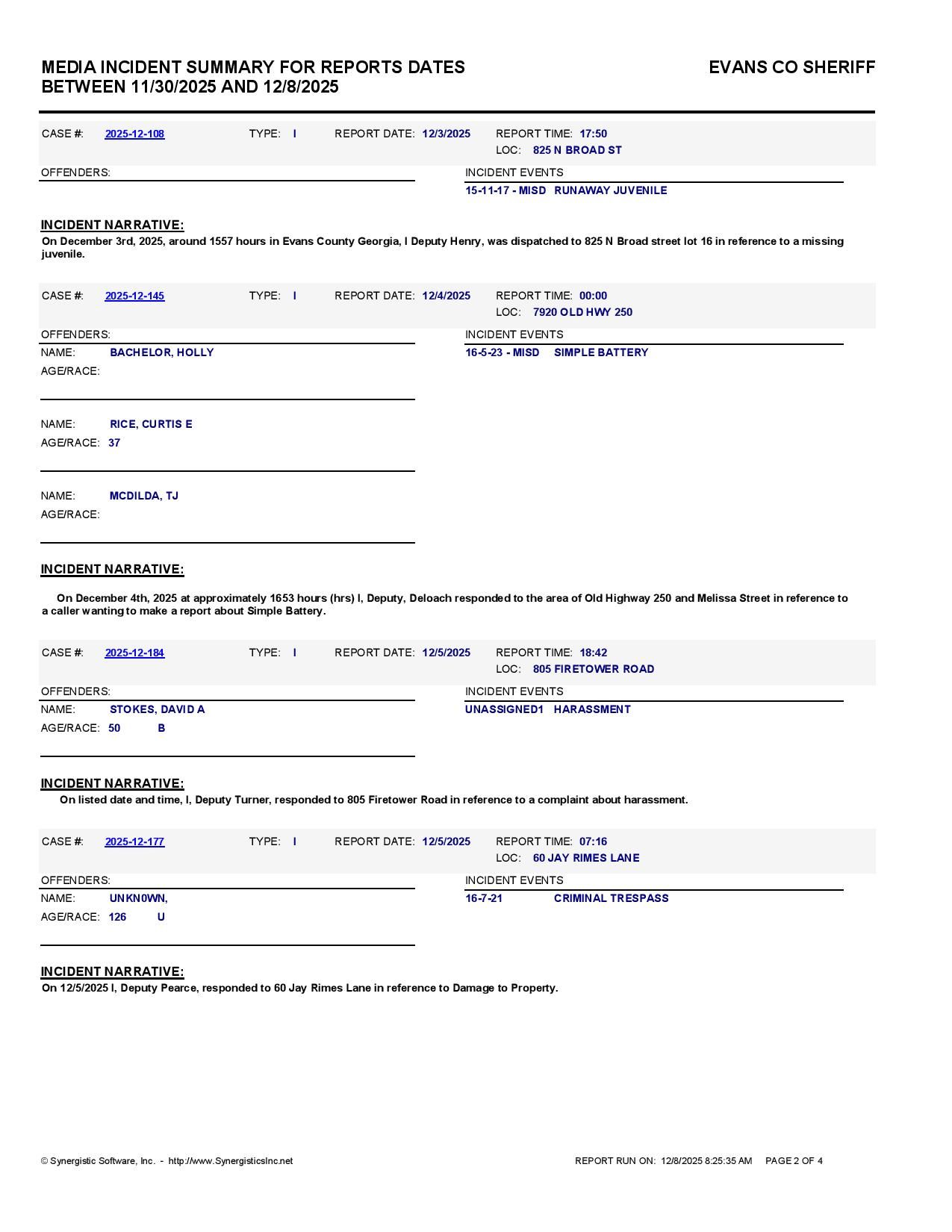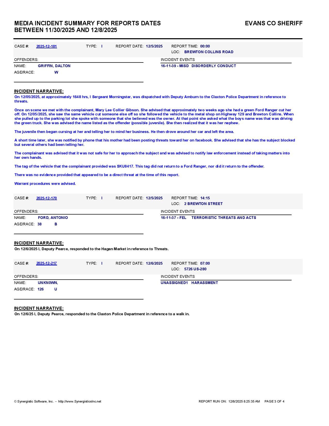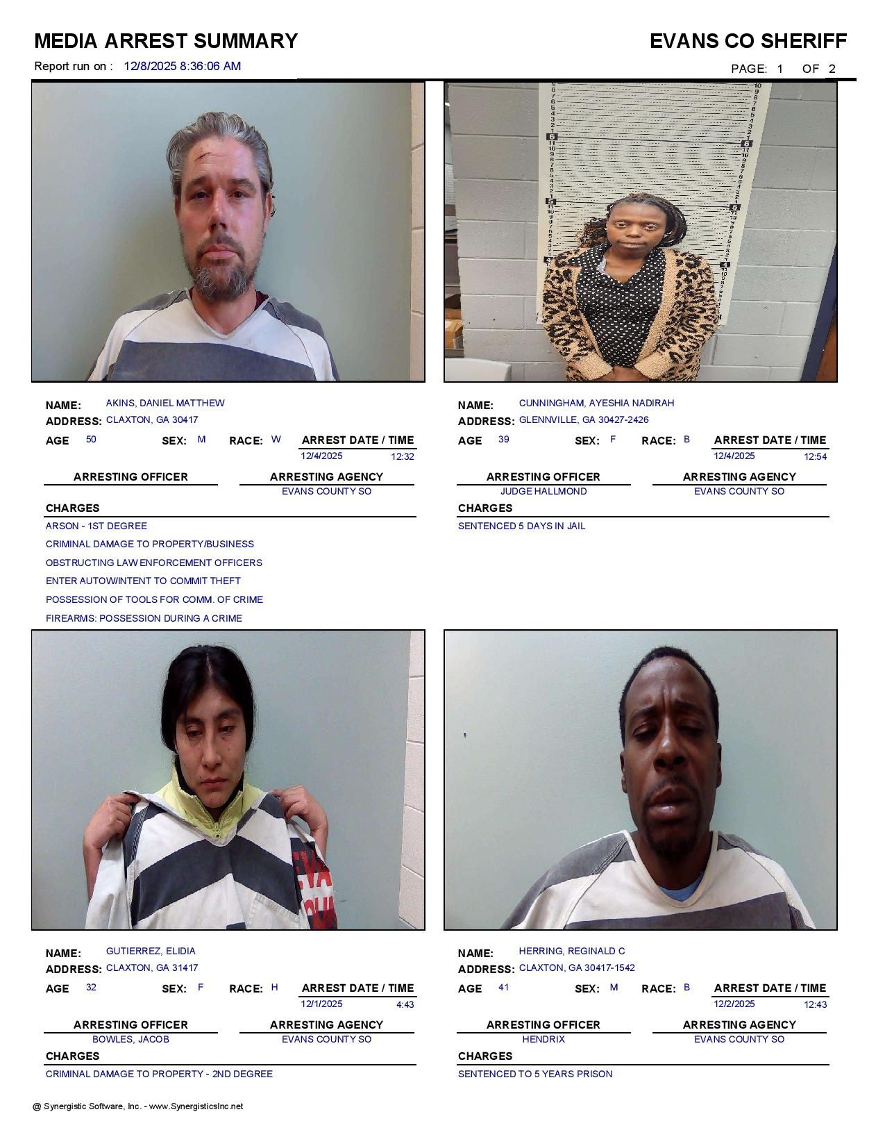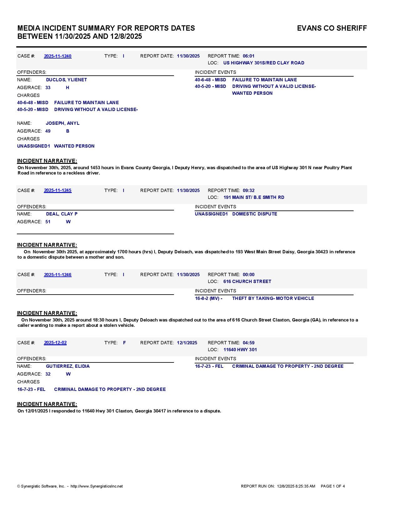 The Evans Co Jail Booking & Incident Report 12/08/25 details arrests from Evans Co., Claxton, Bellville, Hagan, and the Georgia State Patrol. Incident reports are from the Sheriff’s Office only.