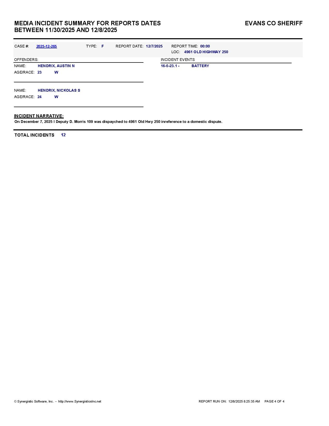 Images from the Evans Co Jail Booking & Incident Report for 12/08/25: