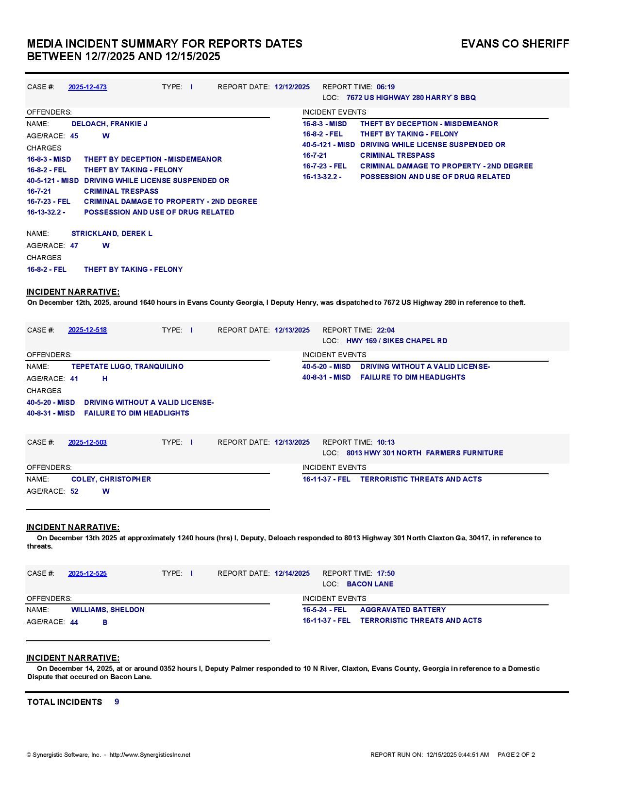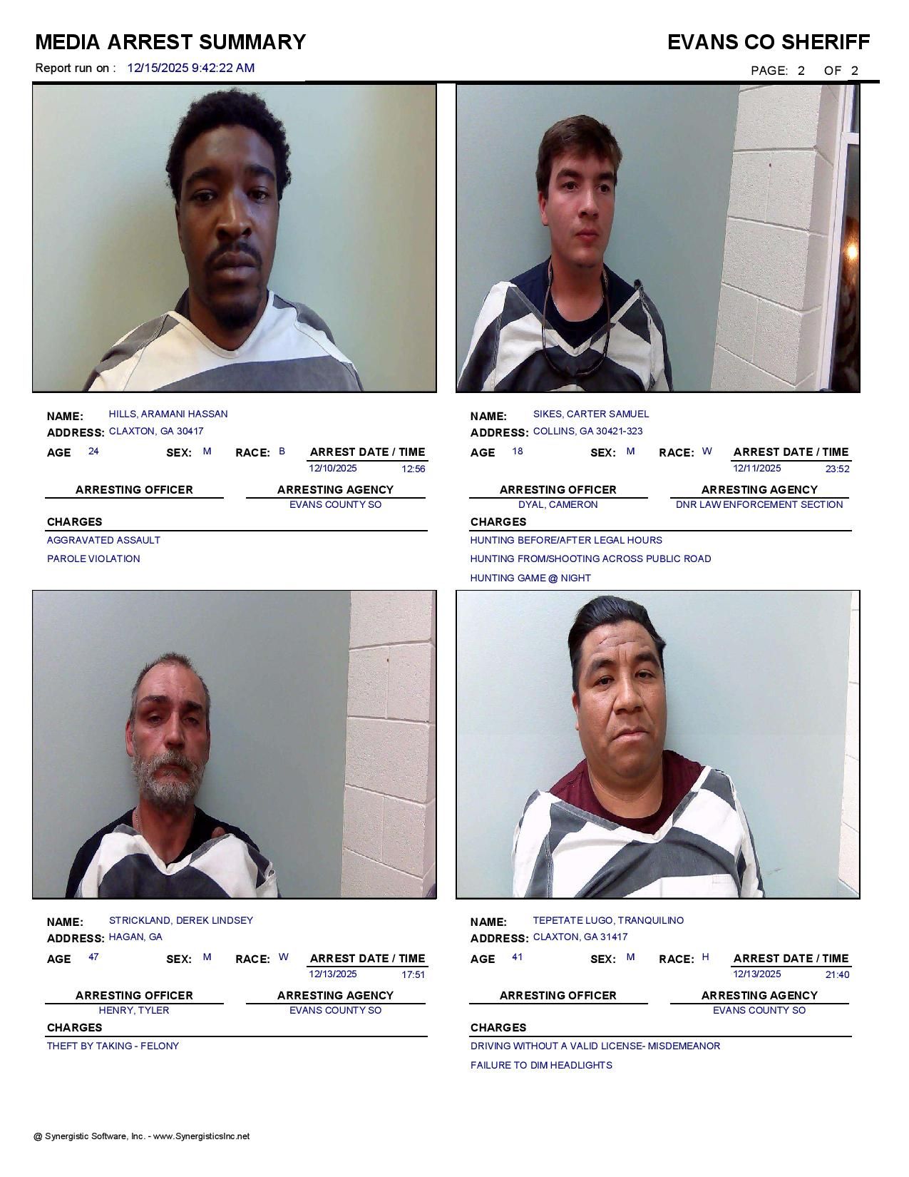 The Evans Co Jail Booking & Incident Report 12/15/25 details arrests from Evans Co., Claxton, Bellville, Hagan, and the Georgia State Patrol. Incident reports are from the Sheriff’s Office only.