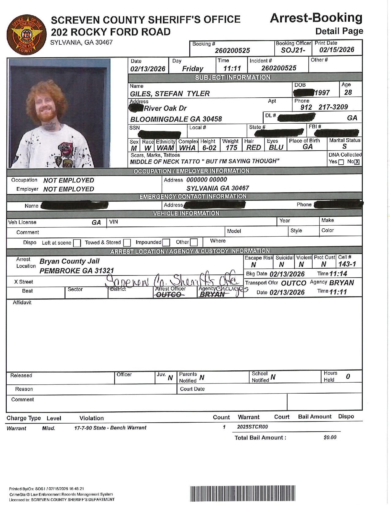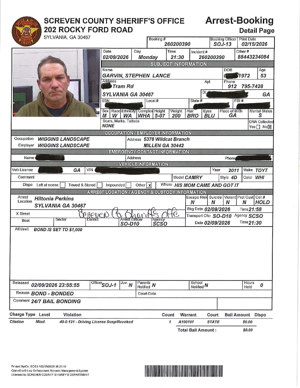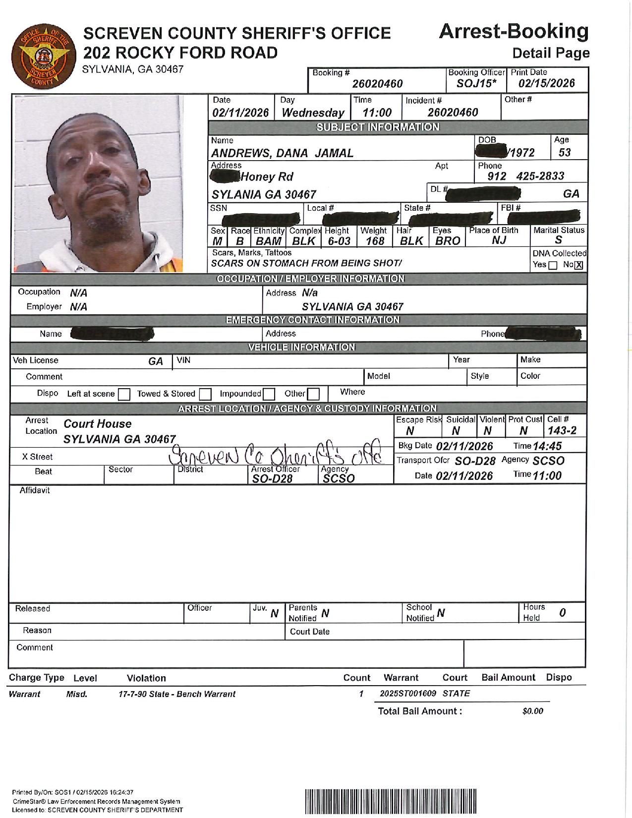 The Screven Co Jail Booking & Incident Report 02/16/26 details arrests from Screven County, area municipalities, the Georgia State Patrol, and any inmates which may be housed for neighboring agencies. Incident reports are from the Sheriff’s Office only.