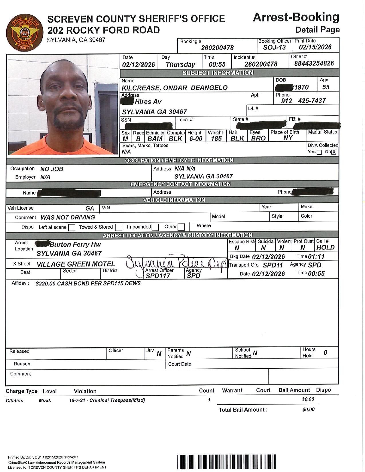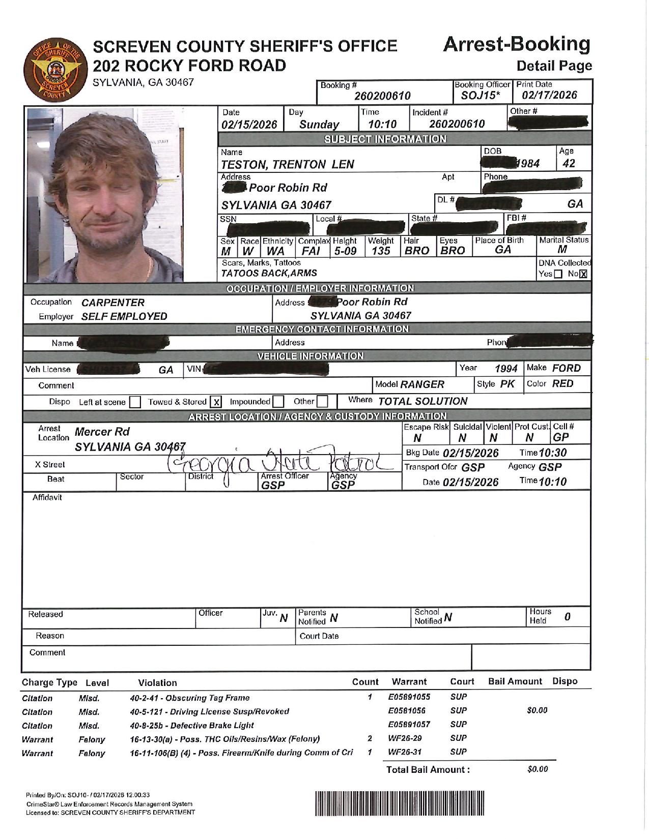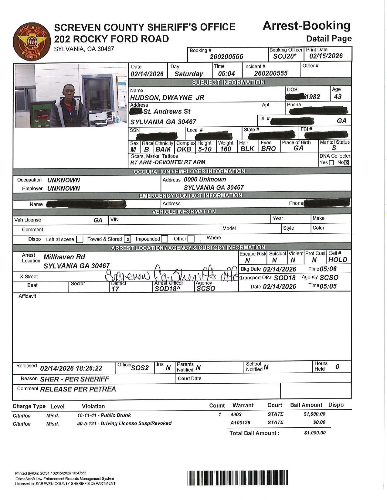 The Screven Co Jail Booking & Incident Report 02/16/26 details arrests from Screven County, area municipalities, the Georgia State Patrol, and any inmates which may be housed for neighboring agencies. Incident reports are from the Sheriff’s Office only.