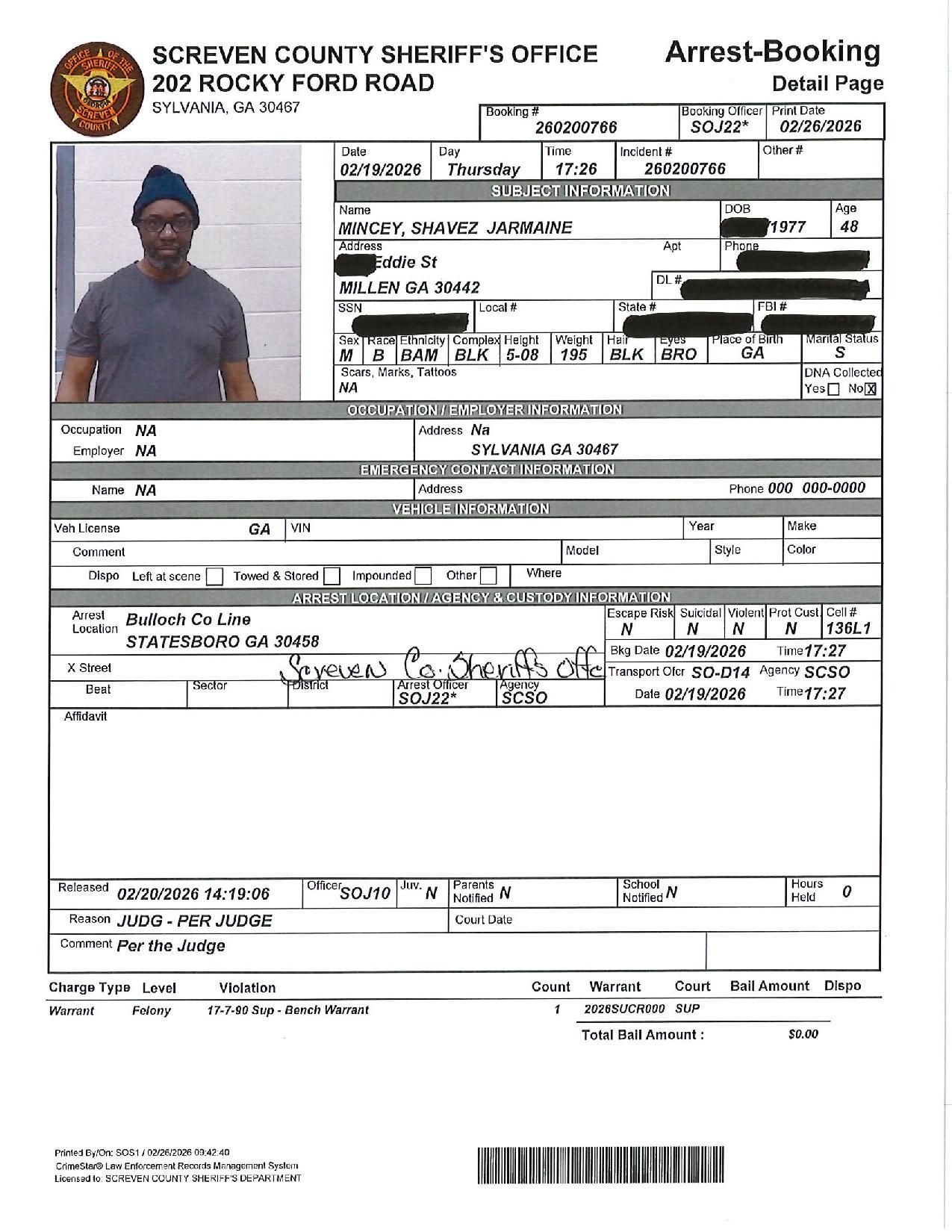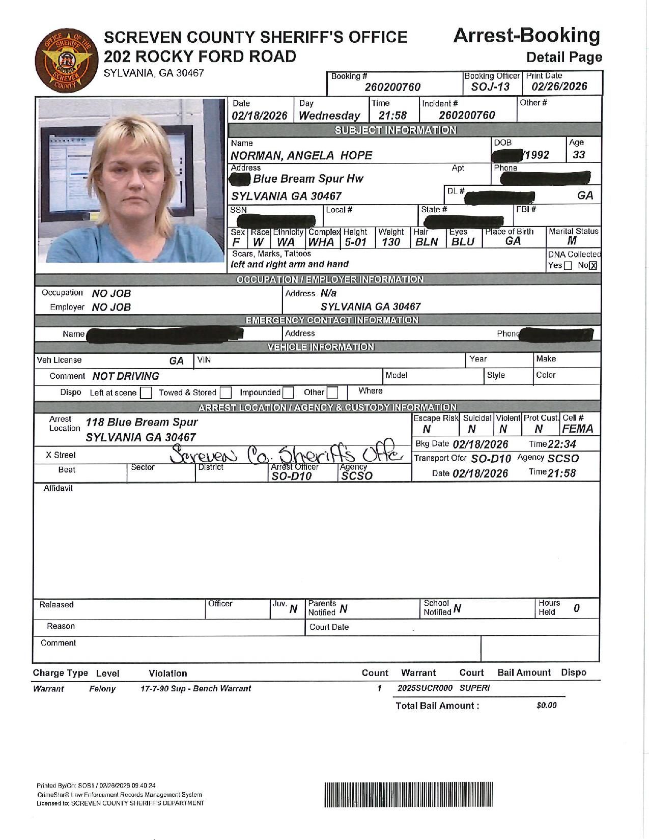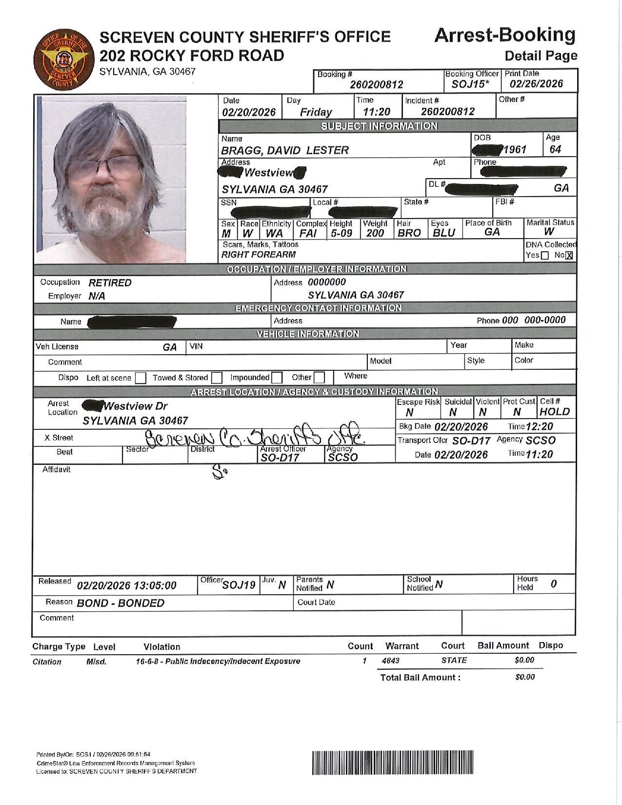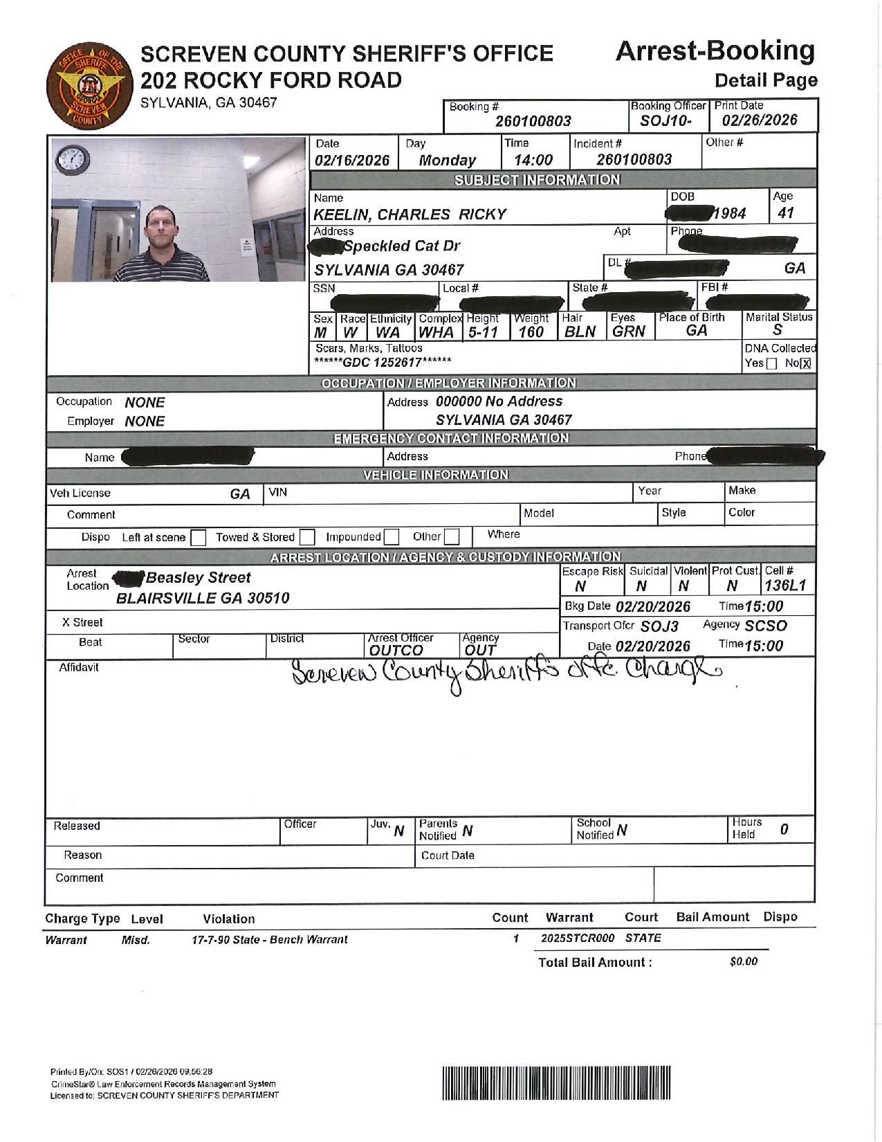 The Screven Co Jail Booking & Incident Report 02/23/26 details arrests from Screven County, area municipalities, the Georgia State Patrol, and any inmates which may be housed for neighboring agencies. Incident reports are from the Sheriff’s Office only.