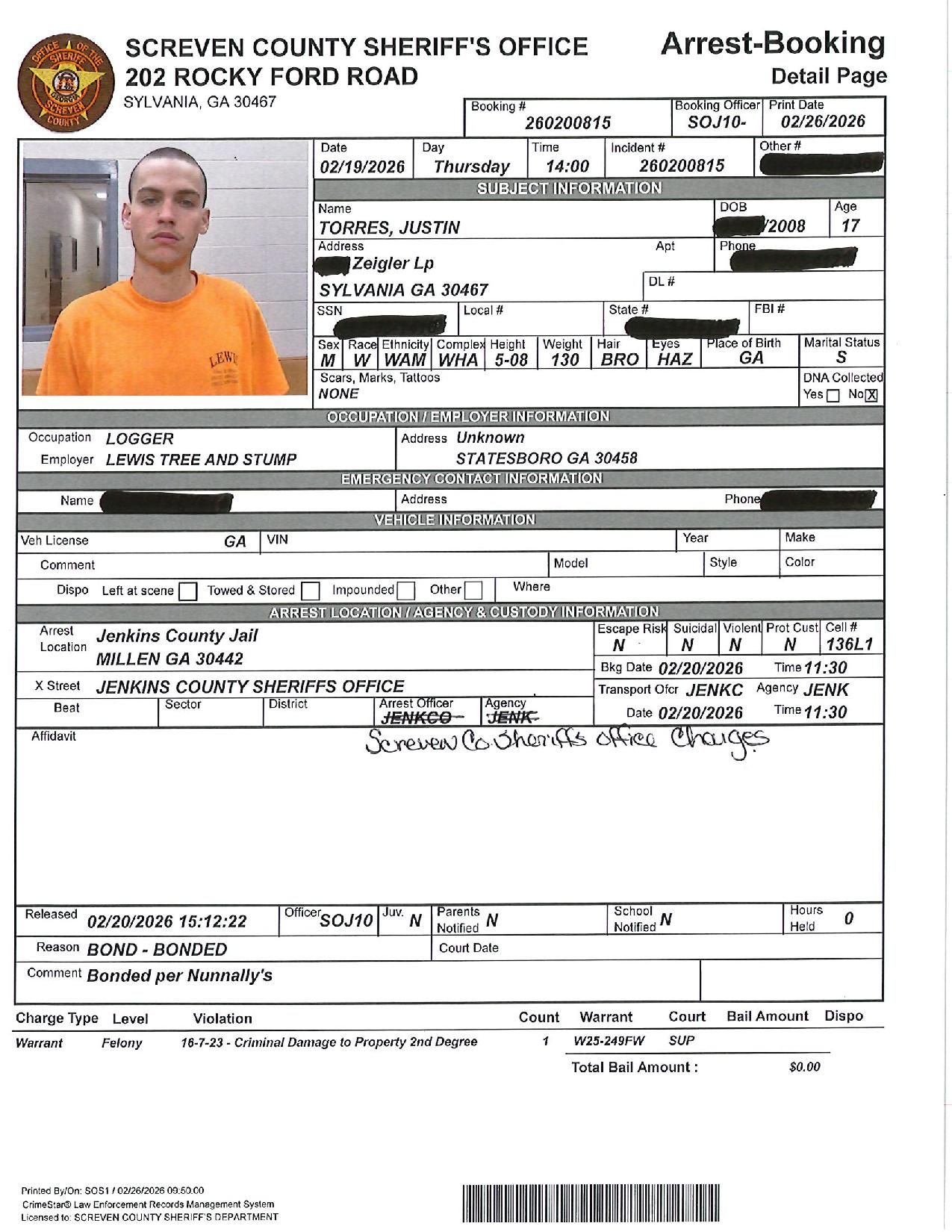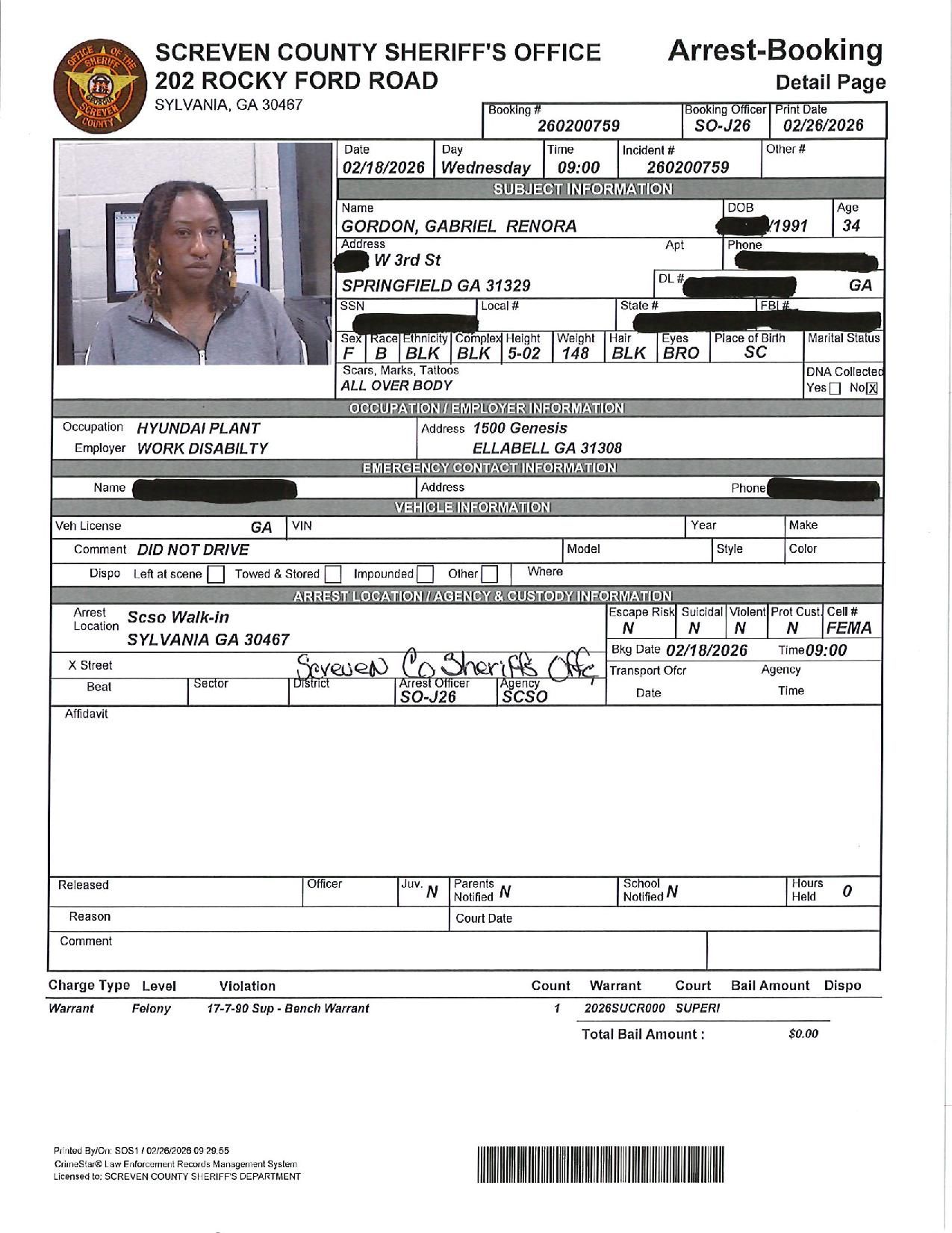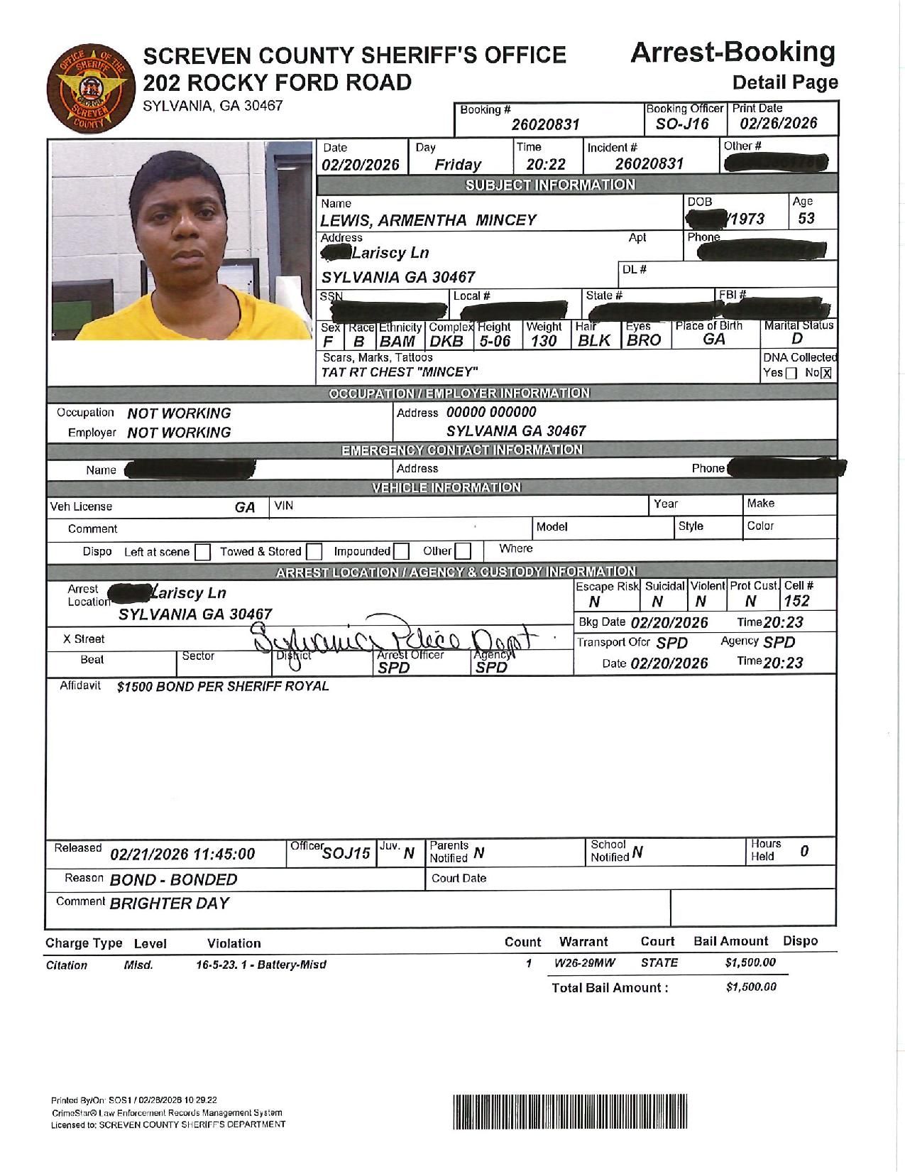 The Screven Co Jail Booking & Incident Report 02/23/26 details arrests from Screven County, area municipalities, the Georgia State Patrol, and any inmates which may be housed for neighboring agencies. Incident reports are from the Sheriff’s Office only.