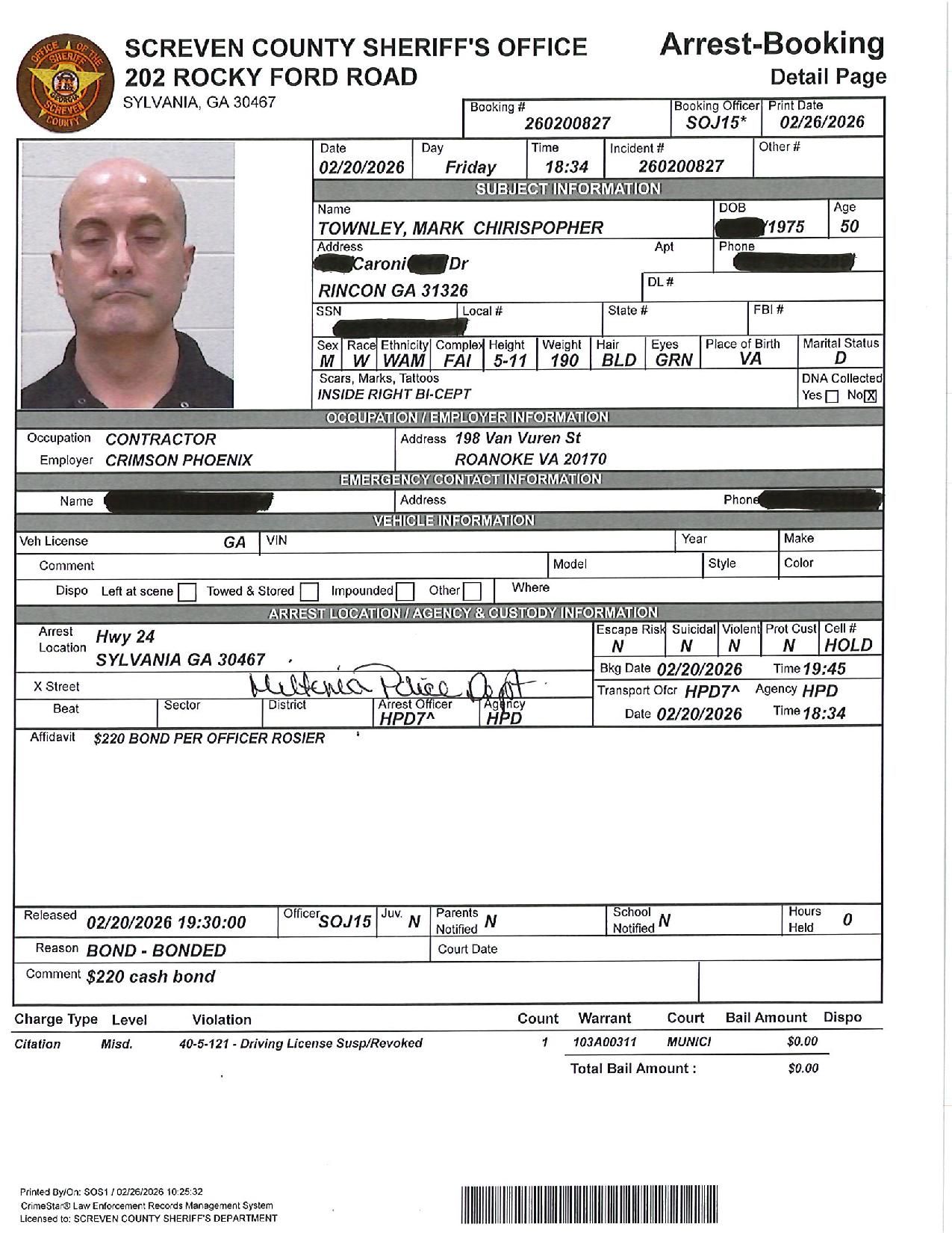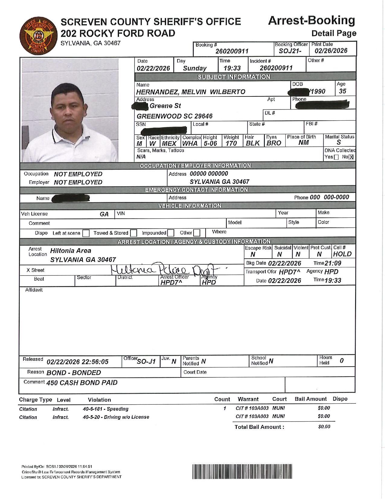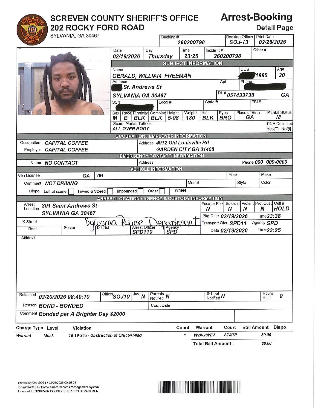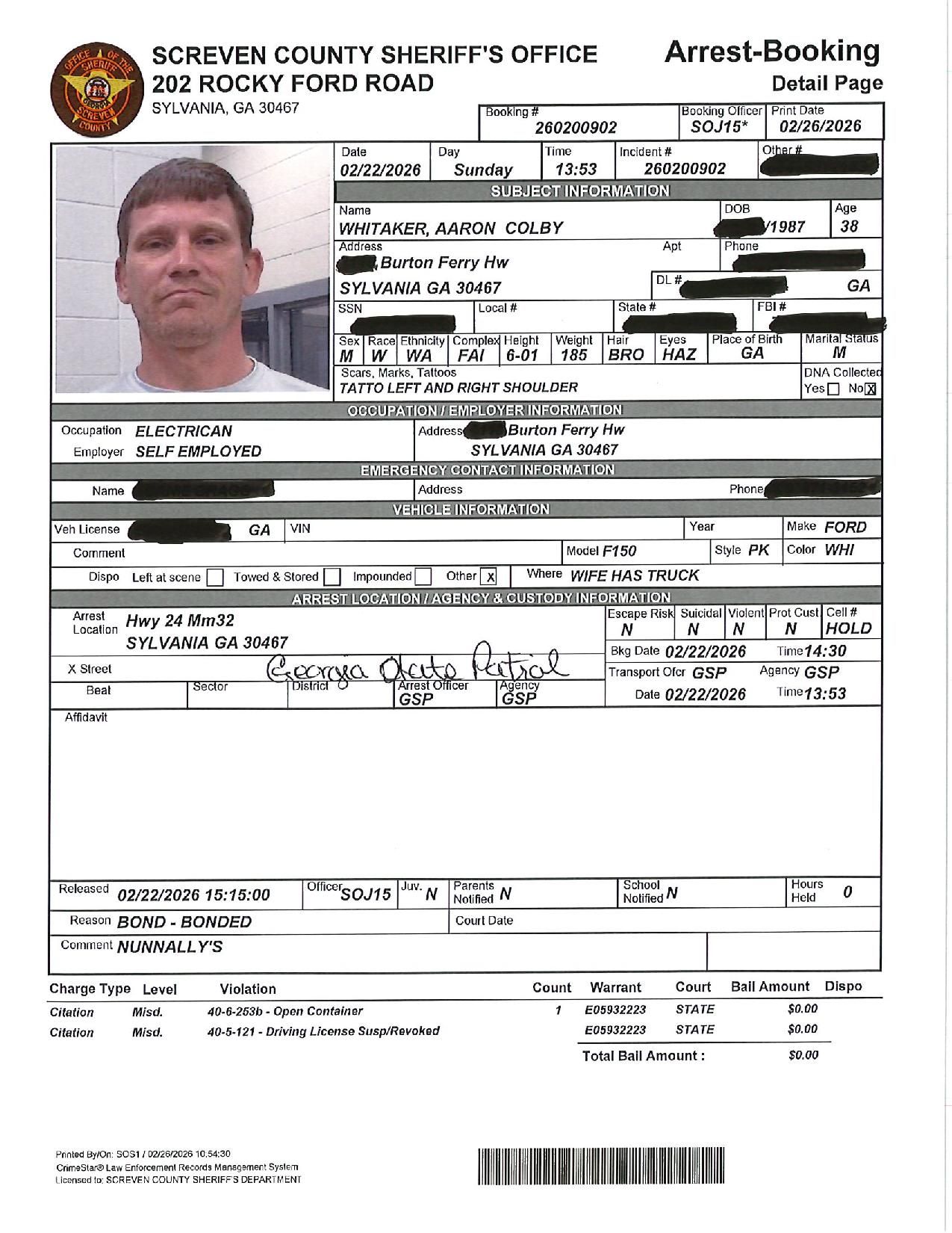 The Screven Co Jail Booking & Incident Report 02/23/26 details arrests from Screven County, area municipalities, the Georgia State Patrol, and any inmates which may be housed for neighboring agencies. Incident reports are from the Sheriff’s Office only.