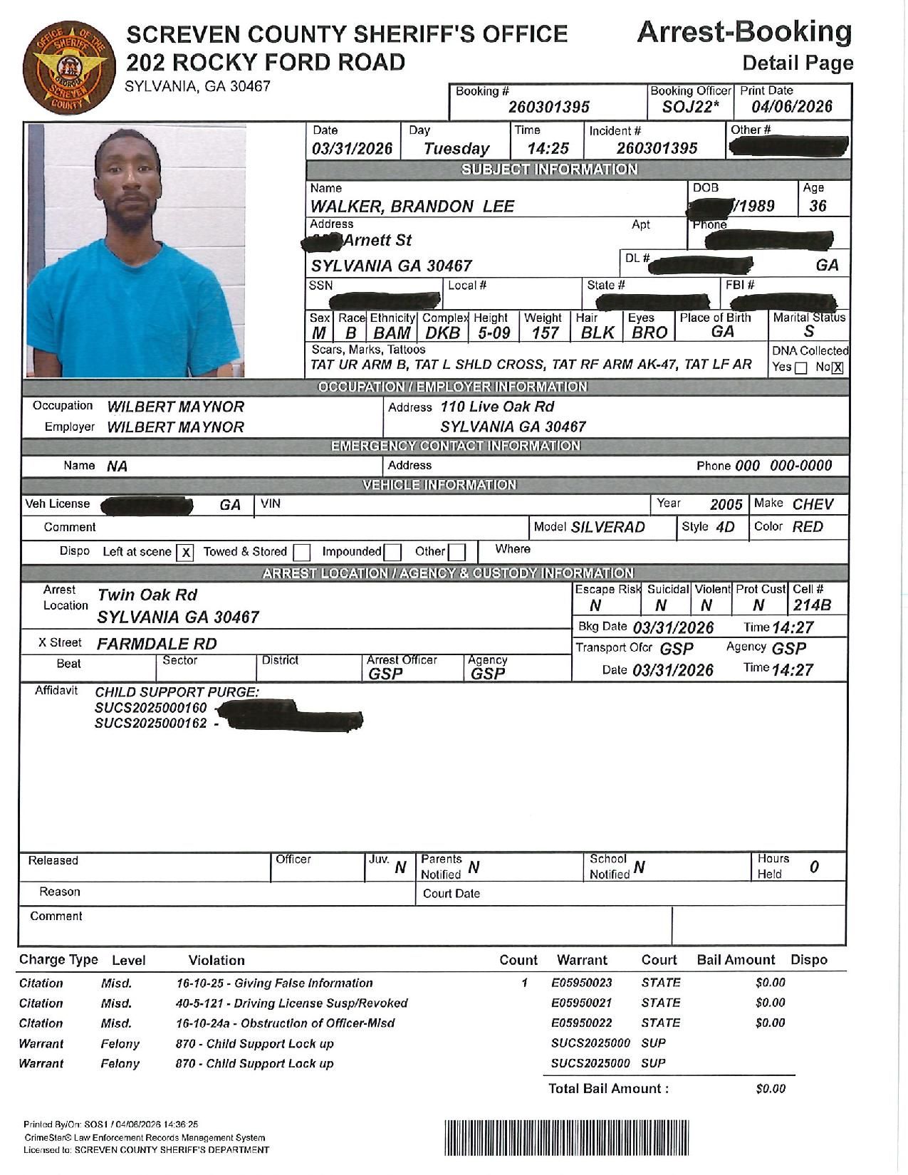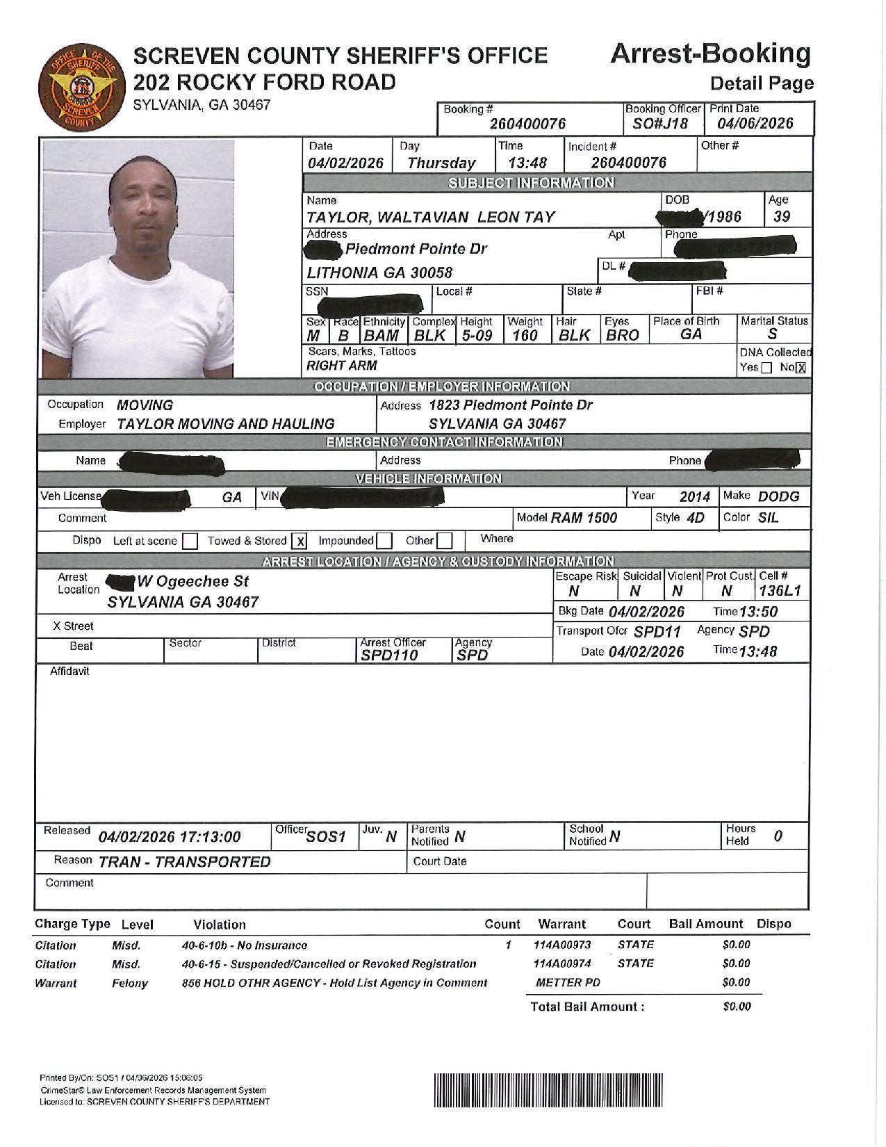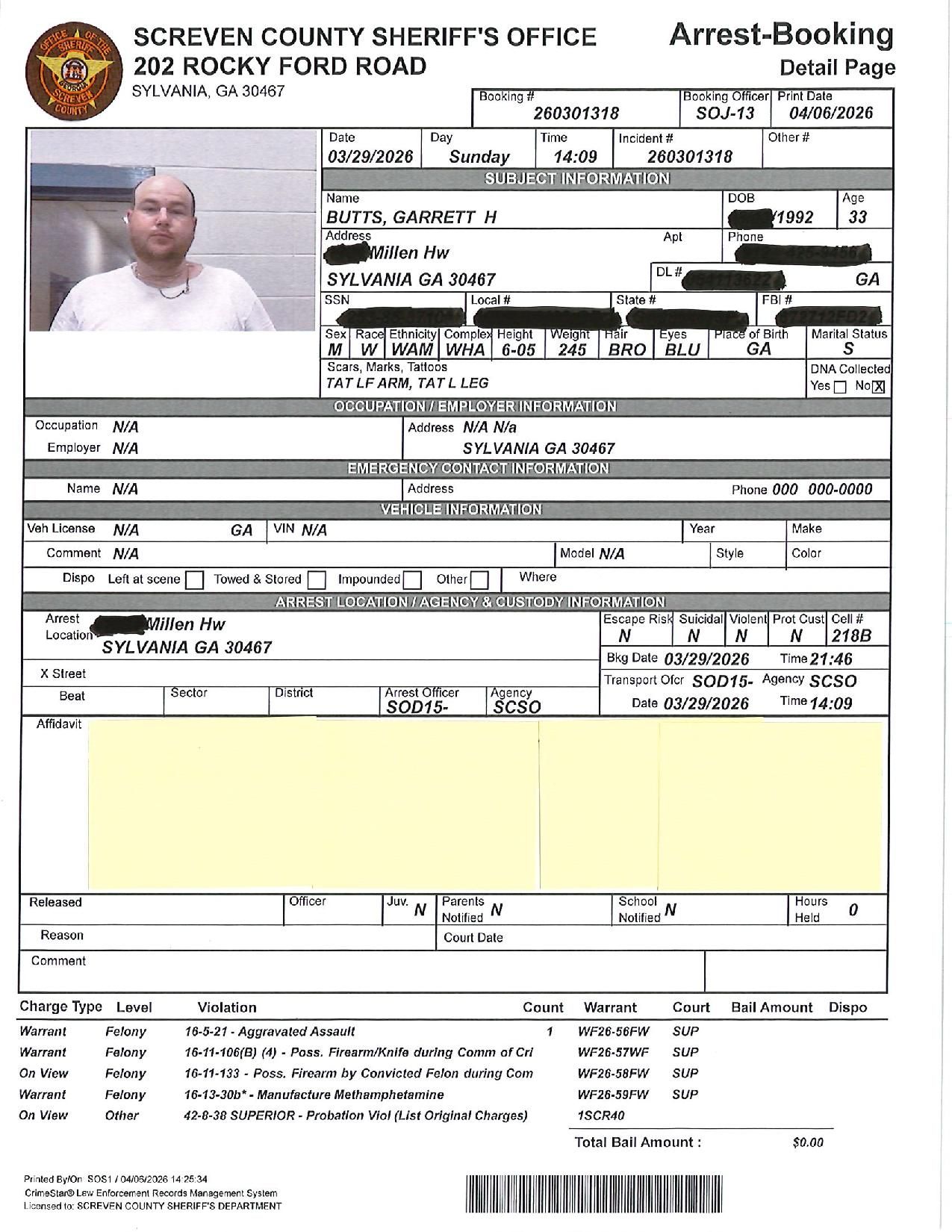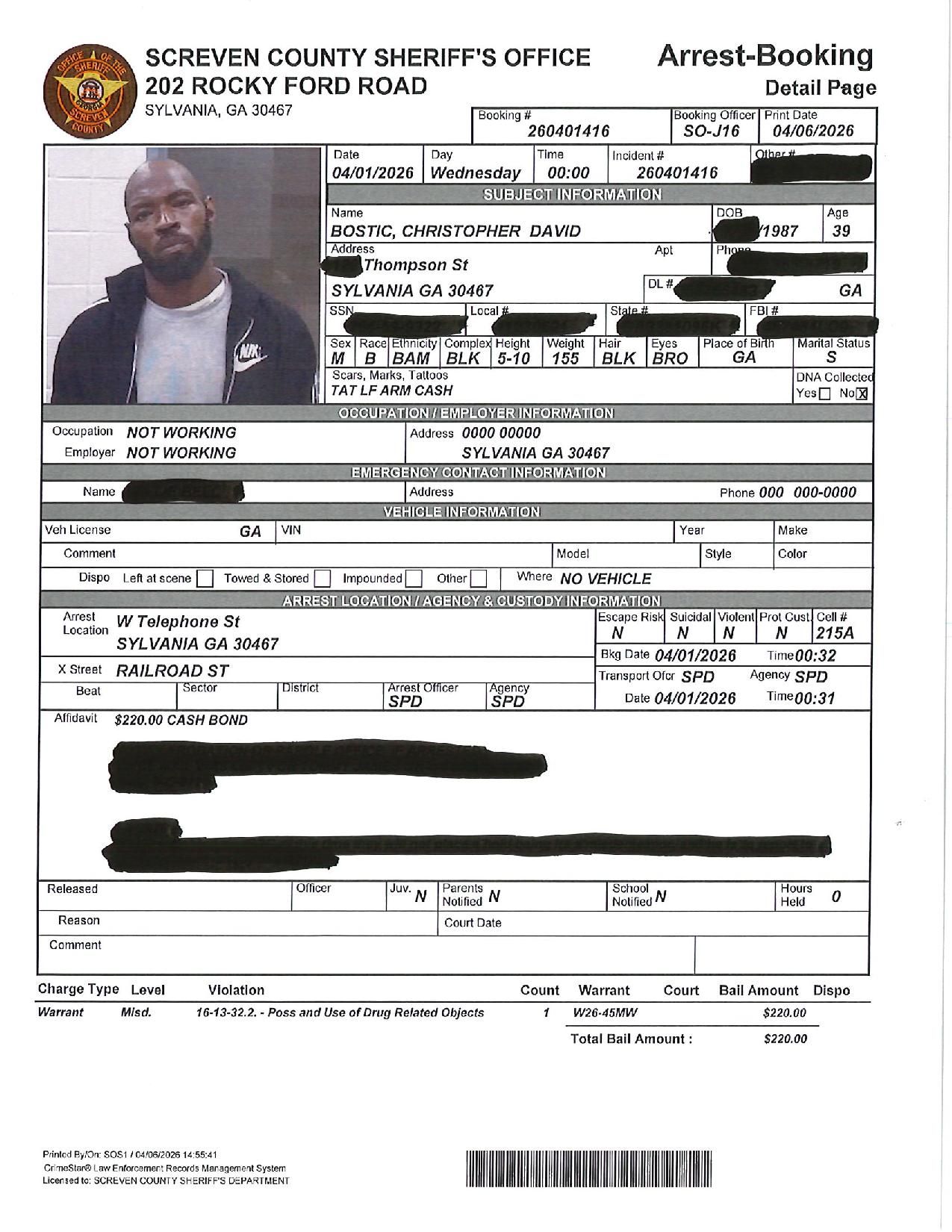 The Screven Co Jail Booking & Incident Report 04/07/26 details arrests from Screven County, area municipalities, the Georgia State Patrol, and any inmates which may be housed for neighboring agencies. Incident reports are from the Sheriff’s Office only.