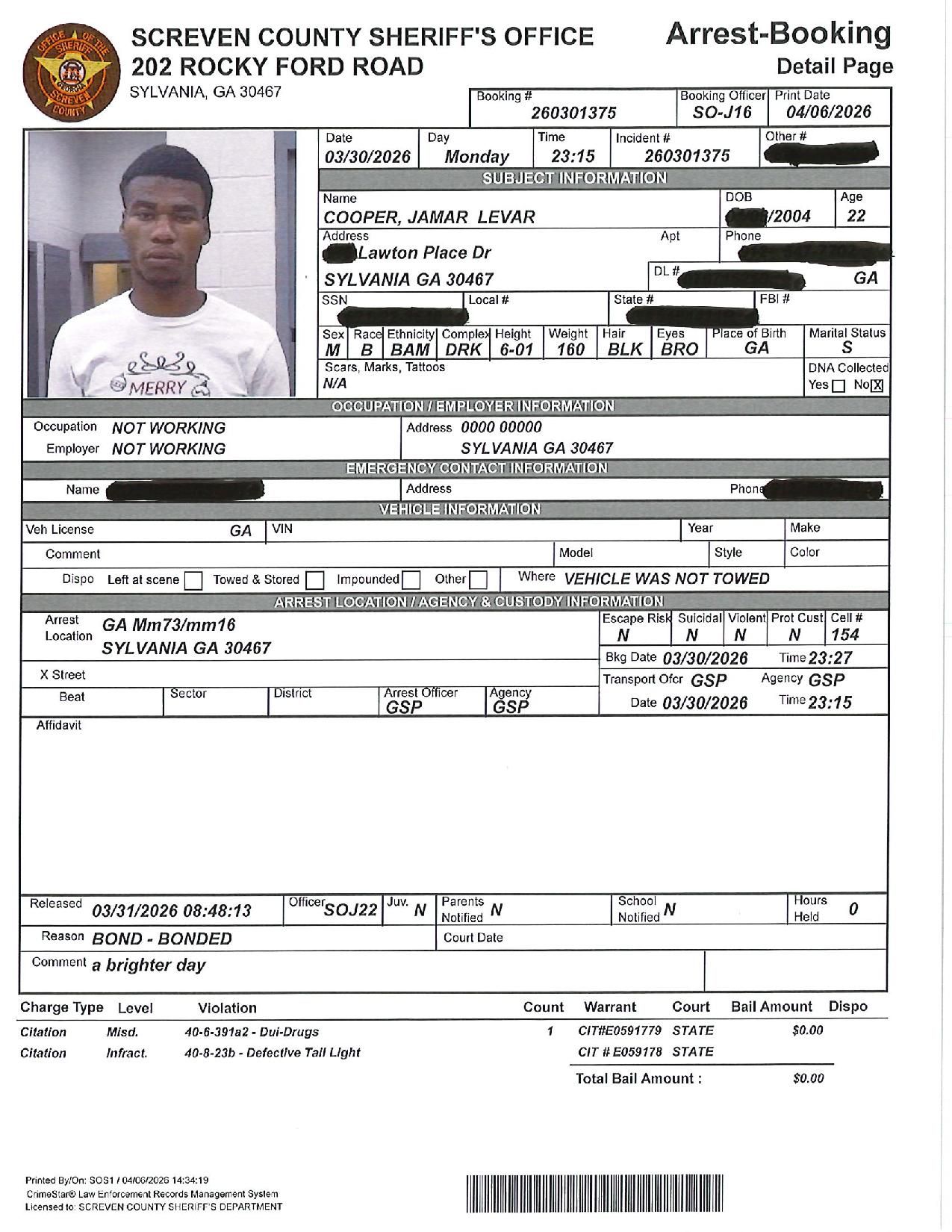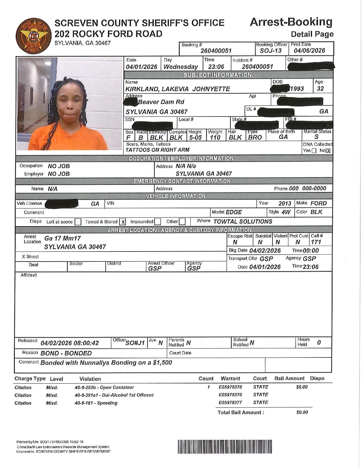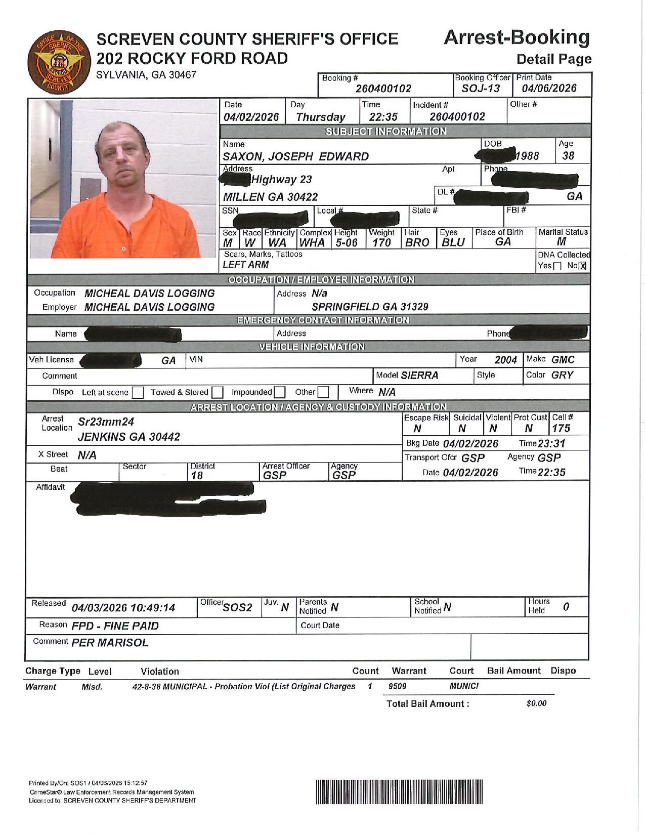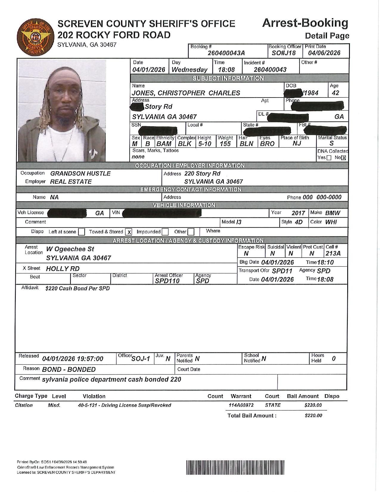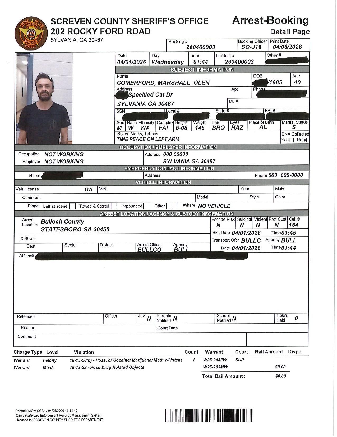 The Screven Co Jail Booking & Incident Report 04/07/26 details arrests from Screven County, area municipalities, the Georgia State Patrol, and any inmates which may be housed for neighboring agencies. Incident reports are from the Sheriff’s Office only.