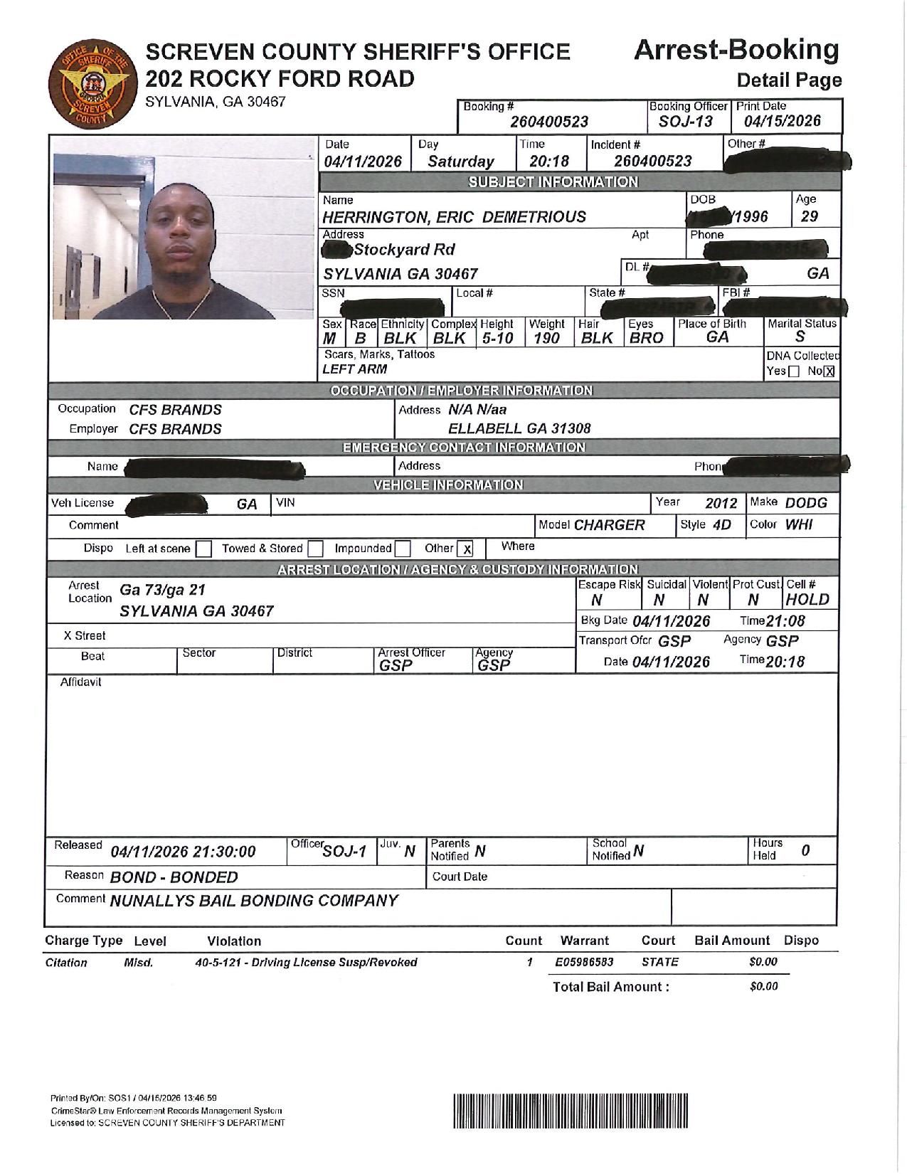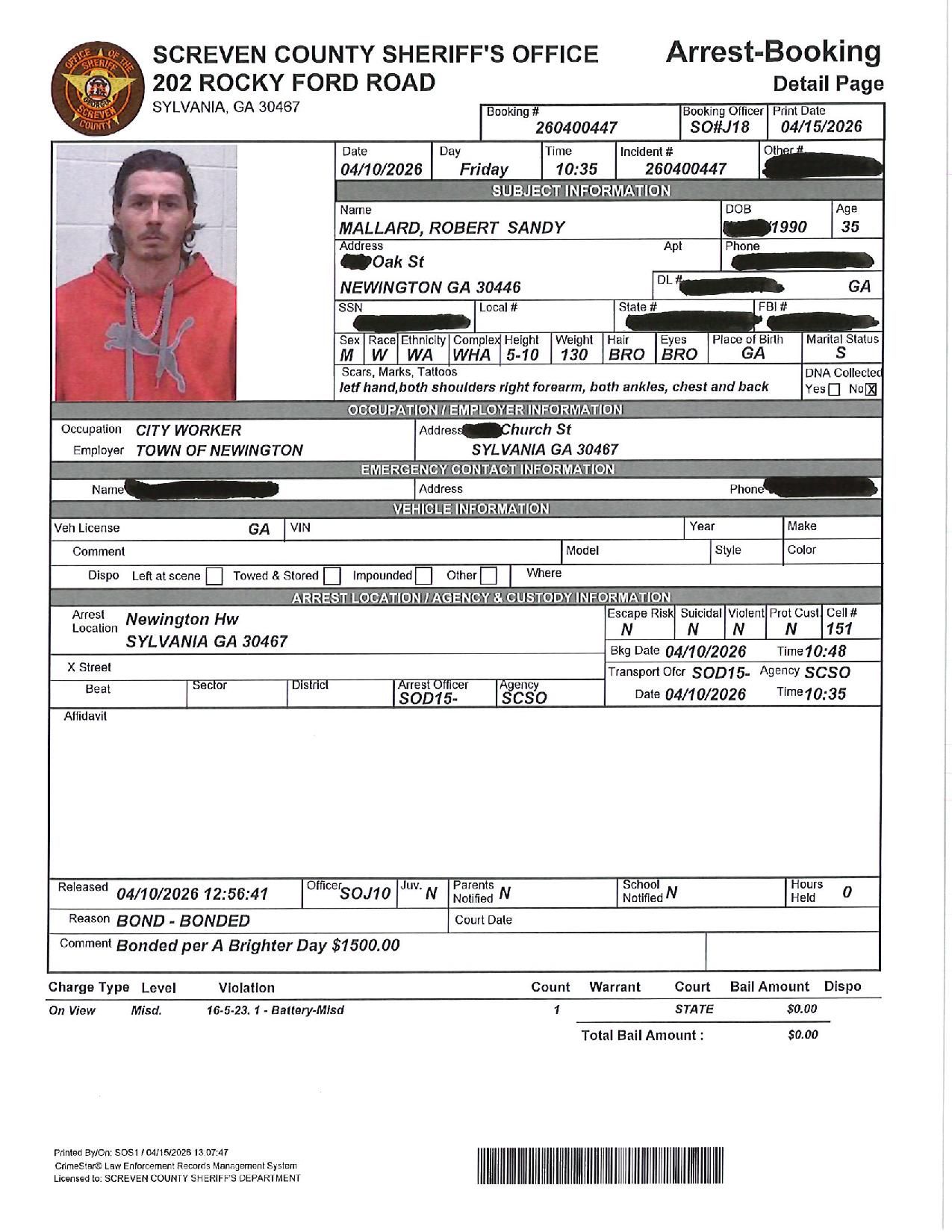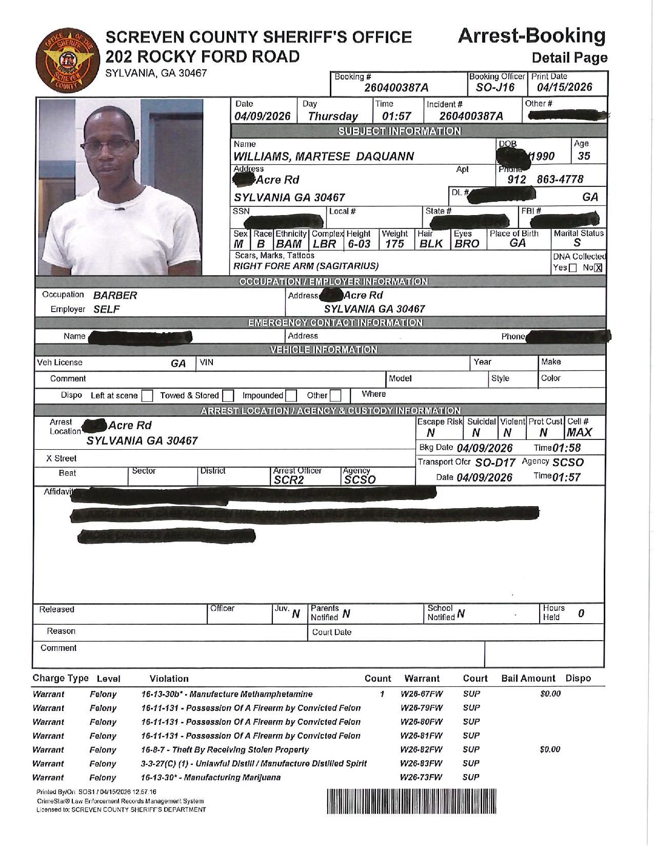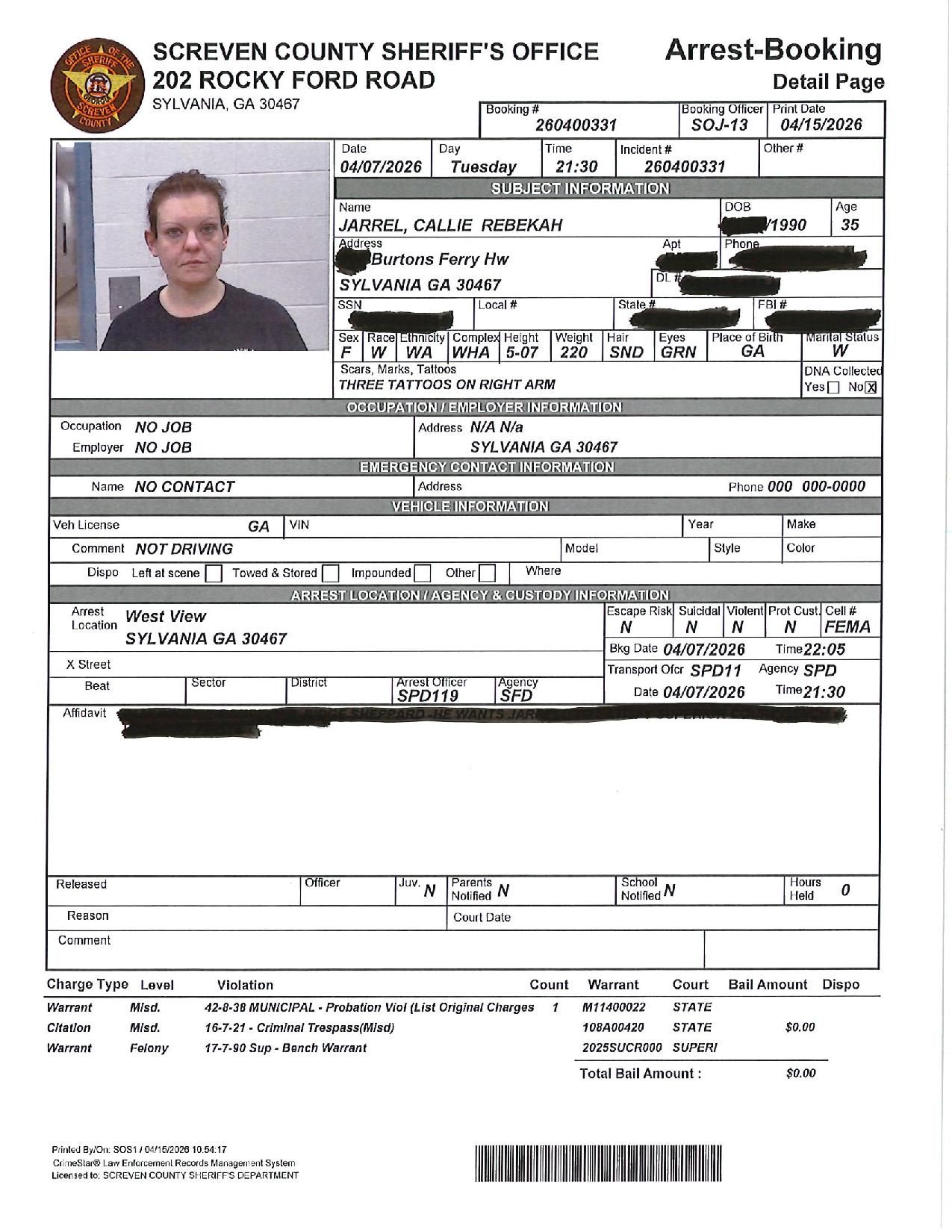 The Screven Co Jail Booking & Incident Report 04/15/26 details arrests from Screven County, area municipalities, the Georgia State Patrol, and any inmates which may be housed for neighboring agencies. Incident reports are from the Sheriff’s Office only.