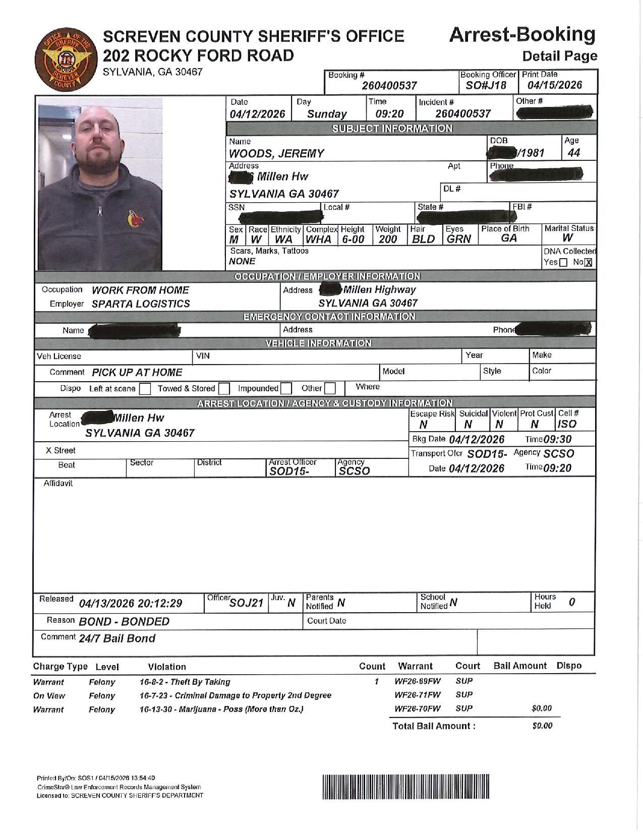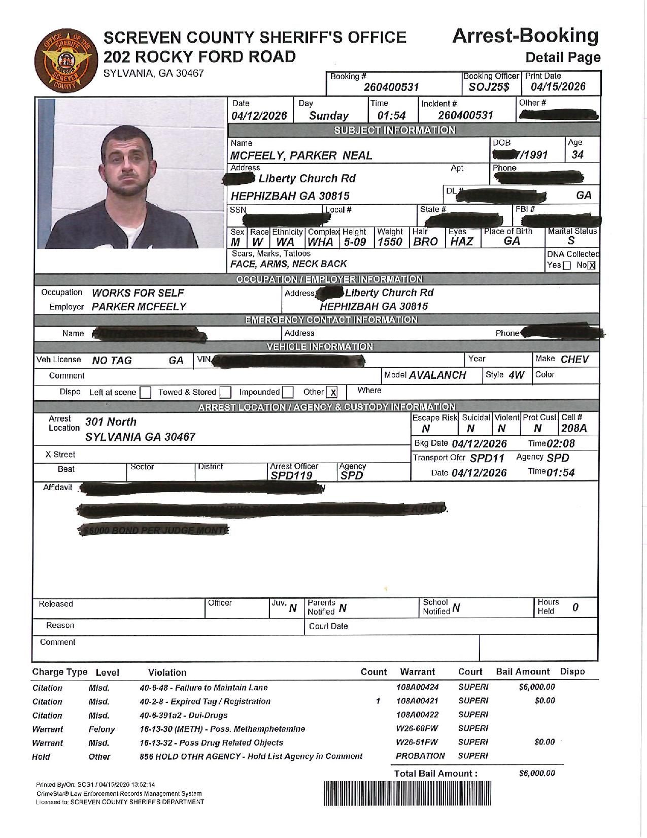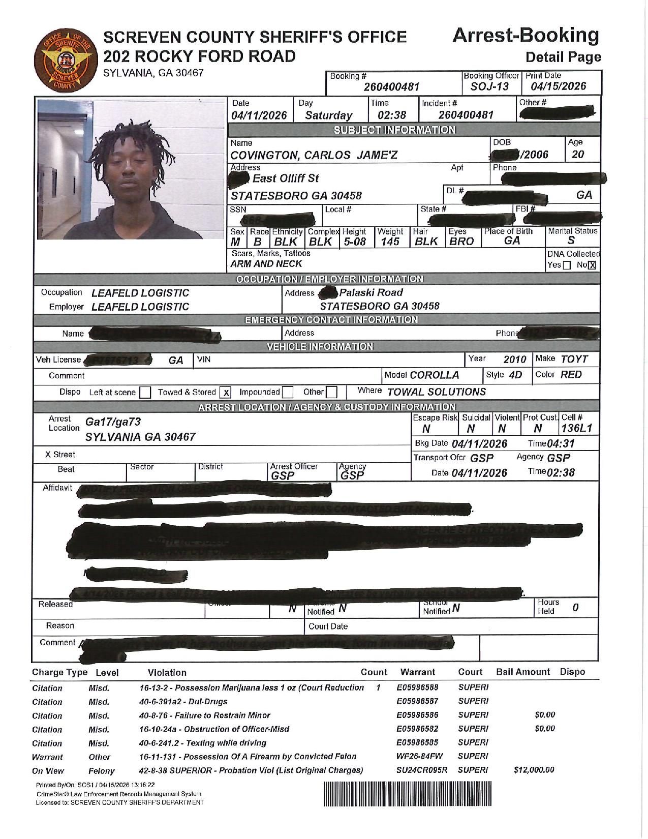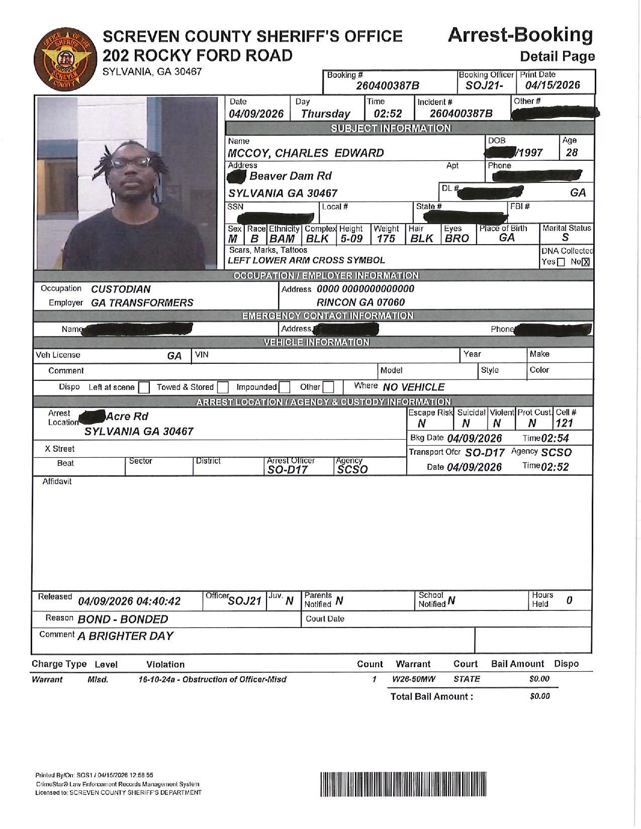 The Screven Co Jail Booking & Incident Report 04/15/26 details arrests from Screven County, area municipalities, the Georgia State Patrol, and any inmates which may be housed for neighboring agencies. Incident reports are from the Sheriff’s Office only.