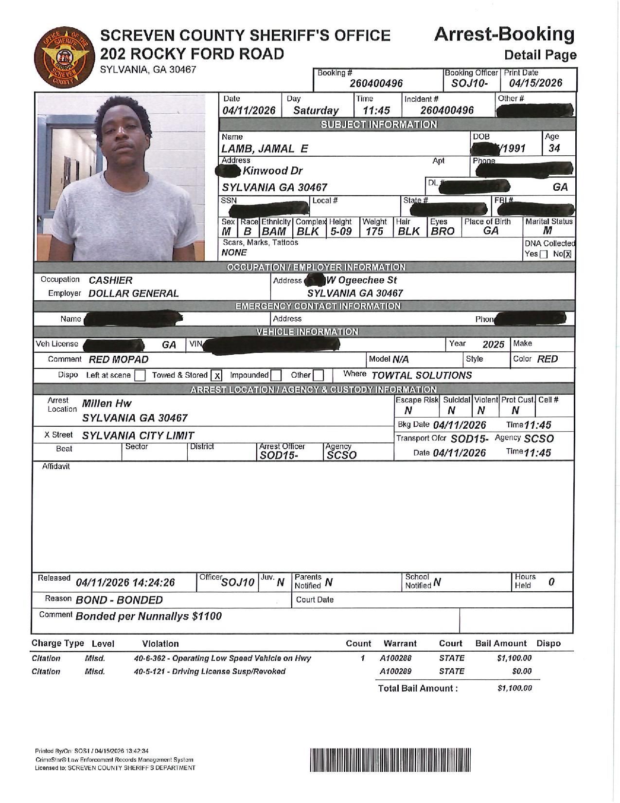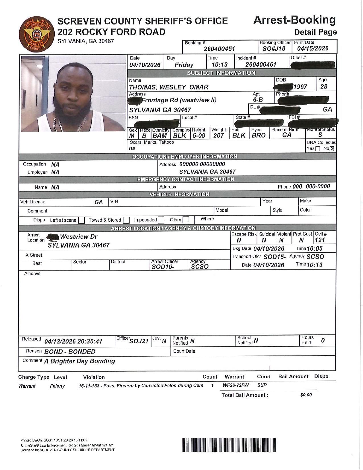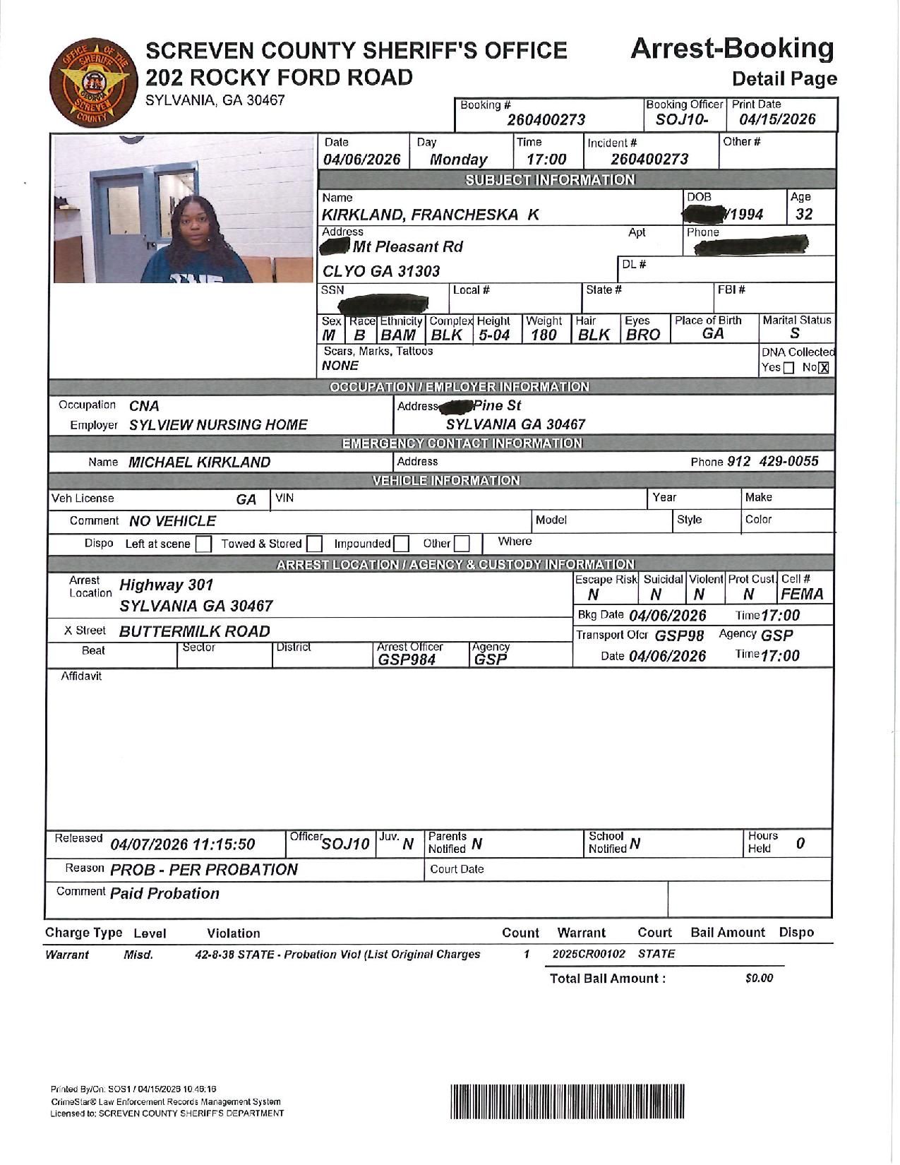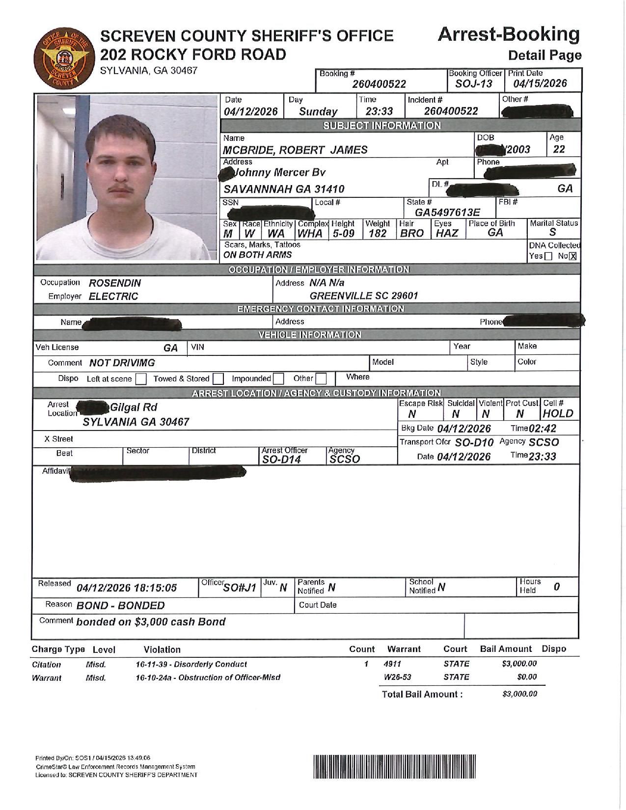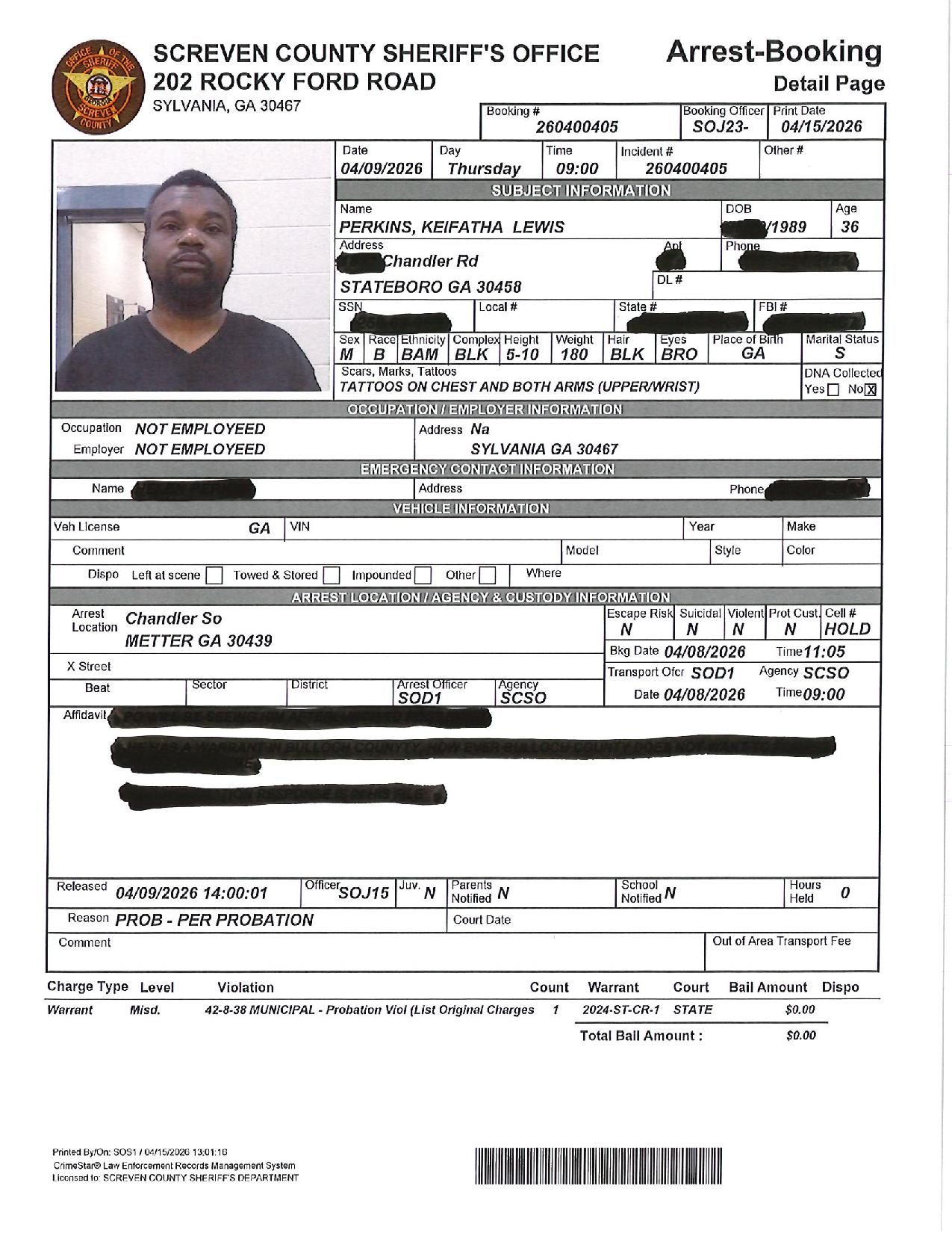 The Screven Co Jail Booking & Incident Report 04/15/26 details arrests from Screven County, area municipalities, the Georgia State Patrol, and any inmates which may be housed for neighboring agencies. Incident reports are from the Sheriff’s Office only.