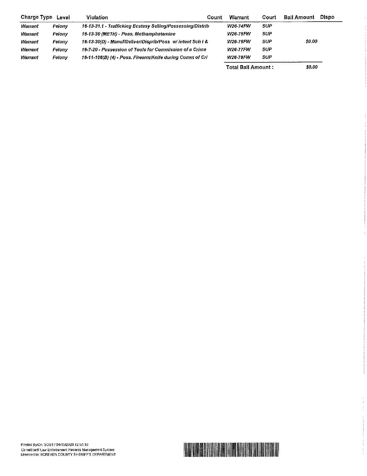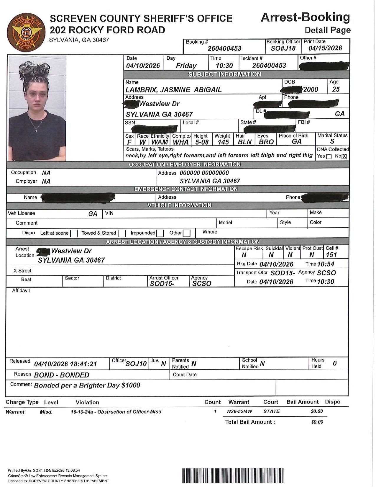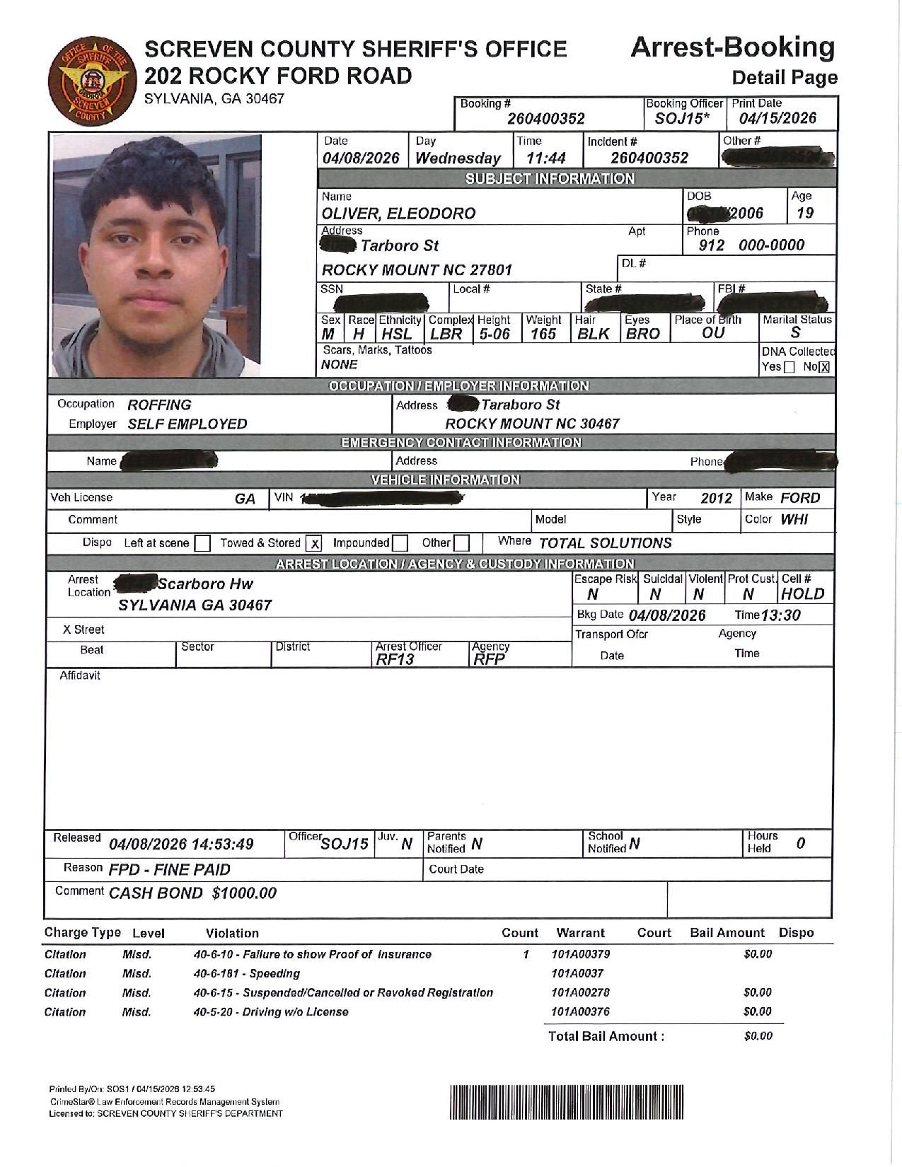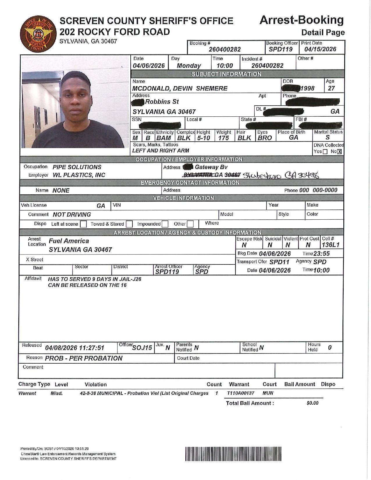 The Screven Co Jail Booking & Incident Report 04/15/26 details arrests from Screven County, area municipalities, the Georgia State Patrol, and any inmates which may be housed for neighboring agencies. Incident reports are from the Sheriff’s Office only.