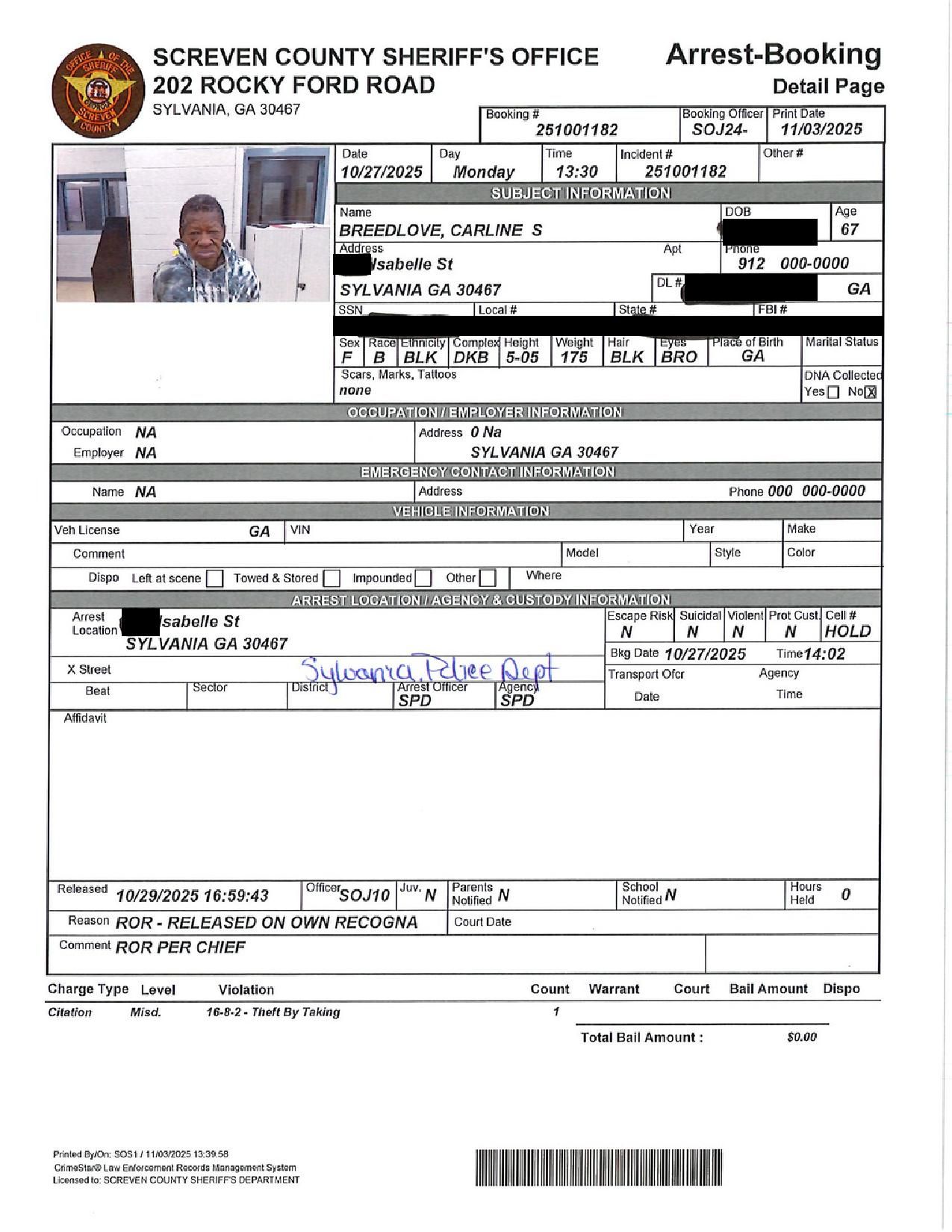 The Screven Co Jail Booking & Incident Report 11/04/25 details arrests from Screven County, area municipalities, the Georgia State Patrol, and any inmates which may be housed for neighboring agencies. Incident reports are from the Sheriff’s Office only.