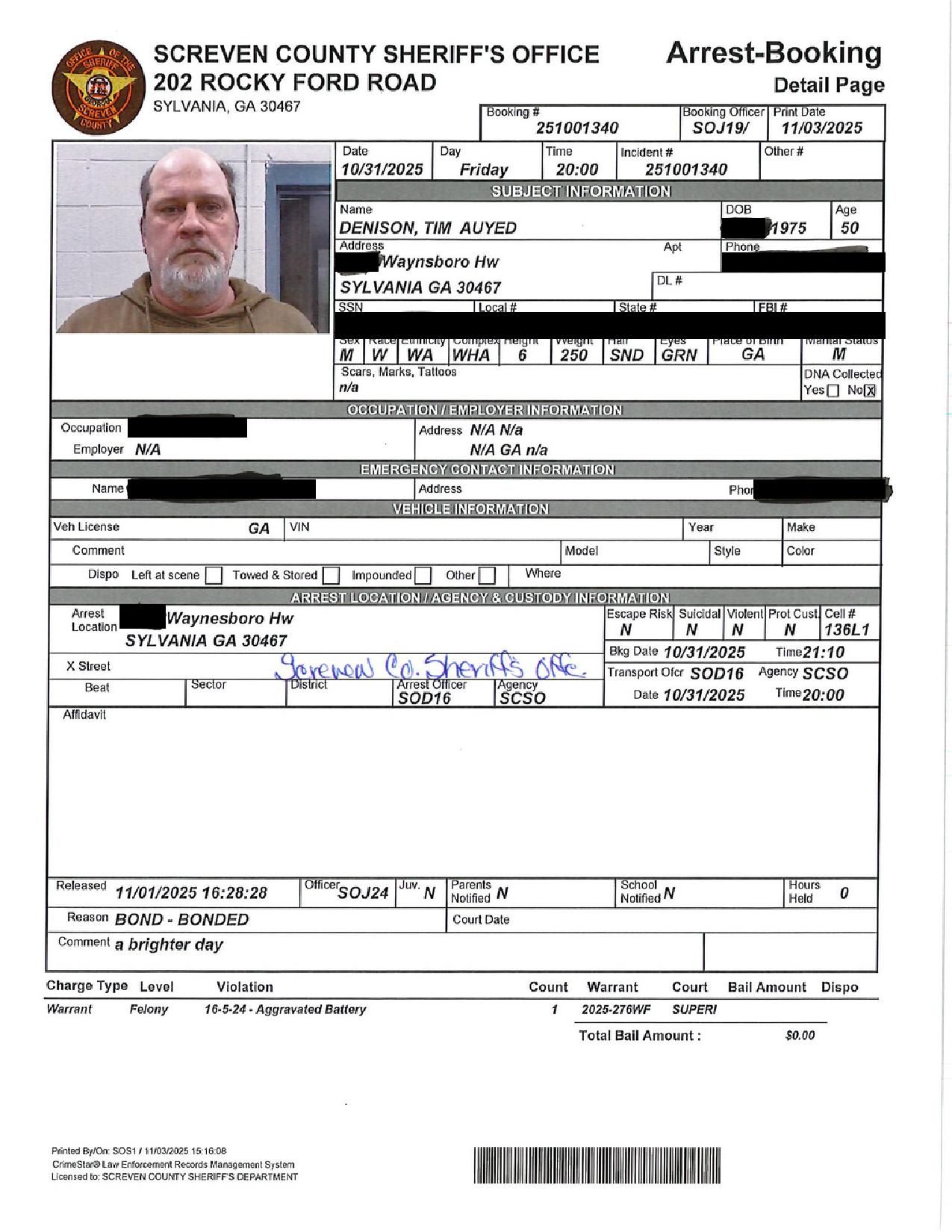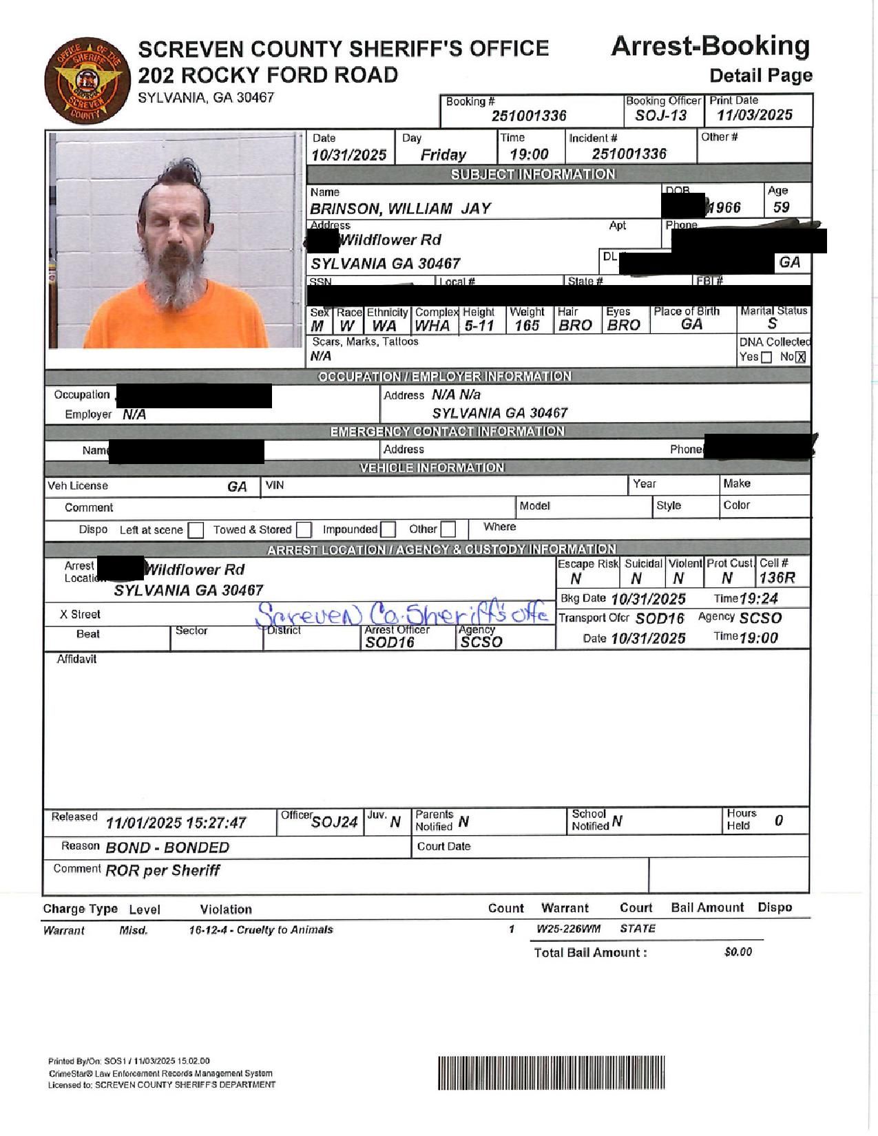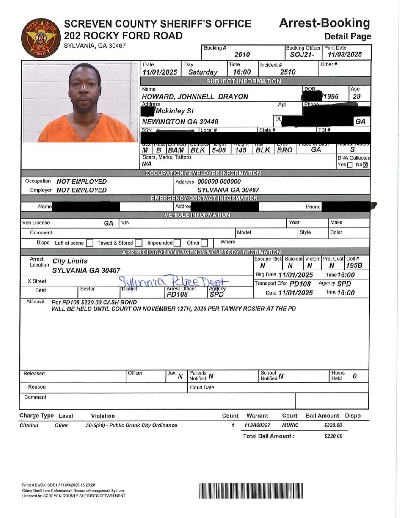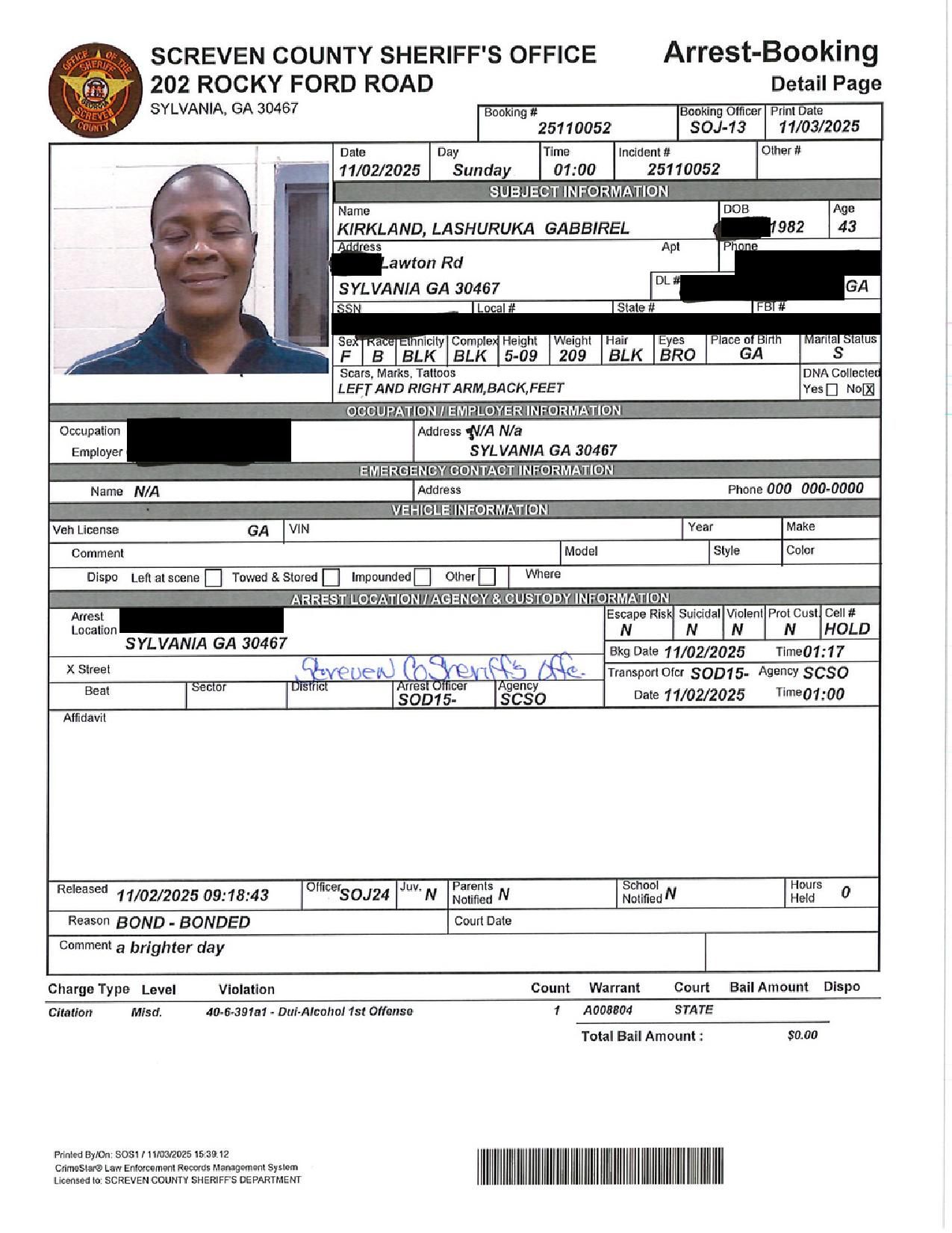 Screven Co. Jail Booking & Incident Report – 11/04/25
