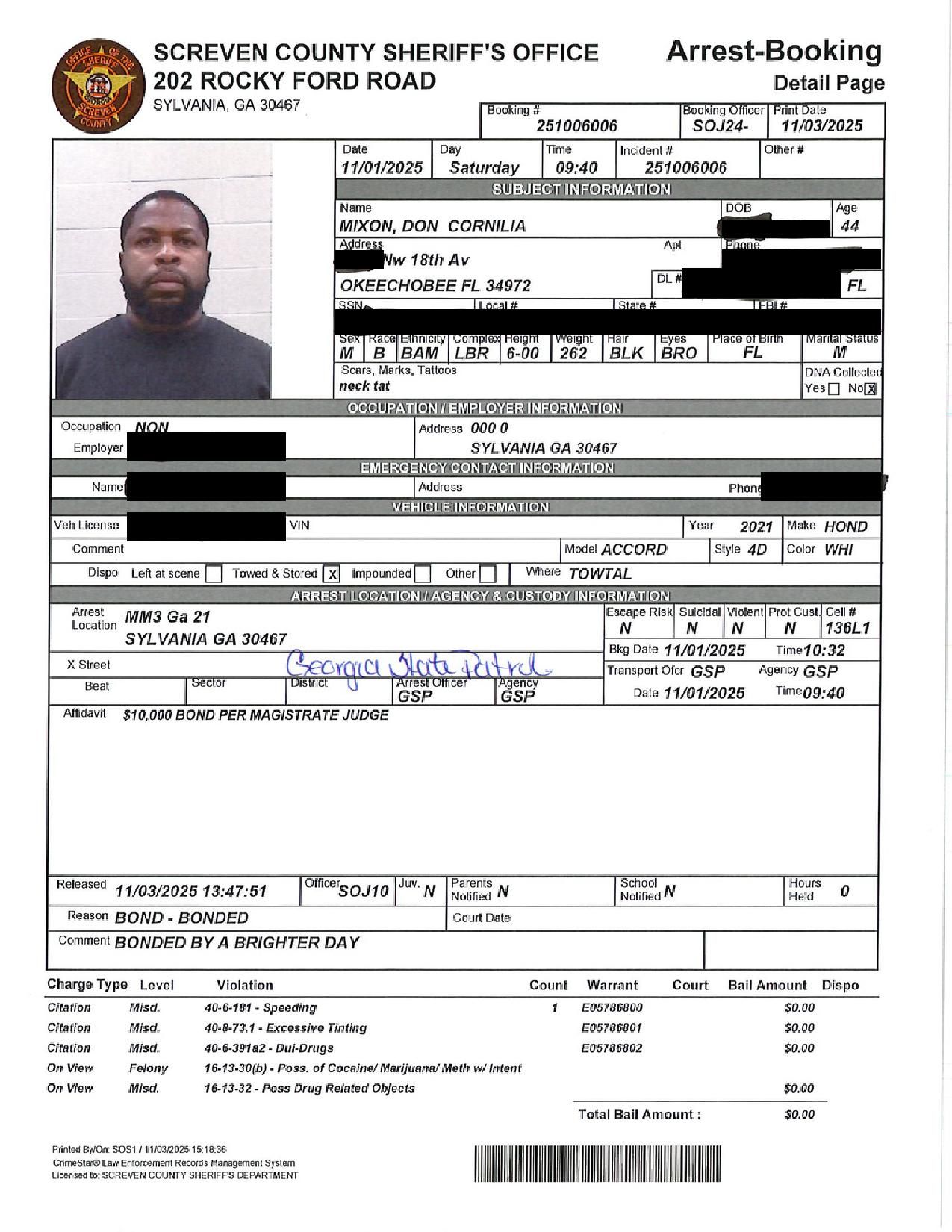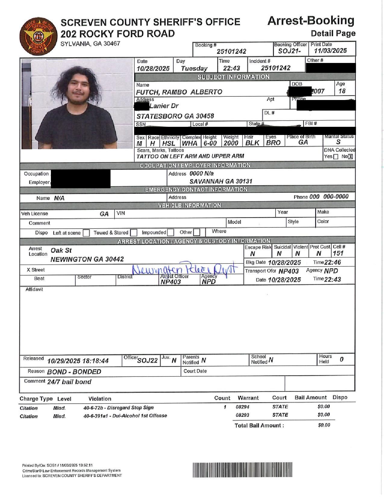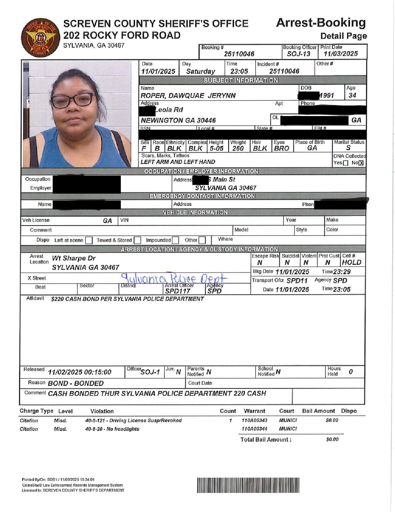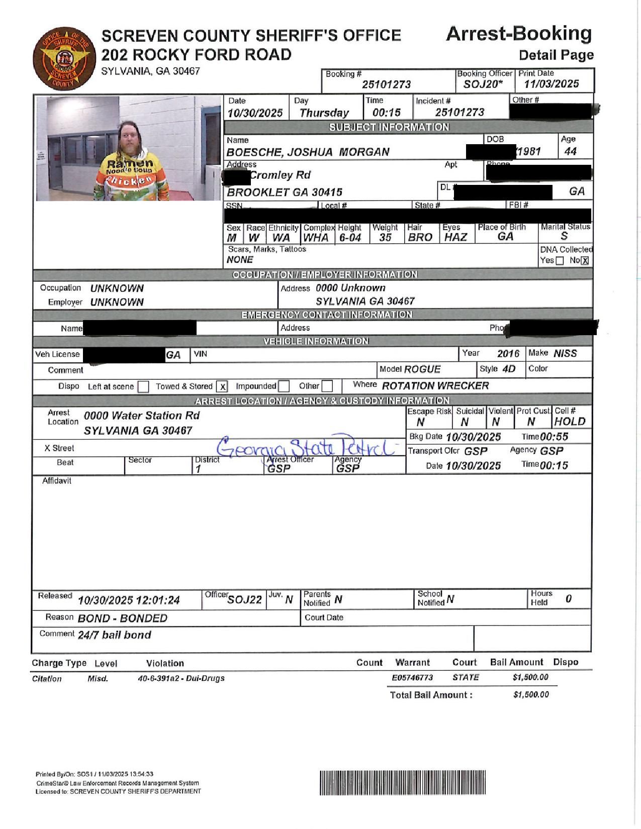 Screven Co. Jail Booking & Incident Report – 11/04/25
